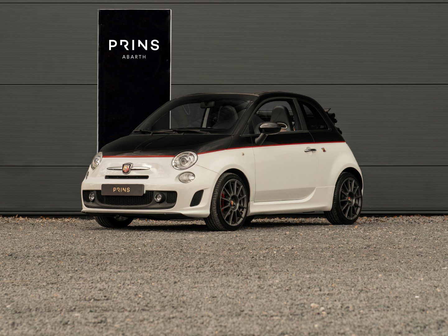 Nu exclusief bij Prins: deze schitterende Abarth 500 C in Bicolore samenstelling, namelijk Bianco en Nero met een rode bies en antraciet velgen.
