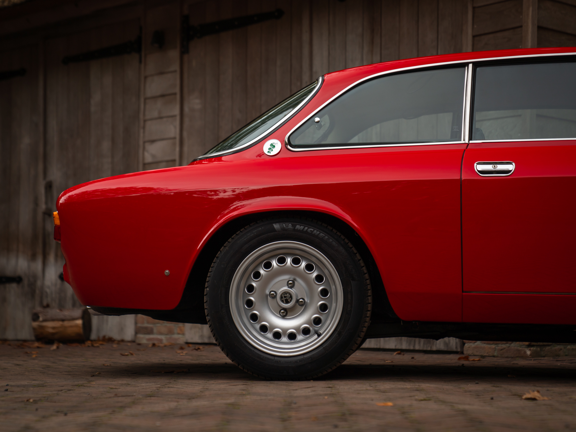 Dat dit specifieke exemplaar is ondergedompeld in een bloedmooie Rosso Alfa bad en bovendien in zeer fraaie staat verkeert, maakt ‘m onweerstaanbaar voor de liefhebbers onder ons. De GTV is te herkennen aan zijn ronde koplampen; 2 stuks per zijde. In geval van de 2000 zijn ze aan elkaar verbonden door middel van een Alfaholics grille die optisch worden doorgetrokken tot en met de Scudetto, pront in het midden. Meer chroom is er in de vorm van de portiergrepen en – natuurlijk – de enkele ronde buitenspiegel aan de bestuurderskant. Ook het ranke profiel met het hoekige front, de grote raampartijen opzij en charmant aflopende achterzijde zijn karakteristieken die in één adem met de Alfa 105/115 series genoemd kunnen worden. Wat een schoonheid! Dit exemplaar hebben we voorzien van de heerlijke GTA look, inclusief juiste velgen, sportuitlaat en Alfaholics gril.