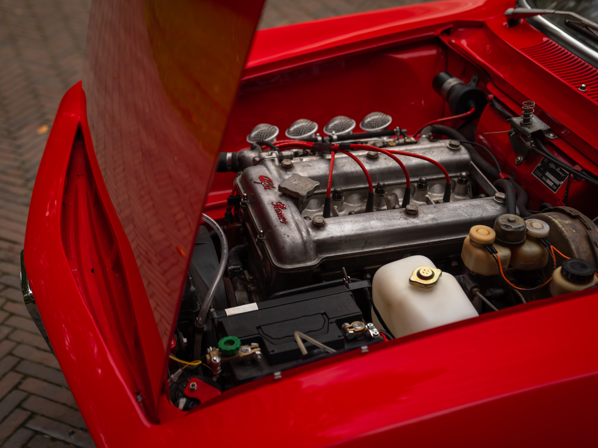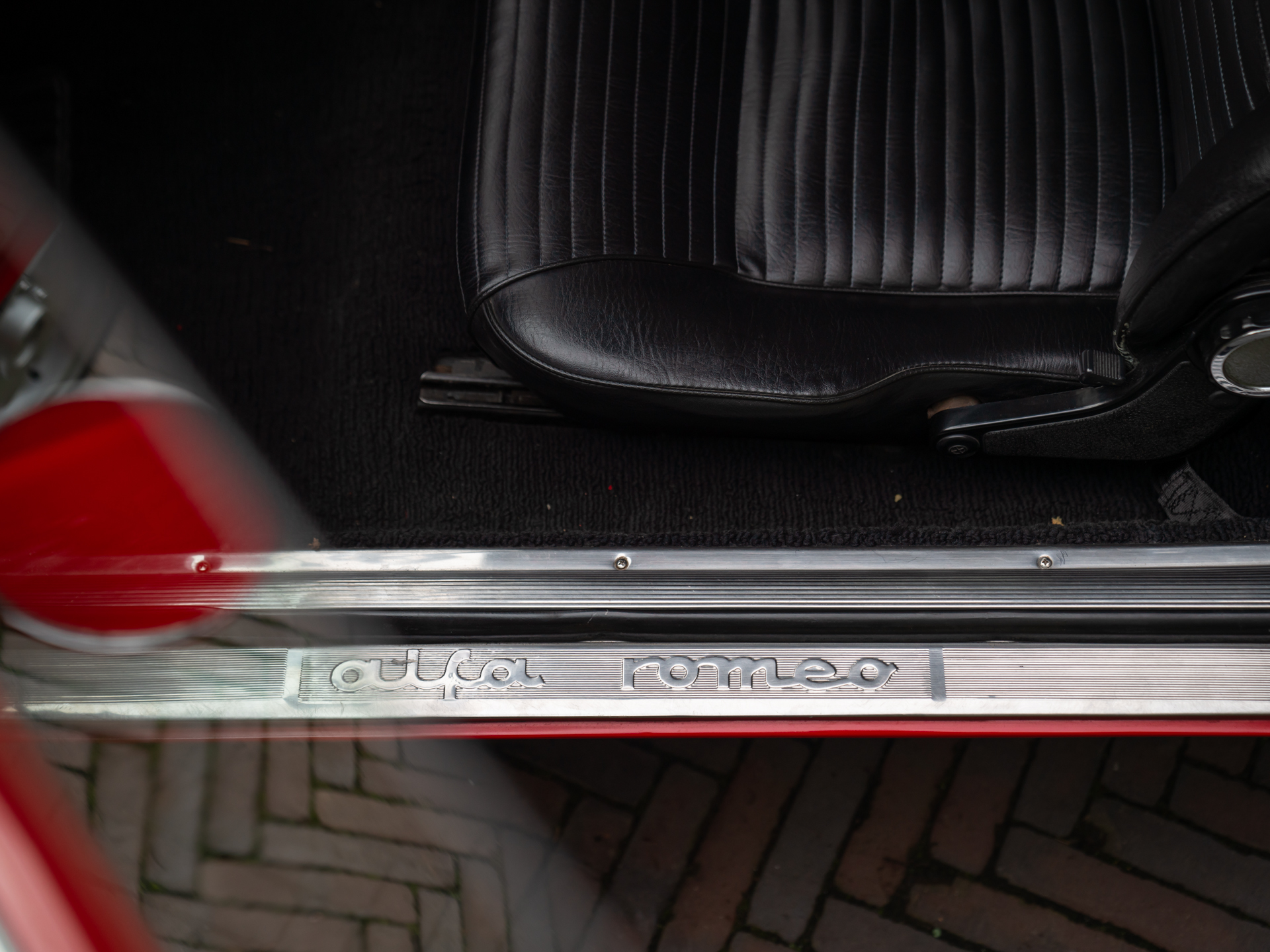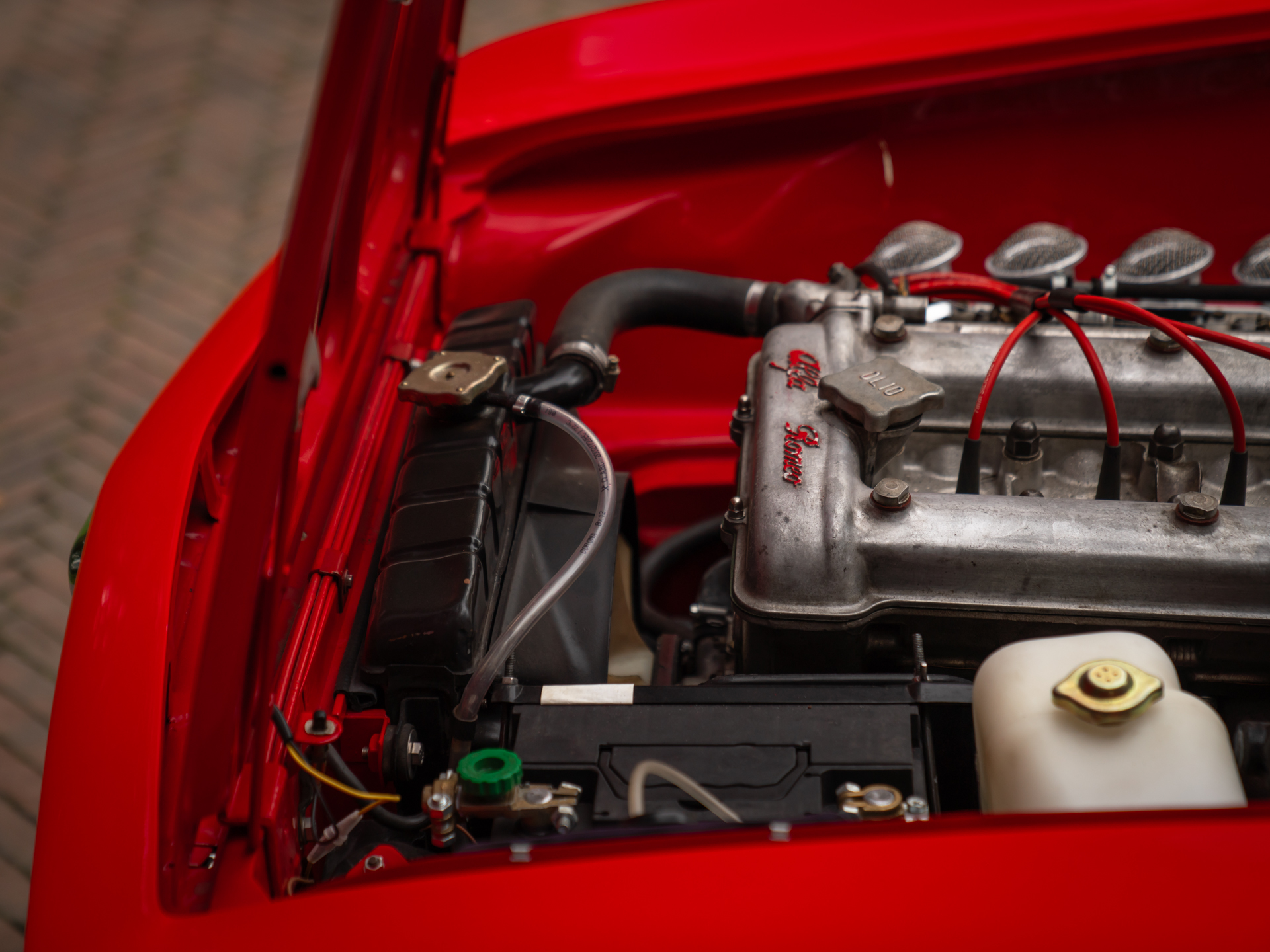 De toevoeging “Veloce” doet zijn naam eer aan door de 4-cilinder Twin Cam motor van extra inhoud én paarden te voorzien; respectievelijk 2,0 liter en 132 pk. Gekoppeld aan een manuele 5-bak, worden enkel de achterwielen aangedreven. Kortom, alle ingrediënten voor een sportieve rijervaring zijn present. En ook het motorgeluid is hierop afgestemd! De roffel is iconisch, verslavend en nostalgisch. Precies datgene wat ervoor nodig is om de volgende liefhebber achter het stuur te krijgen van deze prachtige Alfa “in Rosso”.
