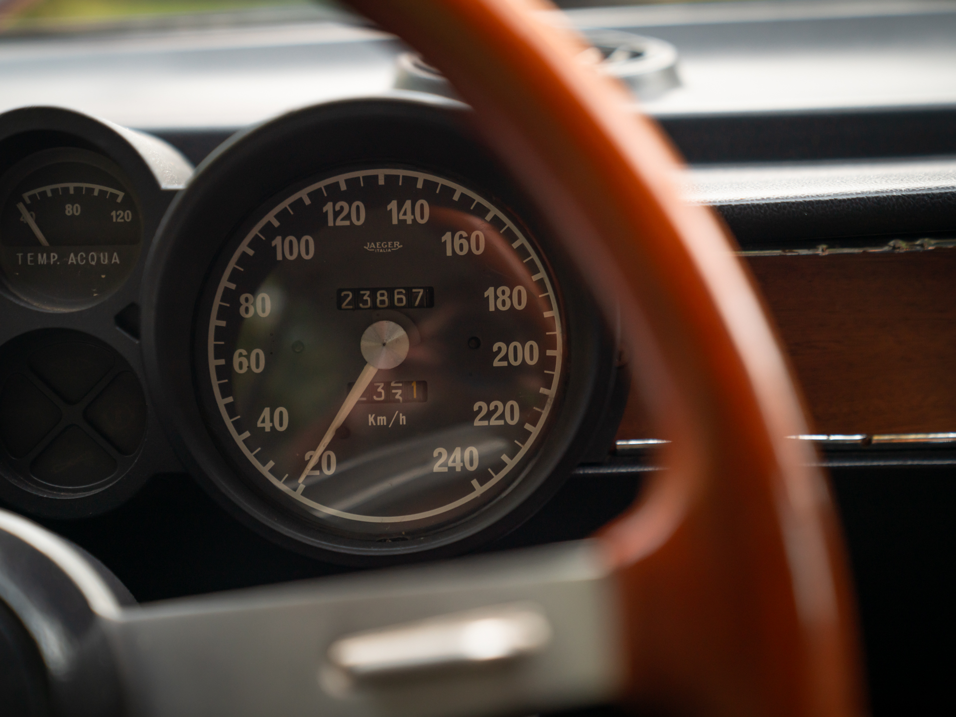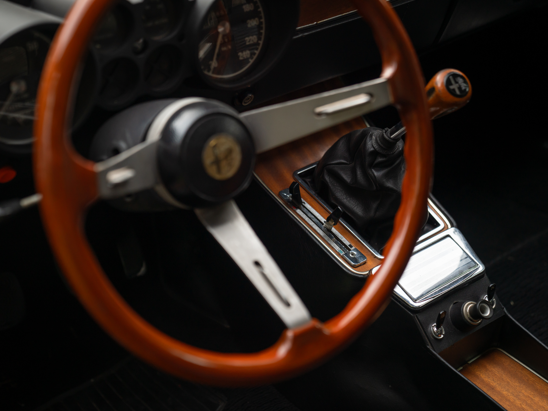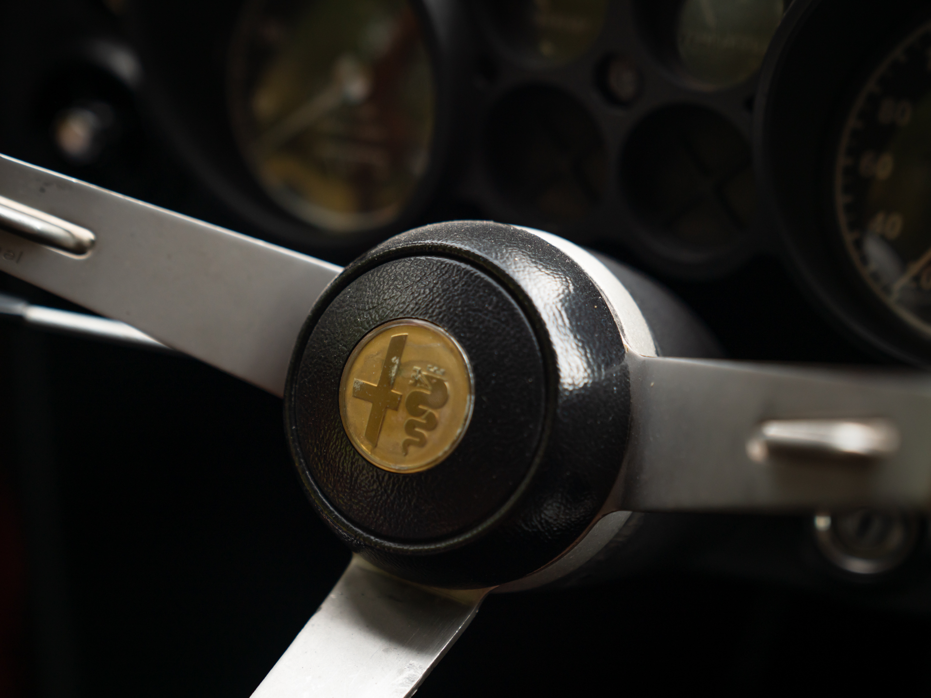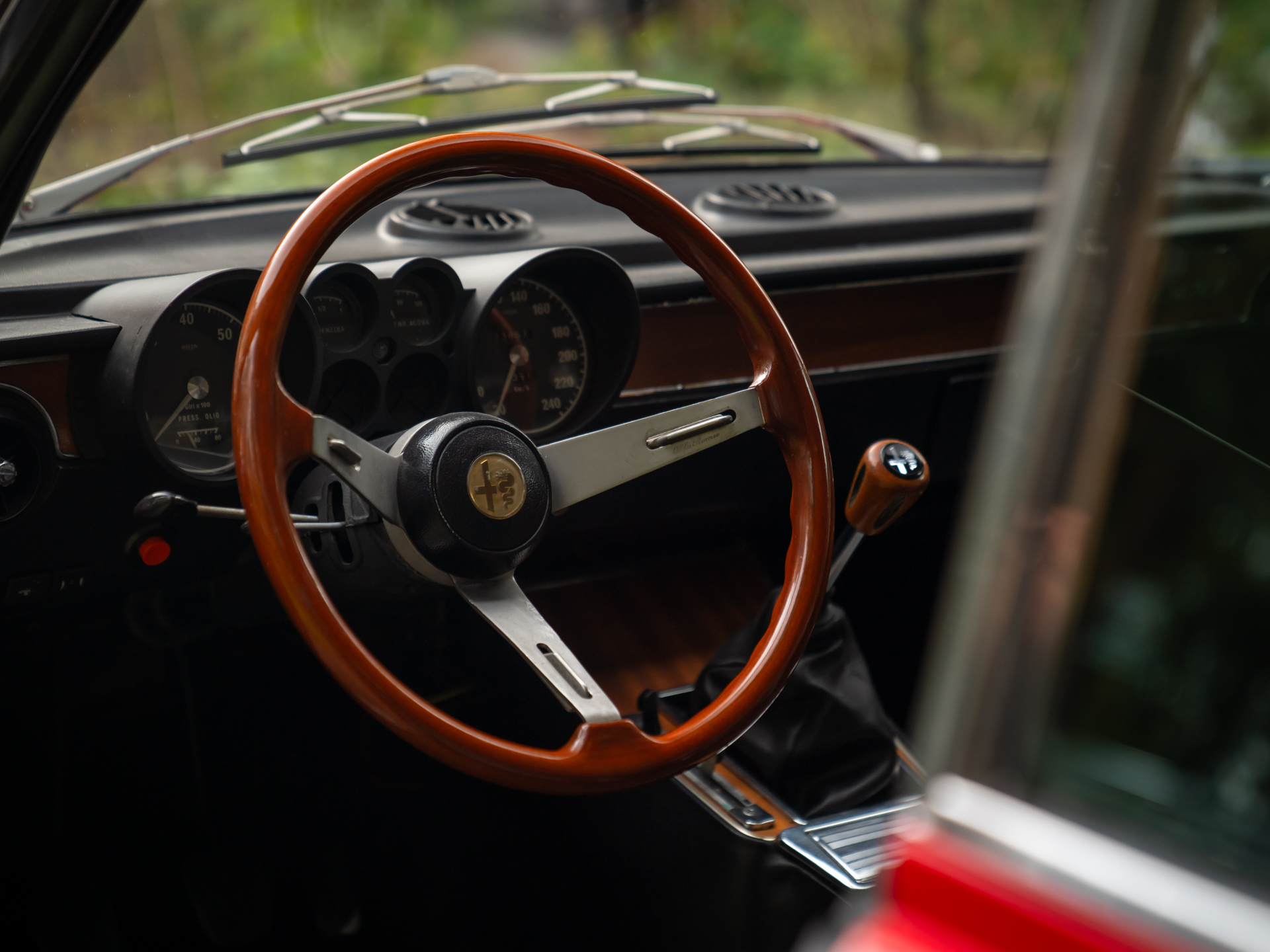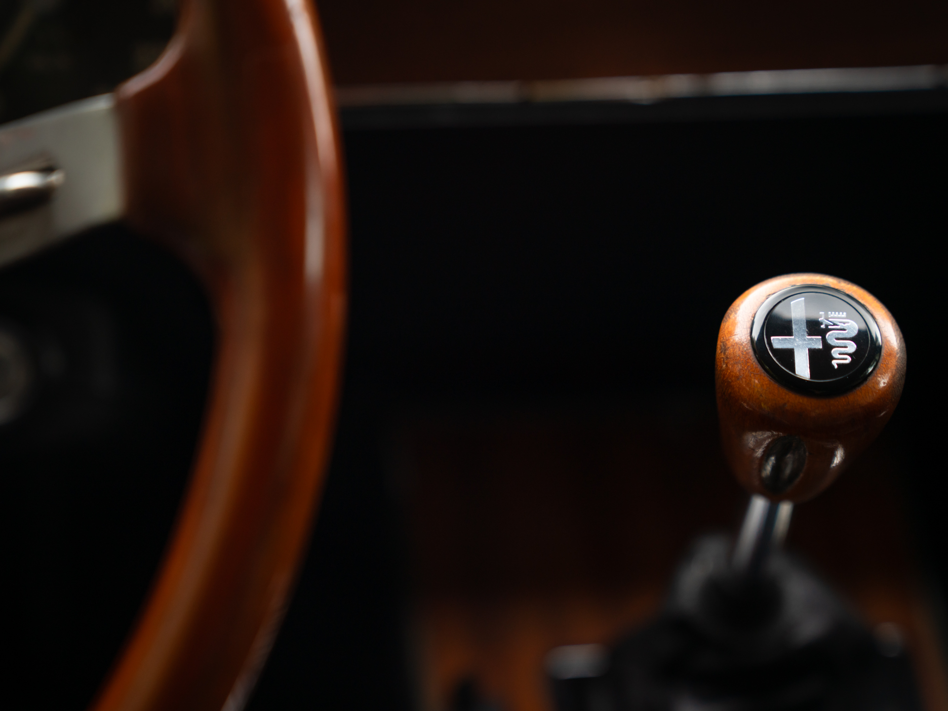 Een knalrode carrosserie met Nero interieur; een droomspecificatie voor zo ongeveer elke Alfist die oog heeft voor de historische klasse van het merk. Ook de moderne fijnproever valt als een blok voor deze even sportieve als stijlvolle combinatie. Met het grote houten 3-spaaks stuurwiel en dito dashboardpanelen + middentunnel én schakelpookknop als ultieme finishing touch. De 2 grote kokers die de analoge toerenteller (links) en snelheidsmeter (rechts) representeren, staren de bestuurder aan, smekend om de naalden in beweging te komen. Tank vol en temperatuur oké? Dan kan het gas er pas écht op!
