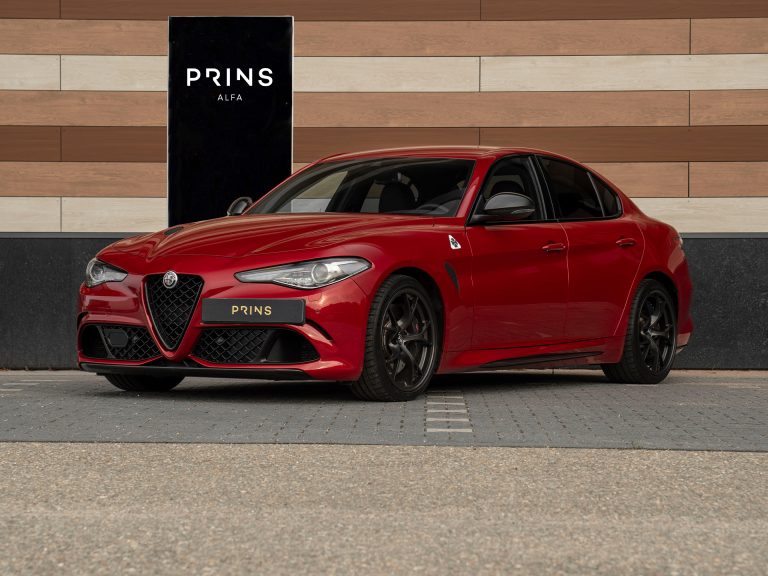 Nieuw binnen: super gaaf geconfigureerde Giulia Q MY22 in het Rosso Competizione, voorzien van donkere 19 inch Leggera velgen, carbon pack, Apple CarPlay, adaptieve cruise control etc.