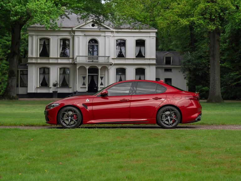 Schitterende Giulia Quadrifoglio in het Rosso Competizione met Rosso remklauwen en carbon extra’s als de spoiler, sideskirts en frontlip.