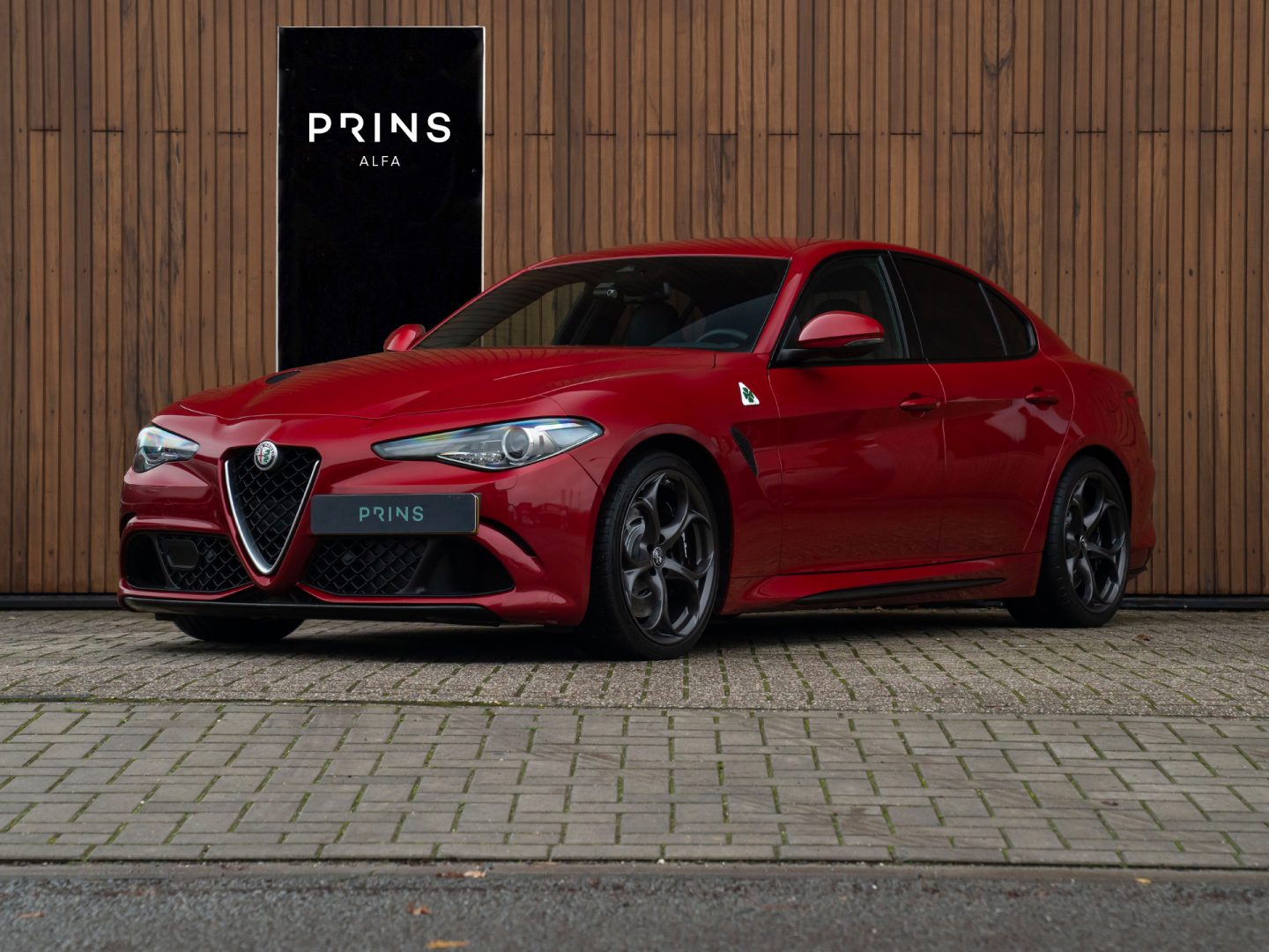 Fraaie Giulia Quadrifoglio in het Rosso Competizione met de gewilde Carbon kuipstoelen.