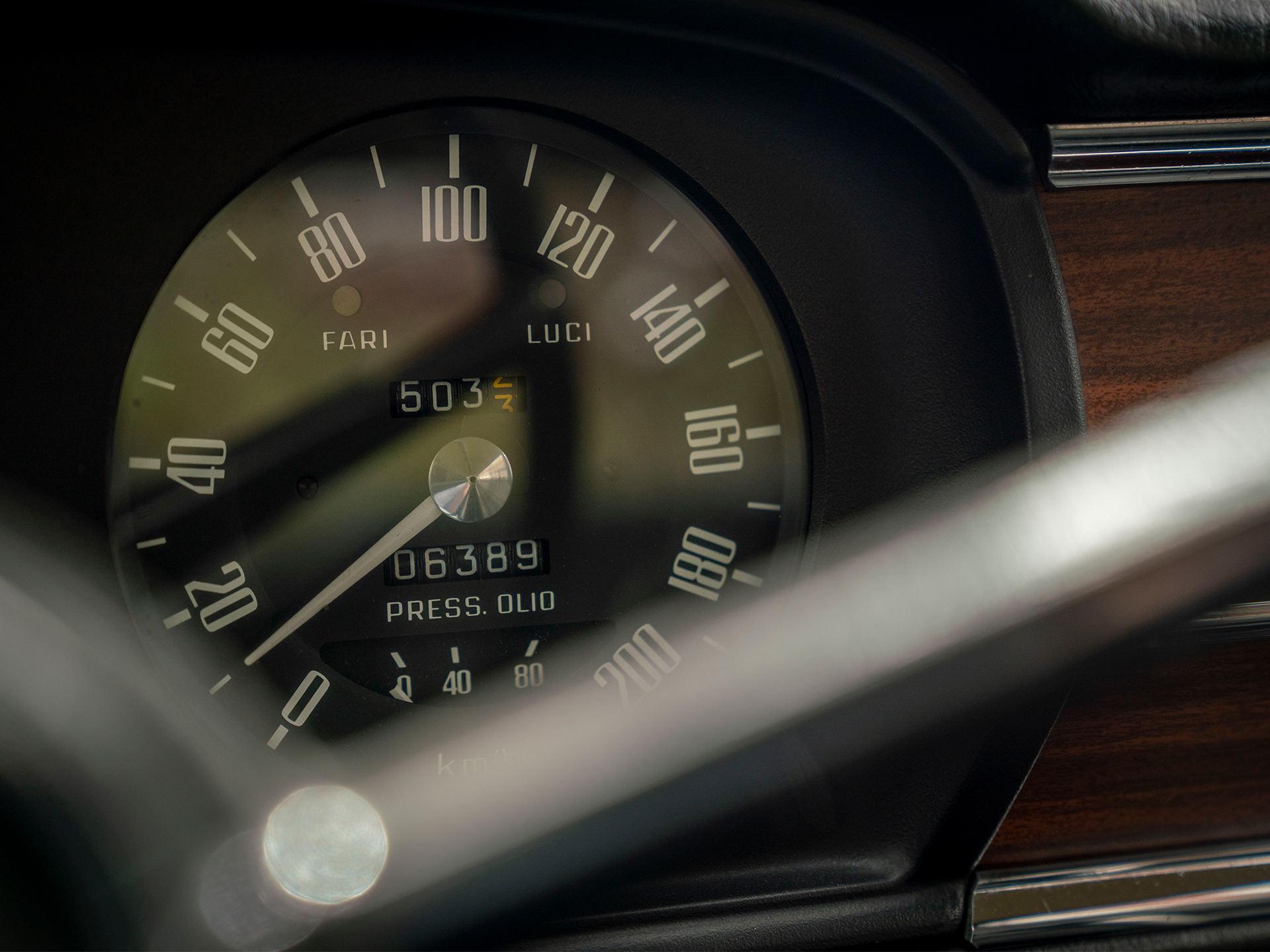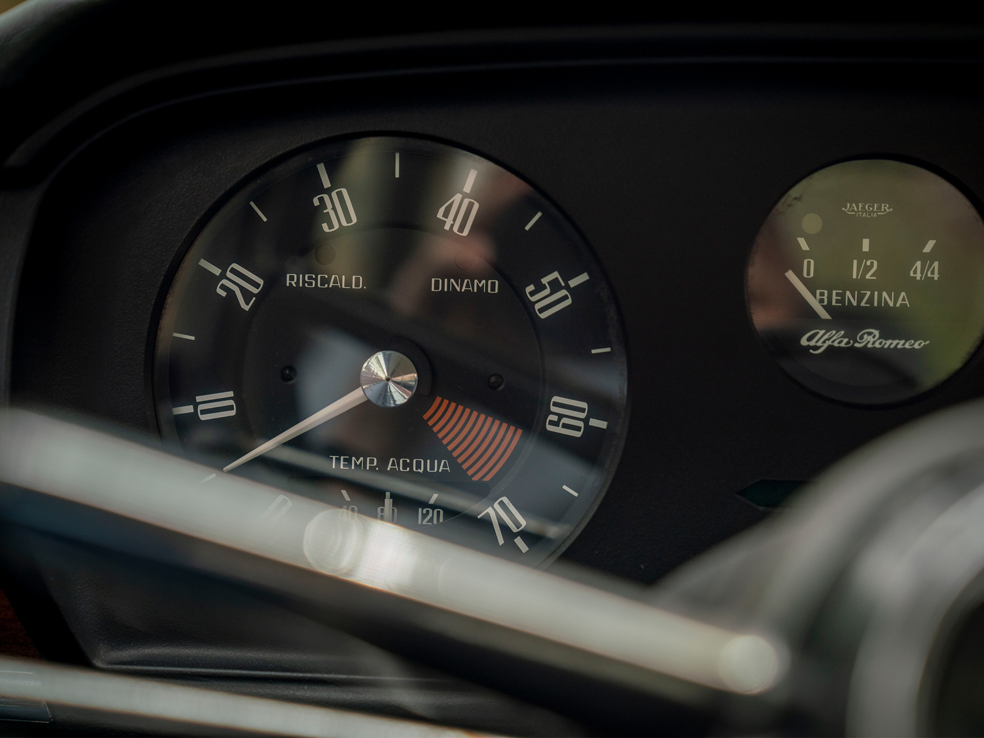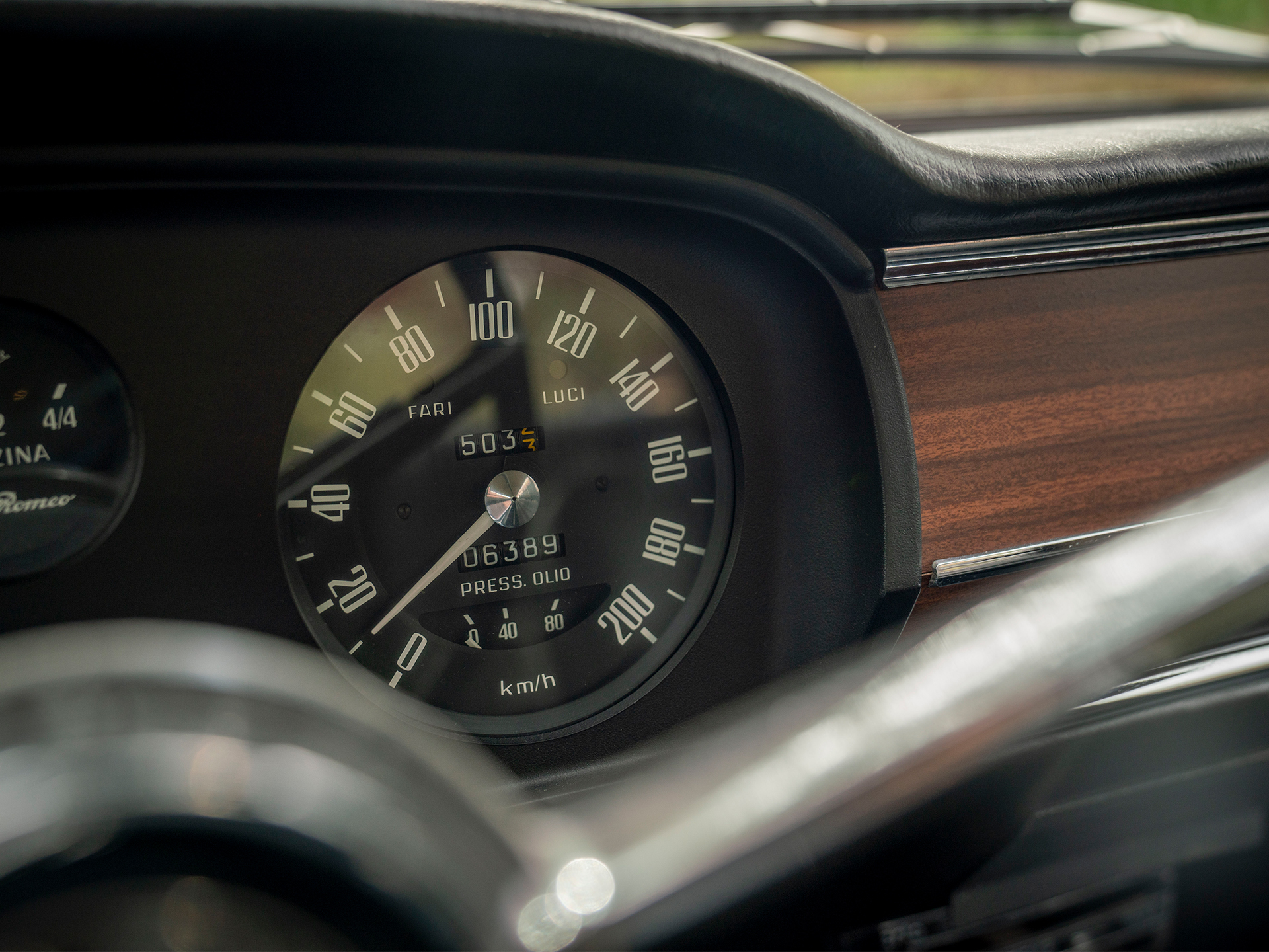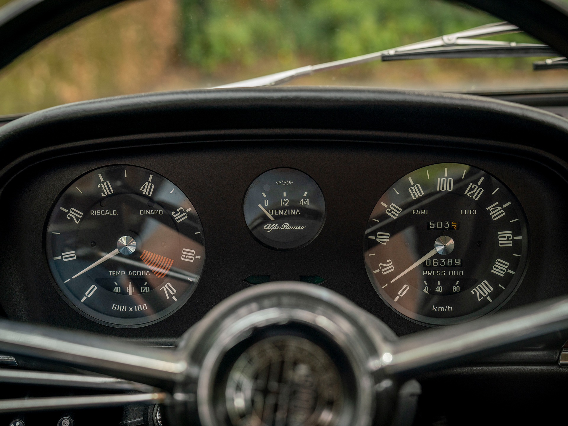Om maar meteen met de deur in huis te vallen: het interieur verraadt de rijke geschiedenis van onze Alfa Romeo Giulia. Hoe goed de cockpit ook in elkaar steekt en hoe fraai het 3-spaaks stuurwiel van bakeliet (speciaal voor de Ti-uitvoering) ook op het netvlies ligt, het kan niet voorkomen dat u hier en daar een slijtageplek gaat tegenkomen. Is dat erg? Niet als u van origineel en puur houdt. Want dat is de Giulia 1300 Turismo Internazionale helemaal! Wat verder opvalt is de cleane opzet van het zwarte instrumentenpaneel met daarin 2 grote klokken en één kleinere meter voor de “benzina”. De houtafwerking doet luxe aan en de Giulia 1300 Ti opschrift op het dashboard maakt ‘m zowaar nóg begerenswaardiger. Niemand mag ontgaan met wat voor Alfa Romeo hij of zij te maken heeft!
