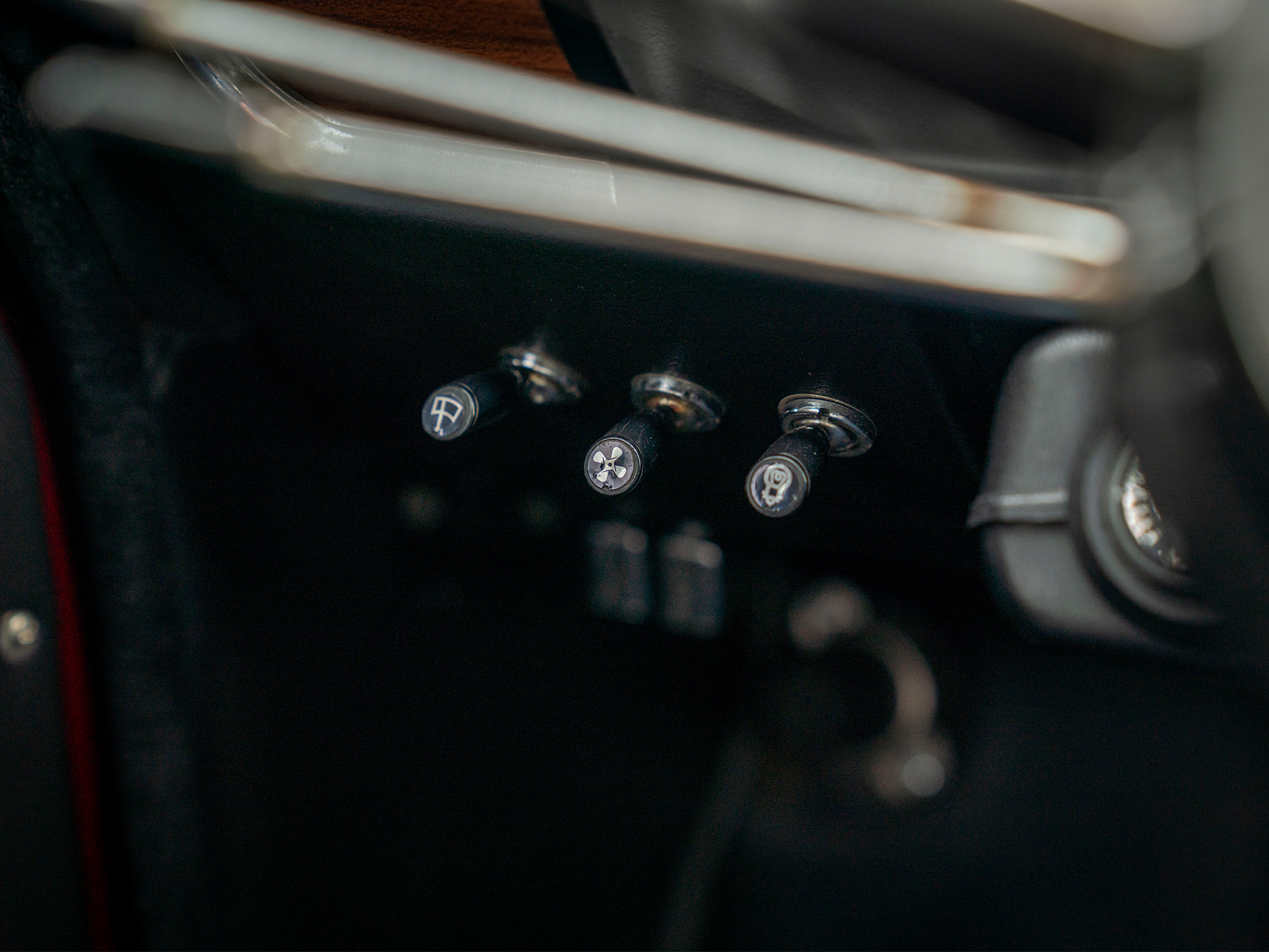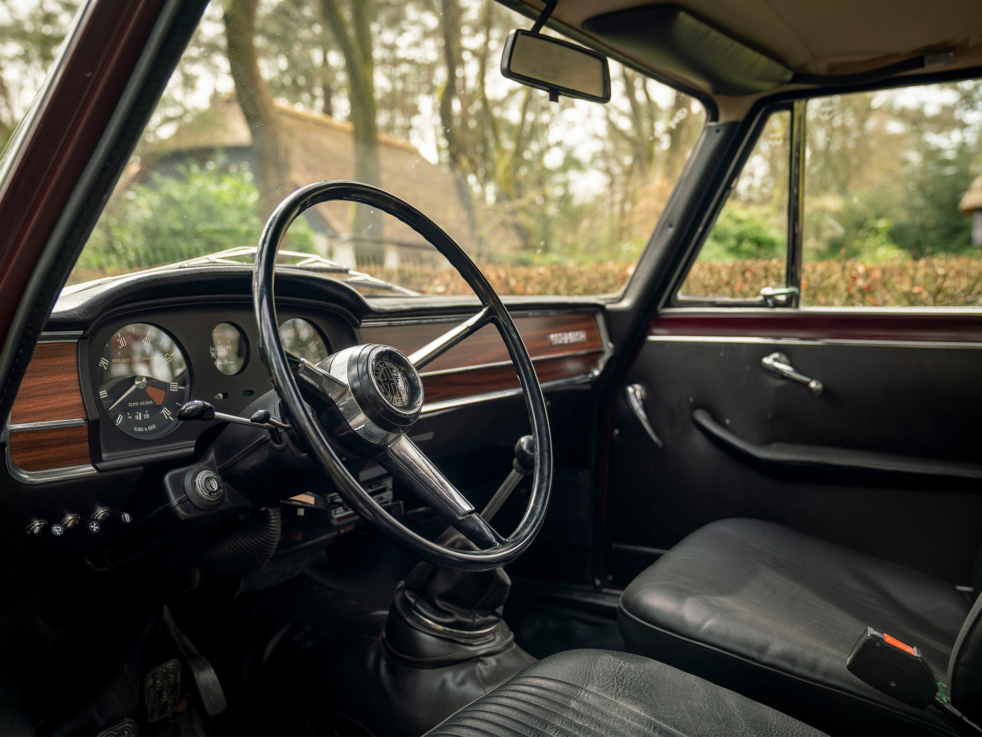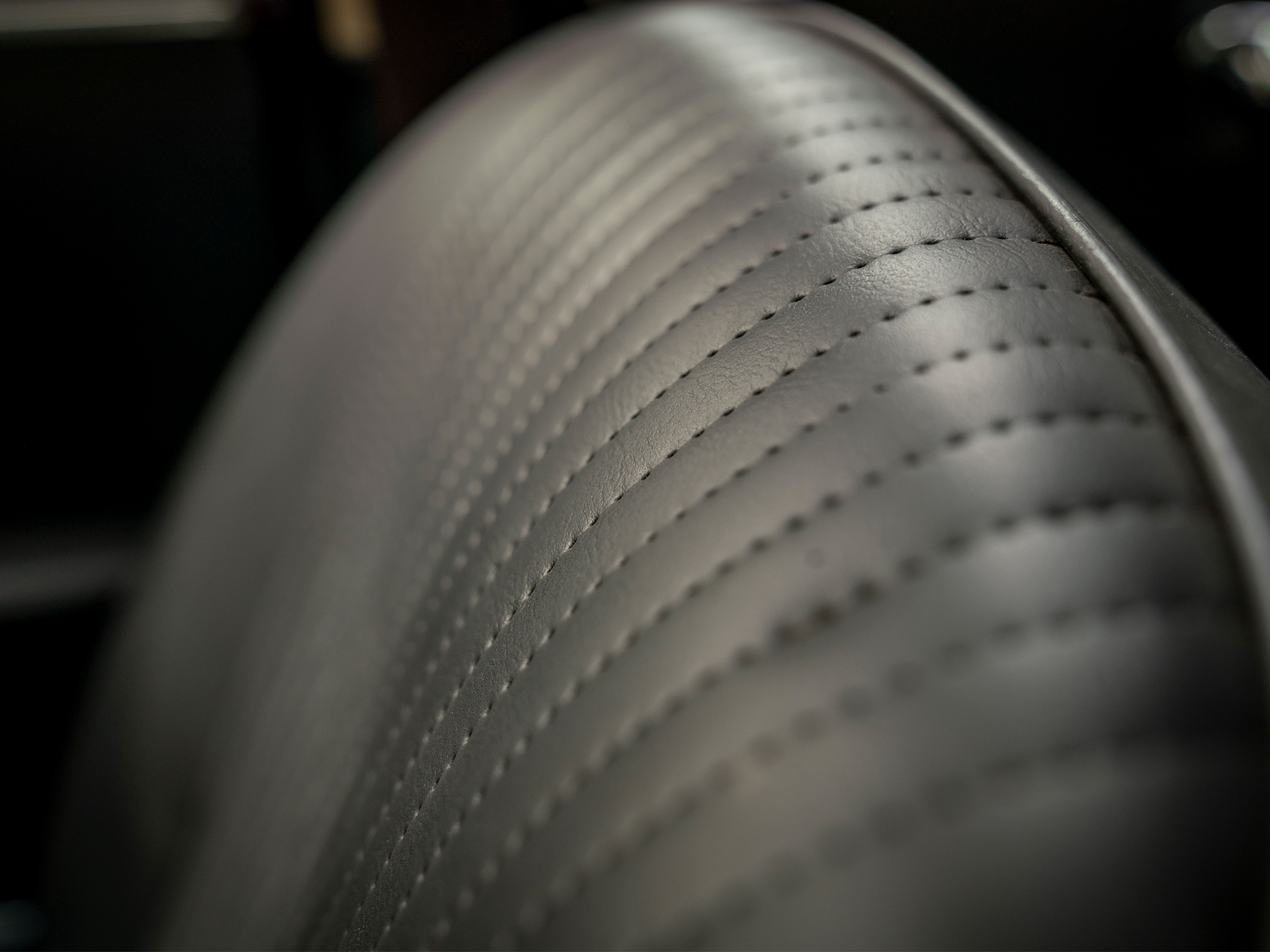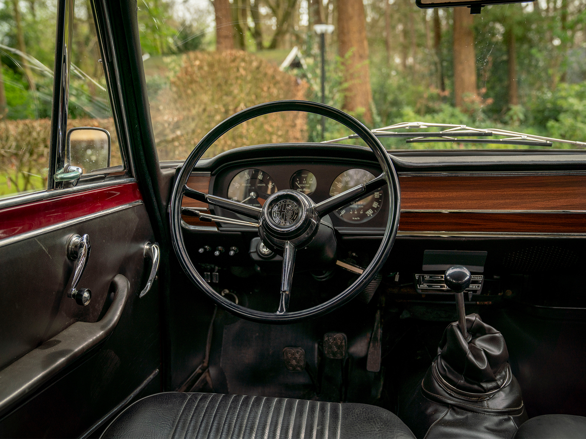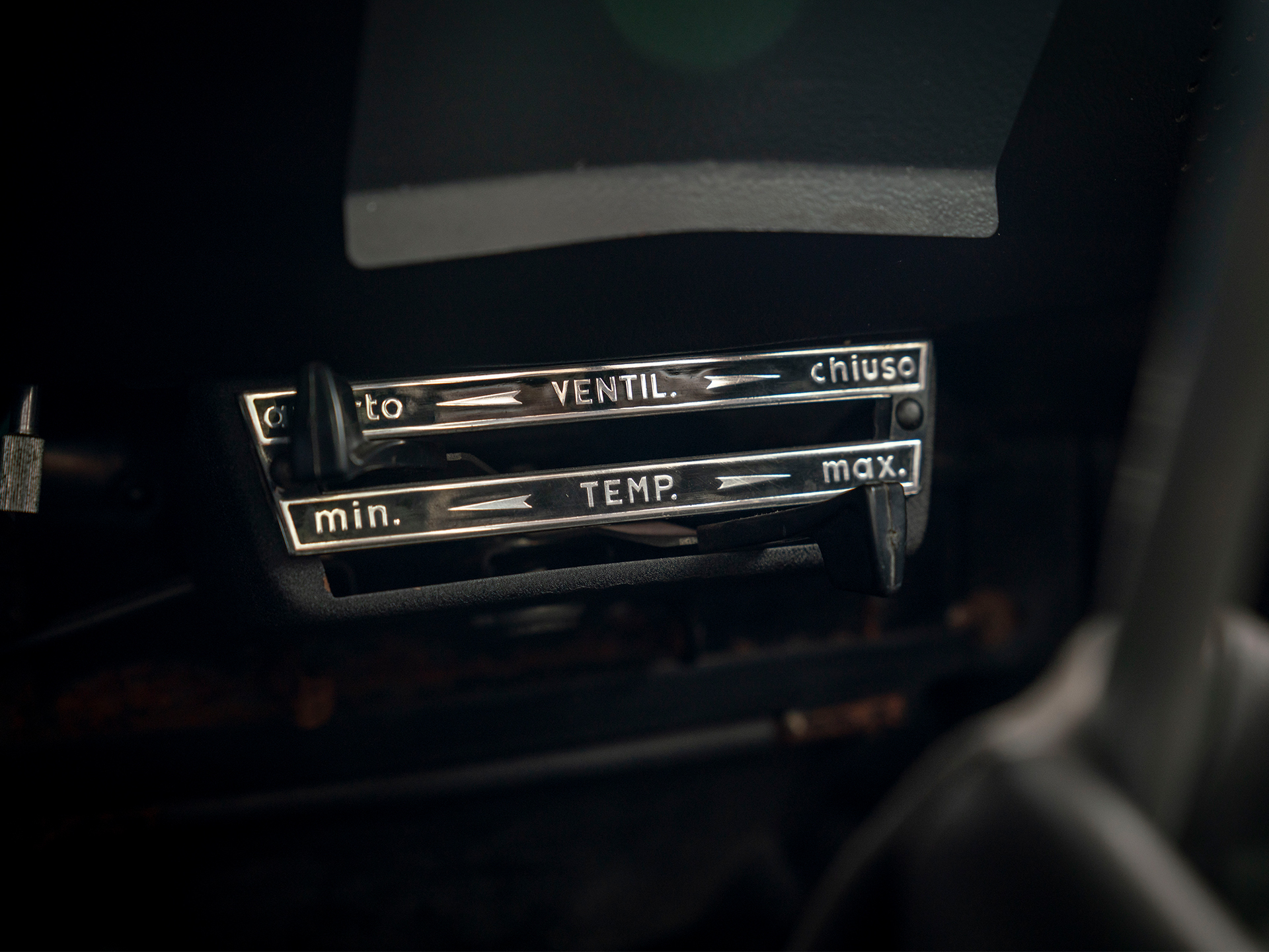 Om maar meteen met de deur in huis te vallen: het interieur verraadt de rijke geschiedenis van onze Alfa Romeo Giulia. Hoe goed de cockpit ook in elkaar steekt en hoe fraai het 3-spaaks stuurwiel van bakeliet (speciaal voor de Ti-uitvoering) ook op het netvlies ligt, het kan niet voorkomen dat u hier en daar een slijtageplek gaat tegenkomen. Is dat erg? Niet als u van origineel en puur houdt. Want dat is de Giulia 1300 Turismo Internazionale helemaal! Wat verder opvalt is de cleane opzet van het zwarte instrumentenpaneel met daarin 2 grote klokken en één kleinere meter voor de “benzina”. De houtafwerking doet luxe aan en de Giulia 1300 Ti opschrift op het dashboard maakt ‘m zowaar nóg begerenswaardiger. Niemand mag ontgaan met wat voor Alfa Romeo hij of zij te maken heeft!