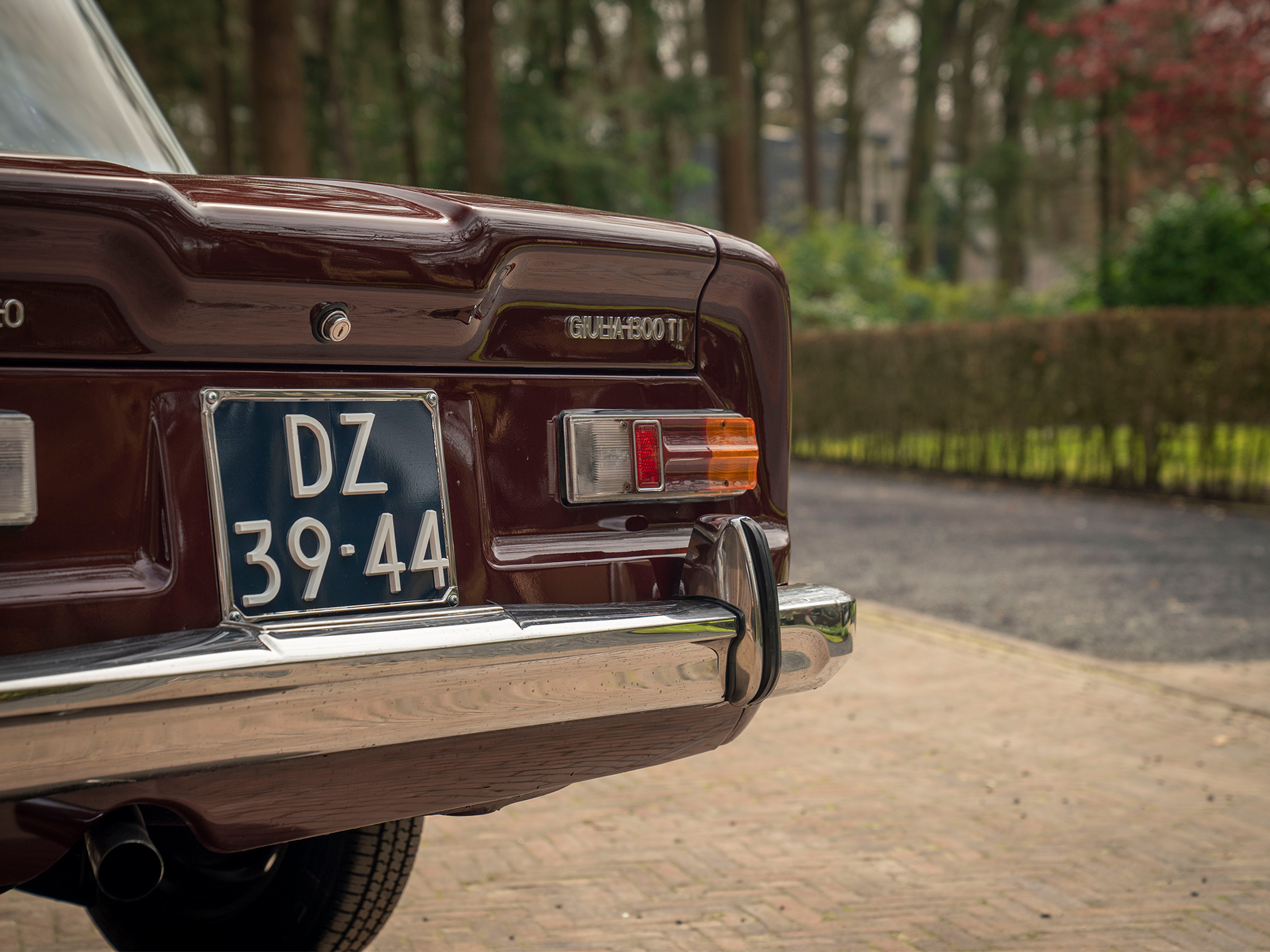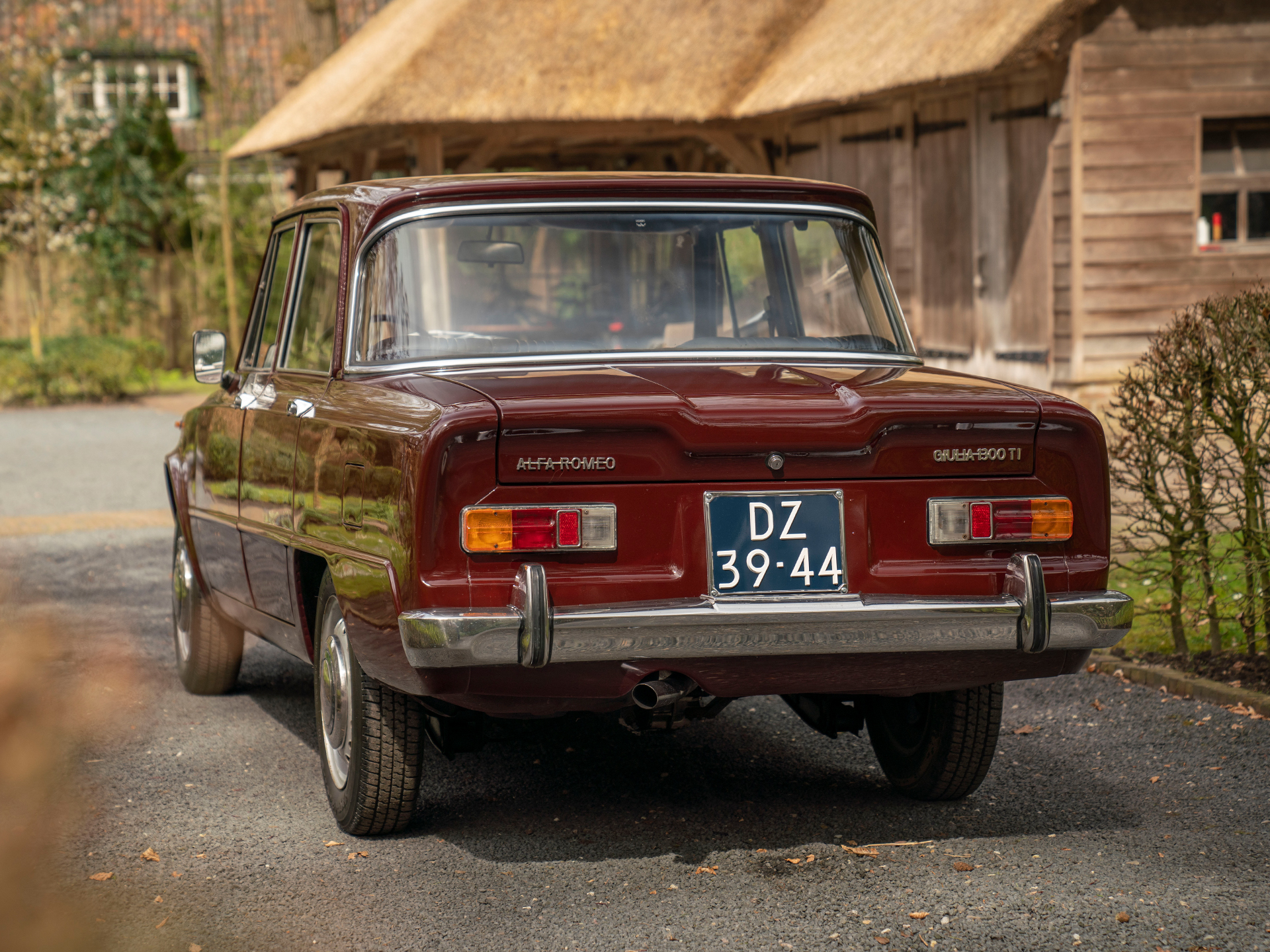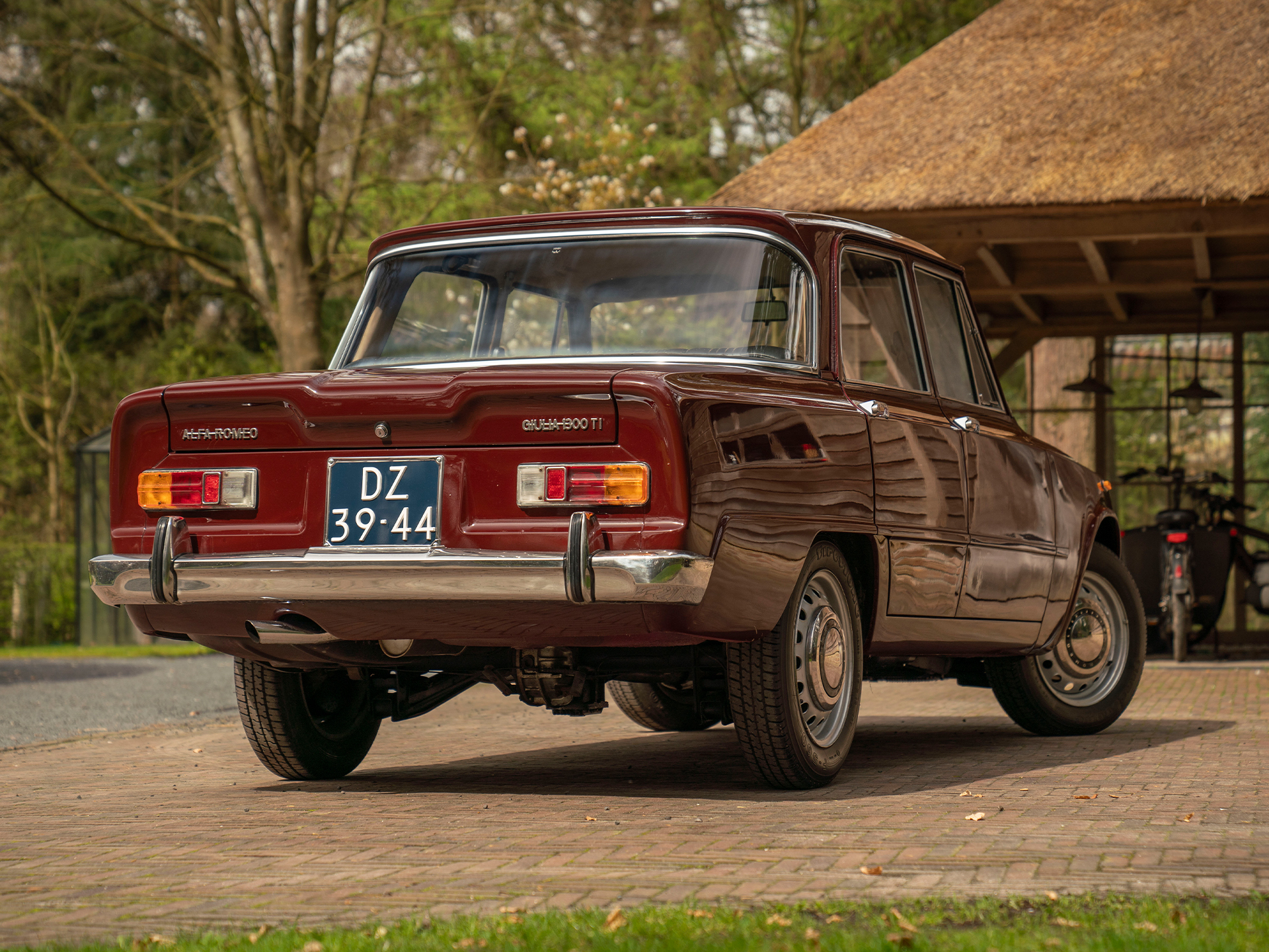 In 1966, 4 jaar na de onthulling van de Giulia, introduceert Alfa Romeo de Giulia 1300 Turismo Internazionale: een extra sportieve versie gebaseerd op de Alfa GT 1300 Junior Coupé. De upgrade zit ‘m vooral in de techniek, want de 4-cilinder lijnmotor uit de 105-serie is een stuk temperamentvoller en gaat gekoppeld aan een handgeschakelde 5-bak voor een sterkere performance. De karakteristieke 4-deurs “berlina” uitvoering van Alfa Romeo is uitgegroeid tot een icoon, en daar heeft de dynamische 1300 Ti een belangrijk aandeel in. Dit exemplaar verliet in 1968 de fabriekspoorten en kwam in 2017 naar Nederland. De historie vertelt ons dat de Alfa klassieker nooit is gerestaureerd. Ook niet door uw voorganger: een verzamelaar pur sang. Het maakt de auto des te meer een collectors item. Immers, welke 55 jaar oude auto vertelt het hele verhaal en is nog altijd in goede staat, zonder een keer flink te zijn strakgetrokken?