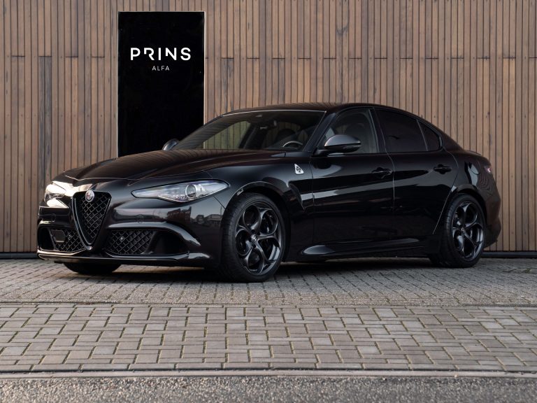 Explosief. Heet als vuur. Compleet zwartgeblakerd en dan noemen ze de lak ook nog “Nero Vulcano”. Dat kan geen toeval zijn… Deze gruwelijk mooie Alfa Romeo Giulia Quadrifoglio van modeljaar 2021 slaat genadeloos hard toe als het gaat om pure pracht, power en prestaties. Wat dat betreft hadden ze de Giulia Q ook wel “Triplo P” kunnen noemen. Maar ja, dan was de verwijzing naar het iconische klavertje vier niet compleet geweest. Driedelig is tevens de zwarte uitdossing van de 510 pk sterke bi-turbo V6 – daarover verderop meer. Een Carbon in- en exterieur, Driver Assistance Pack 2, Apple CarPlay, camera en keramische remmerij maken van dit brute snelheidswonder een ongekend spektakelstuk op wielen. Wie durft?
