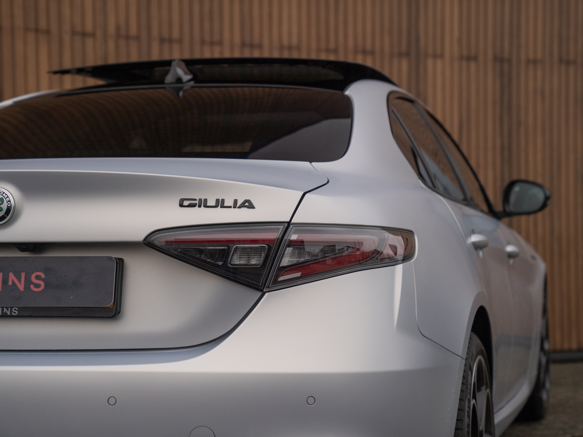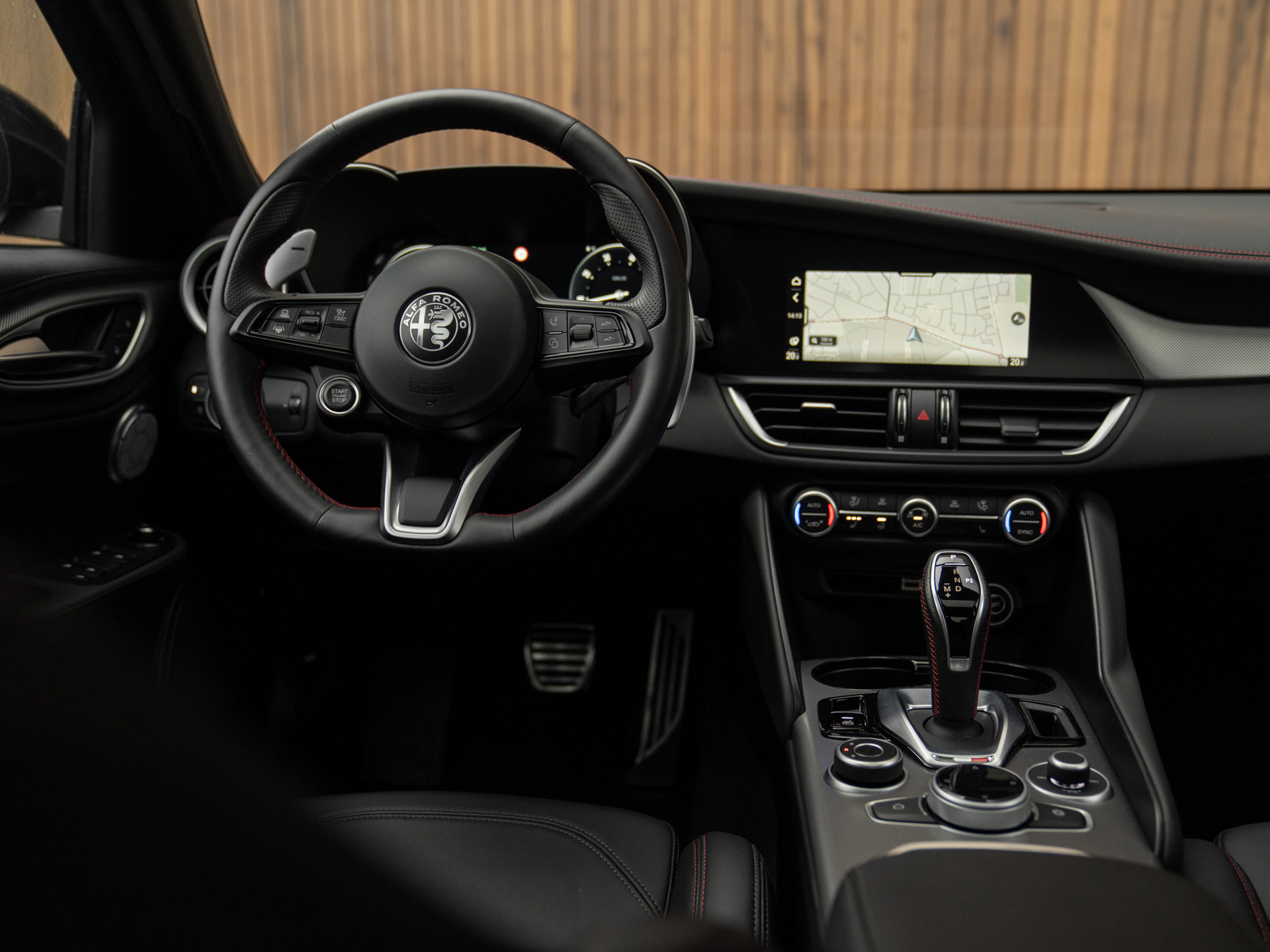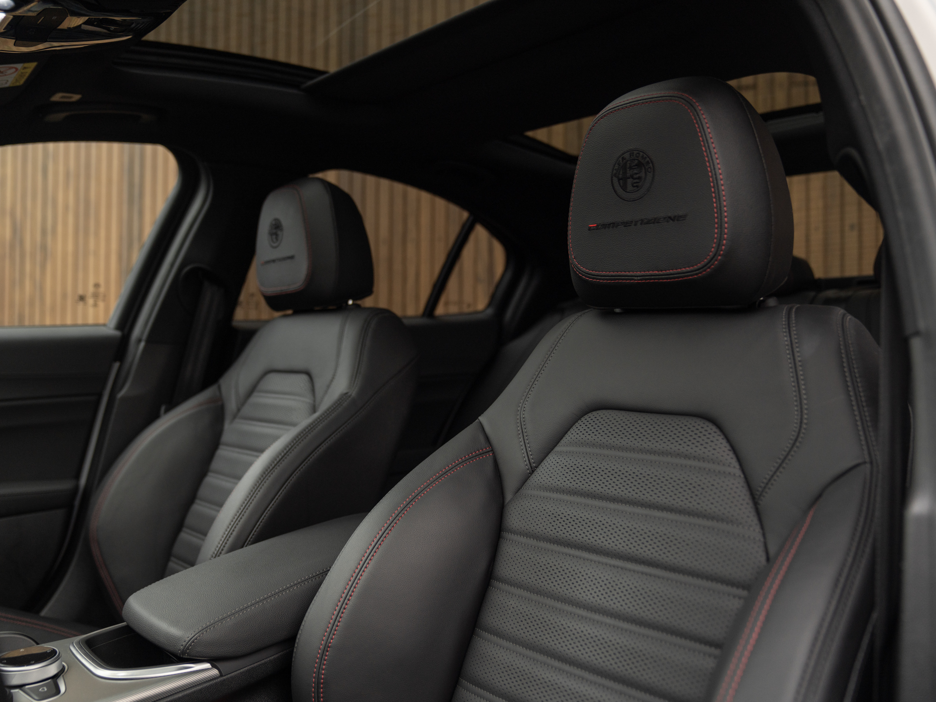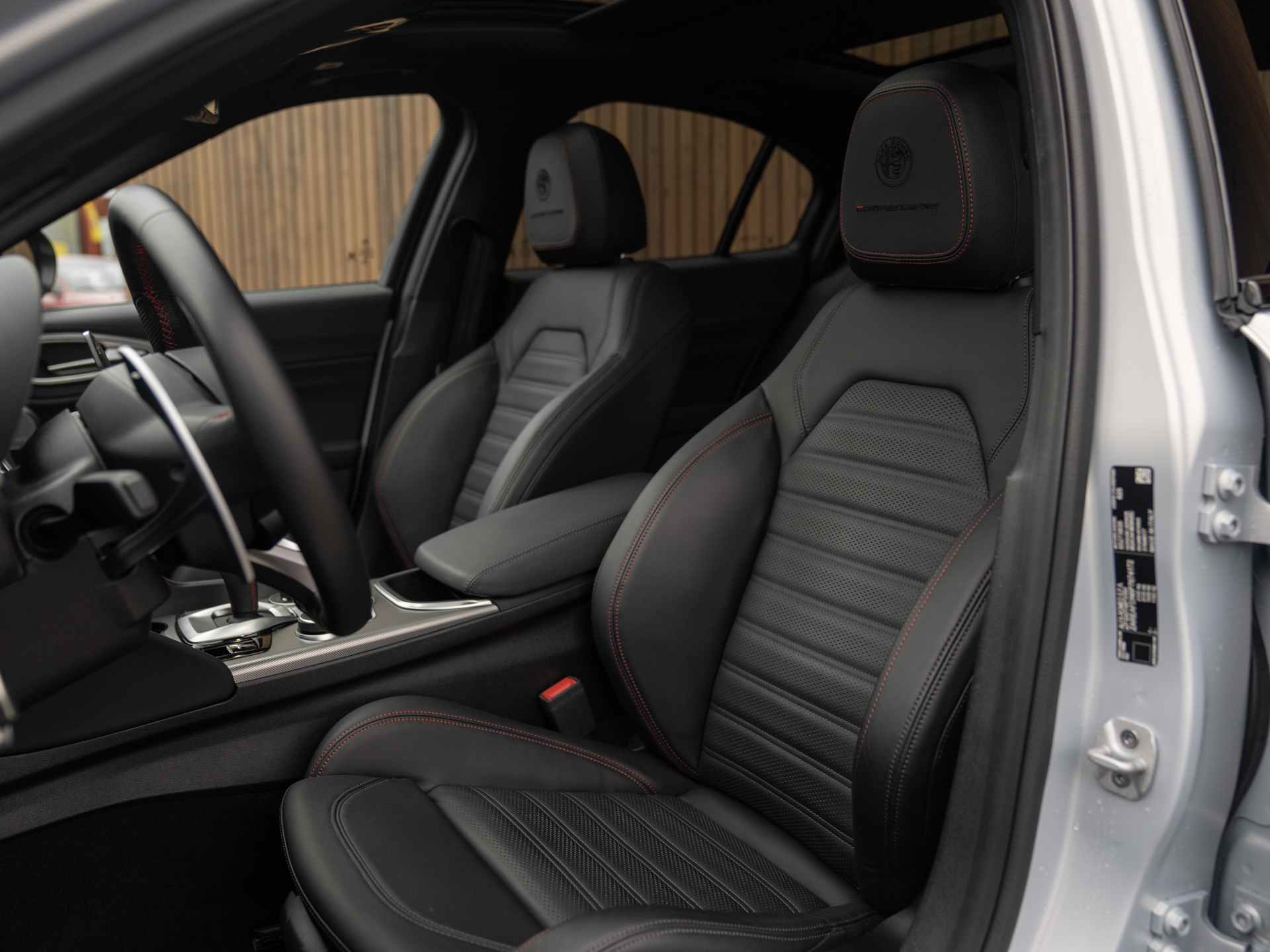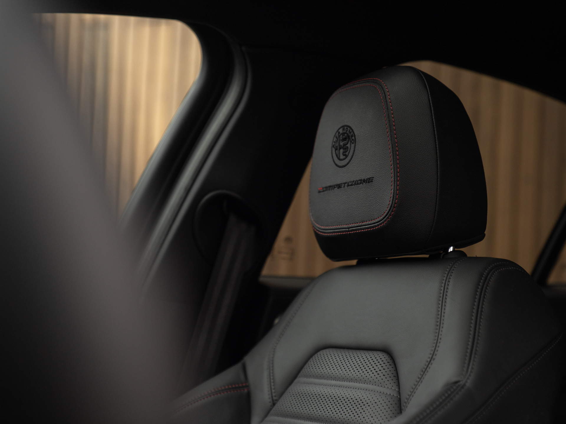Van binnen is de Giulia voorzien van schitterende, verwarmde Competizione sportstoelen met Rosso stitching en badges in de hoofdsteunen. De afwerking voelt luxe aan en de Giulia is compleet uitgevoerd met zaken als een panoramadak, matrix-LED koplampen, Harman/Kardon audio, Performance Pack etc.