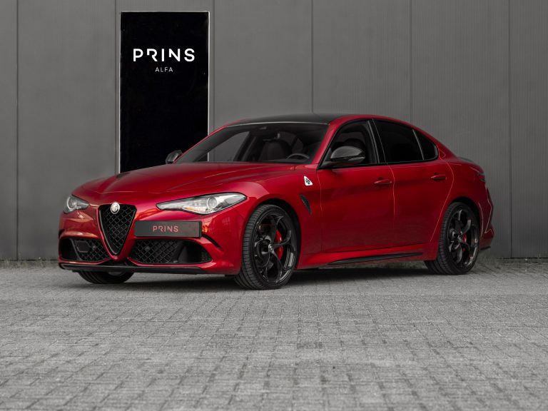 Nieuw binnen: deze heerlijke Giulia Quadrifoglio van modeljaar 2022 in een zeer complete configuratie met oa. Rosso Etna lakwerk, Carbon dak, Harman/Kardon audio, 20 inch velgen, adaptieve cruise control en elektrisch verstelbare en verwarmbare sportstoelen met memory.