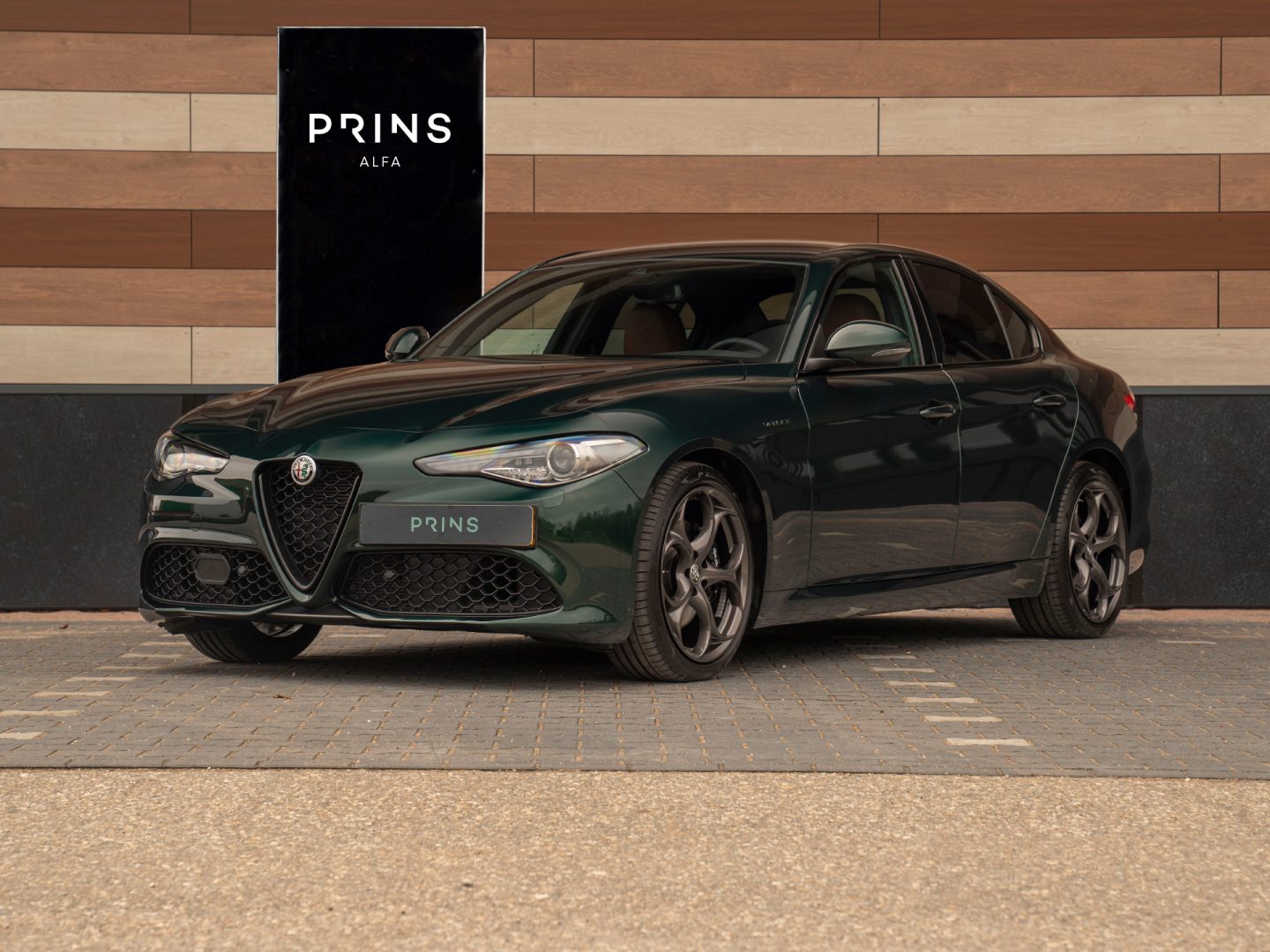 Verde Visconti per favore! De unieke, donkergroene metallic-lak met 19 inch Quadrifoglio velgen en een Tabacco lederen Veloce interieur maken van deze Giulia een absolute droomauto.