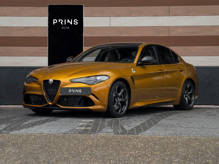 Een Alfa Romeo Giulia Q een zeldzaamheid? Dan heeft u deze nog niet gezien! Het betreft hier de facelift van modeljaar 2022, met natuurlijk de 510 pk sterke V6-turbomotor en… Een Giallo Ocra kleurstelling! Een omschrijving die wat ons betreft tamelijk bescheiden gekozen is, want we vinden het letterlijk een gouden combinatie met de vele carbon exterieurdetails. Ook het uitrustingsniveau van deze Alfa Giulia Quadrifoglio verdient een gouden plak: Adaptive Cruise Control, stuur- en stoelverwarming, Apple CarPlay, een achteruitrijcamera en elektrisch verstelbare stoelen inclusief memoryfunctie behoren tot het Italiaanse pretpakket. Met de nadruk op pret, want die explosie aan superkrachten op de achteras garandeert een grijns breder dan het fraaie smoelwerk van deze ultieme sportsedan. Beleef het bij Prins.