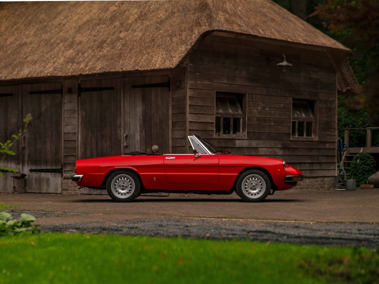 De van oorsprong Duetto genaamde Alfa Romeo Spider werd in 1966 gelanceerd tijdens de Geneva Motor Show. Opvallend is dat de Italianen gelijktijdig de Alfa Romeo Giulia Sprint GT Veloce aan het grote publiek toonden. Het contrast tussen de roadster van Pininfarina en coupé van Bertone kon namelijk haast niet groter: rond en stijlvol versus hoekig en stoer. De gelijkenissen met voorganger Giulietta Spider waren daarentegen wél sterk aanwezig. Al was de Spider vanaf het begin duidelijk meer gericht op een compromisloze sportwagen ervaring. In 1970 verruilde Alfa Romeo de sepiaschelp vormige achterzijde voor een meer rechttoe-rechtaan oplossing om zo extra bagageruimte te creëren en design-technisch aansluiting te vinden bij de eerder genoemde Giulia. Deze 2e generatie Spider werd heel treffend “Coda Tronca” gelabeld. Welk type achterzijde uw voorkeur heeft is heel persoonlijk, al moet gezegd worden dat de vuurrode Rosso Alfa lak het altijd goed doet op welk model Alfa Romeo Spider dan ook. En in het bijzonder op deze 2000 Veloce.