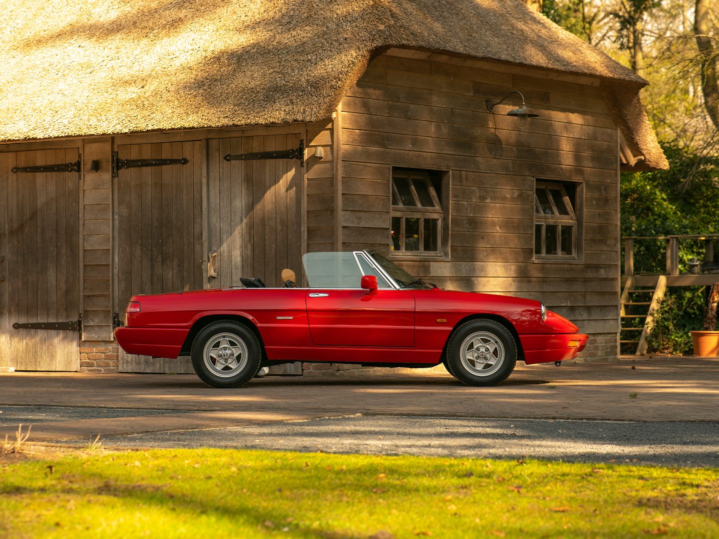 De Alfa Spider betreft één van de mooiste Italiaanse meesterwerken. Met directe voorganger Giulietta Spider, hebben de dakloze Romeo’s een behoorlijk designstatement neergezet gedurende de afgelopen 60 à 70 jaar. De originele Spider, genaamd “Duetto” stamt uit 1966 en komt uit de koker van legendarisch ontwerper Pininfarina. Hoe kan het ook anders? Het model kende in totaal 4 series, waarvan u hier de laatste ziet: Type 4, geproduceerd tot en met 1993. Het voordeel van dit type is dat de vuurrode lak nóg intenser is dankzij markanter vormgegeven, in carrosseriekleur meegespoten bumpers. Verder werden de achterlichtunits strakgetrokken. In dit geval zijn ze recentelijk nog vervangen. Sowieso is de algehele staat bijzonder netjes, tot en met de zwarte kap aan toe; ook die is onlangs vervangen. Open rijden heeft echter onverminderd de voorkeur!