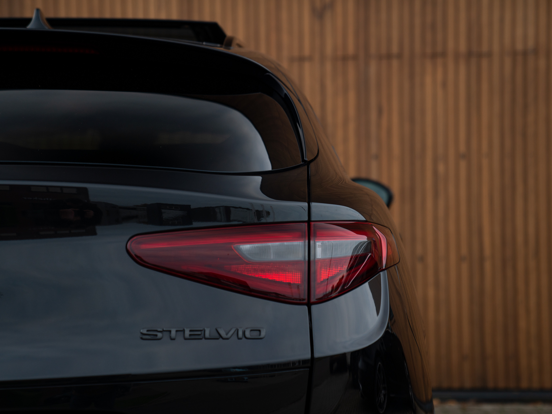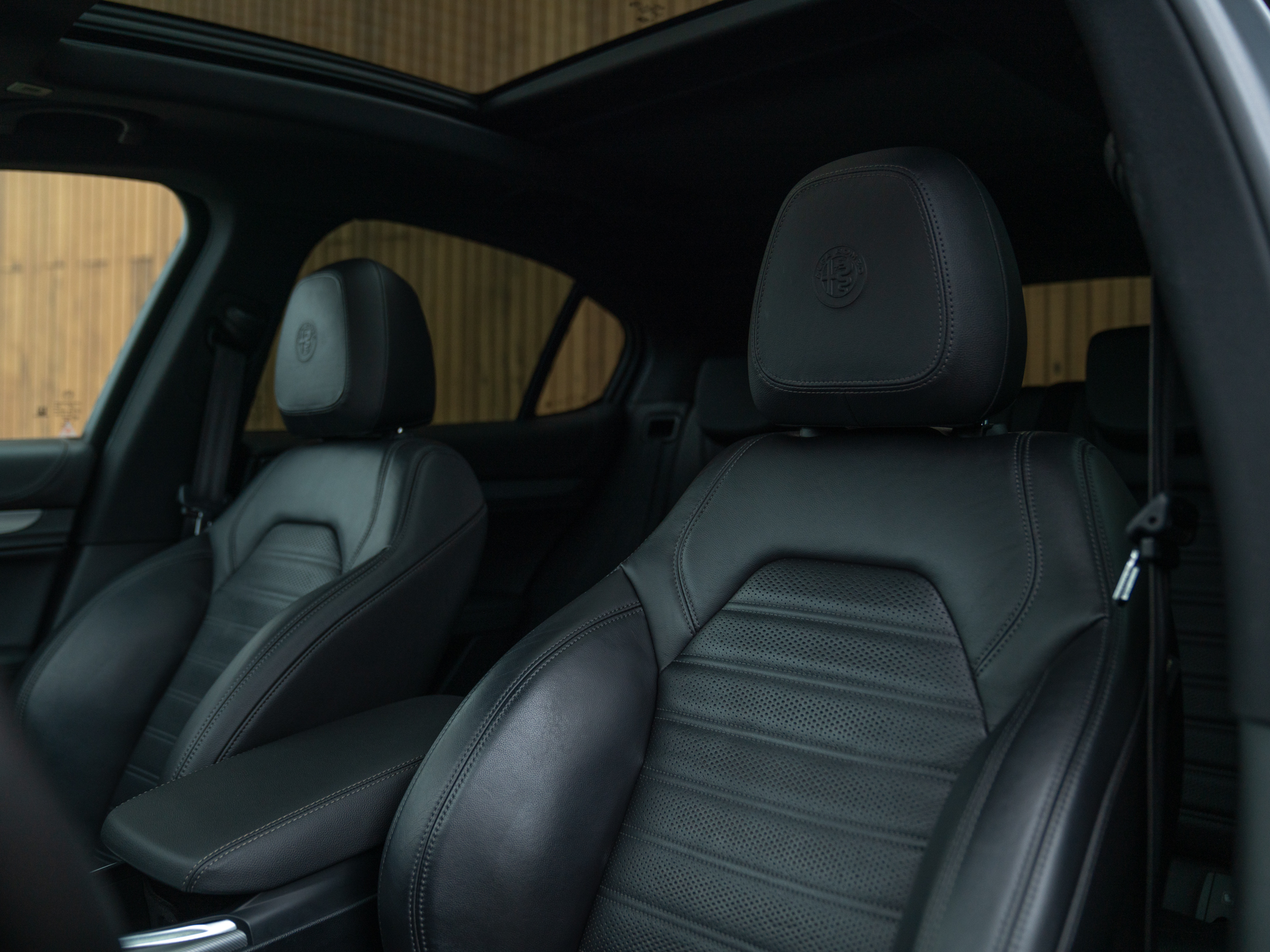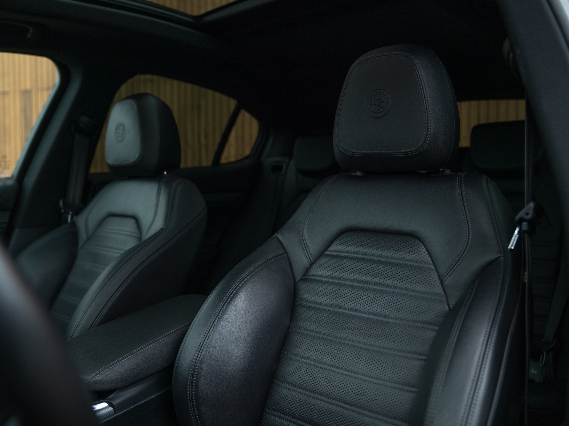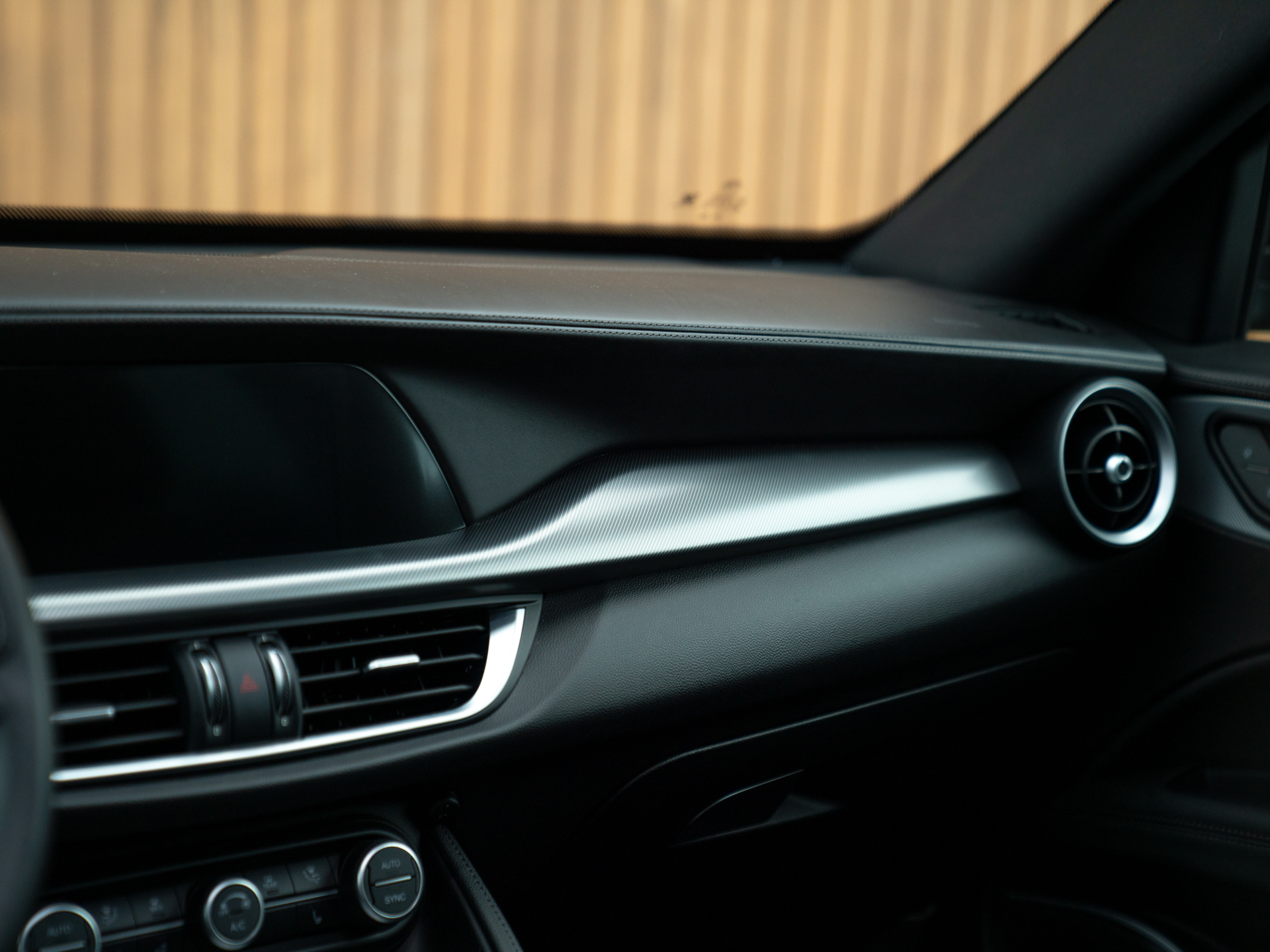 Heerlijke Stelvio Veloce 280pk in het Nero Vulcano met een Nero Veloce interieur, panoramadak, adaptieve cruise control, Performance Pack, Apple CarPlay etc!