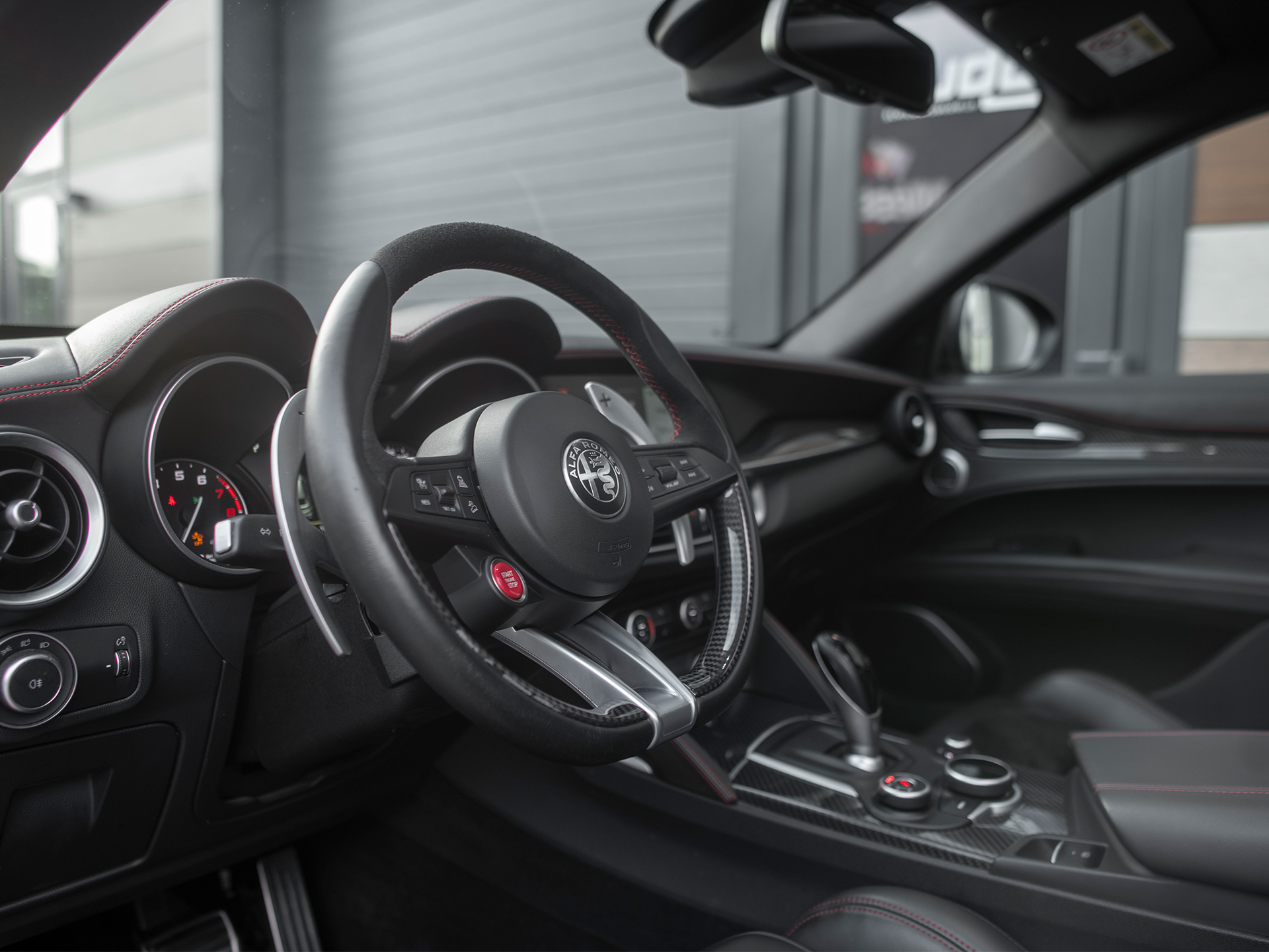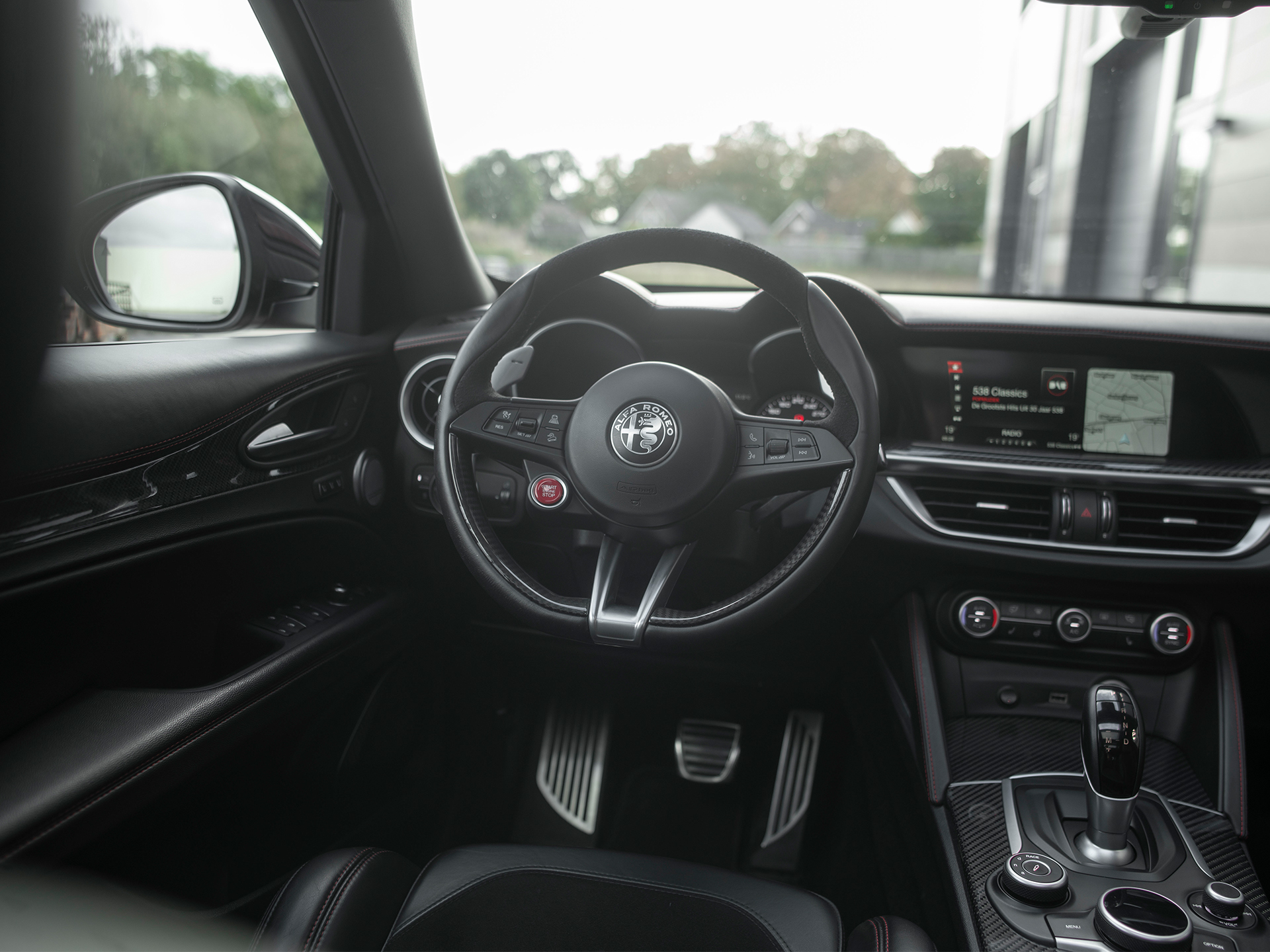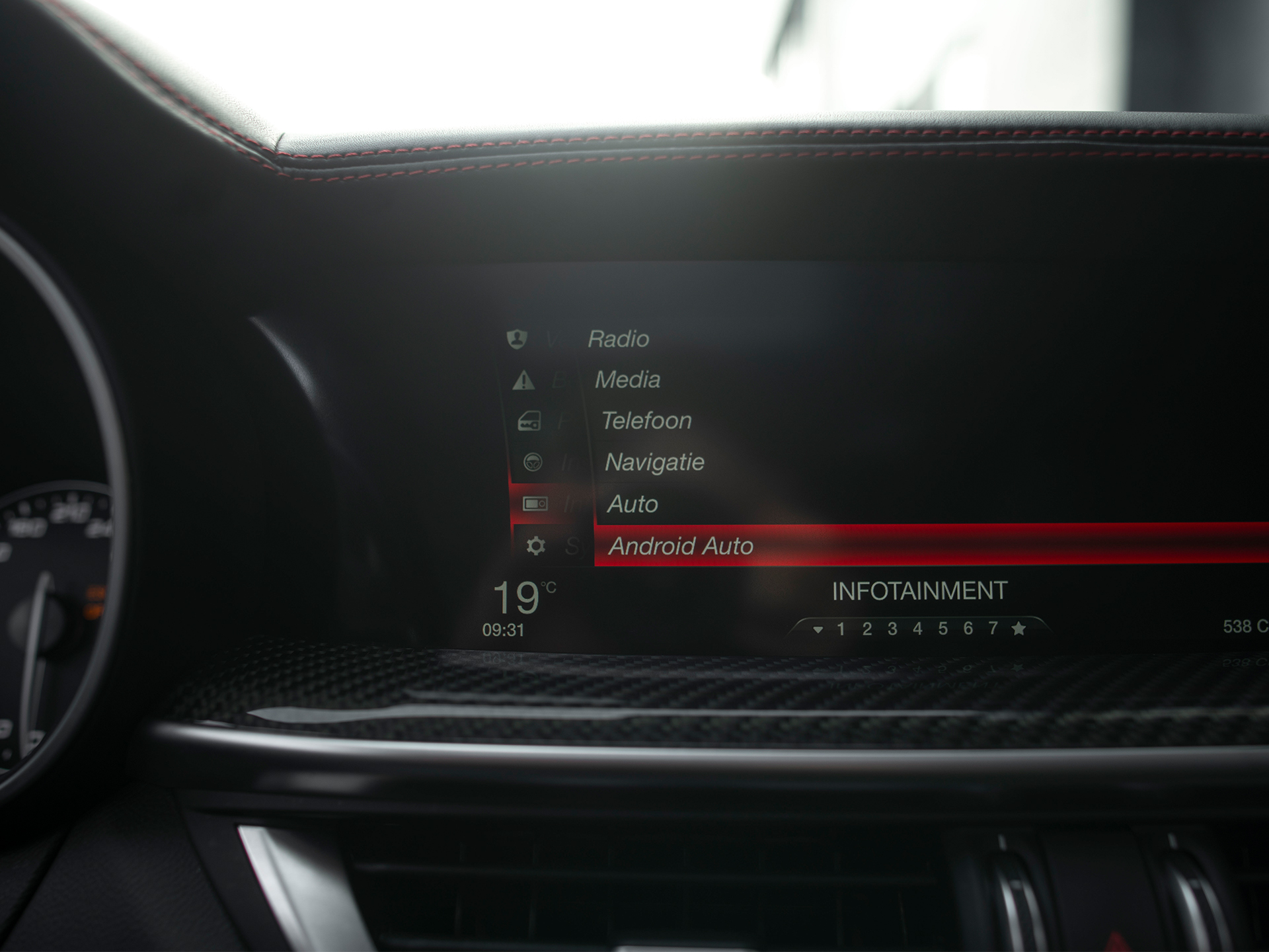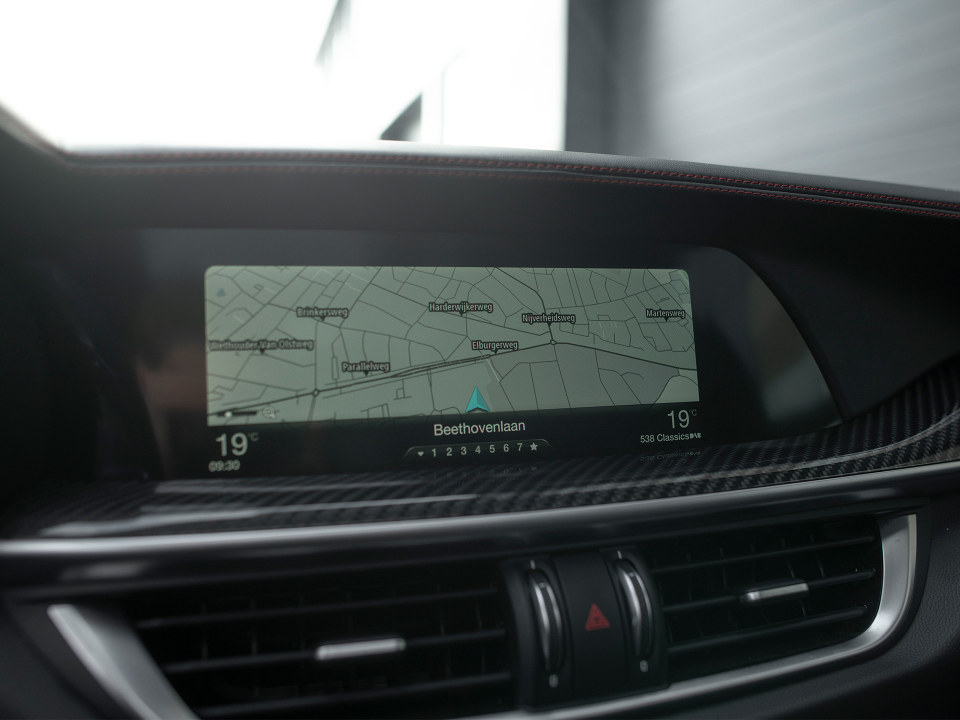 Carbon panelen versterken het gevoel in een onvervalste sportauto te zijn gestapt. Onder andere het Alcantara sportstuur bevat een lichtgewicht inleg. De verwarmbare Power Seats verhullen ondertussen niets van de luxe aan boord van de opper-Alfa. Laat staan de hoeveelheid power… Daarnaast beschikt dit bomvolle exemplaar over Adaptive Cruise Control, een elektrisch bedienbaar panoramadak en een Soundpack van Harman Kardon. Klinkt goed? Ja, zeker als u weet dat dit bovenop de standaarduitrusting is, bestaande uit Connect 3D navigatie inclusief CarPlay en 8,8 inch groot touchscreen, Driver Assist Plus, dimmende spiegels binnen en buiten, parkeersensoren voor + achter en een achteruitrijcamera.