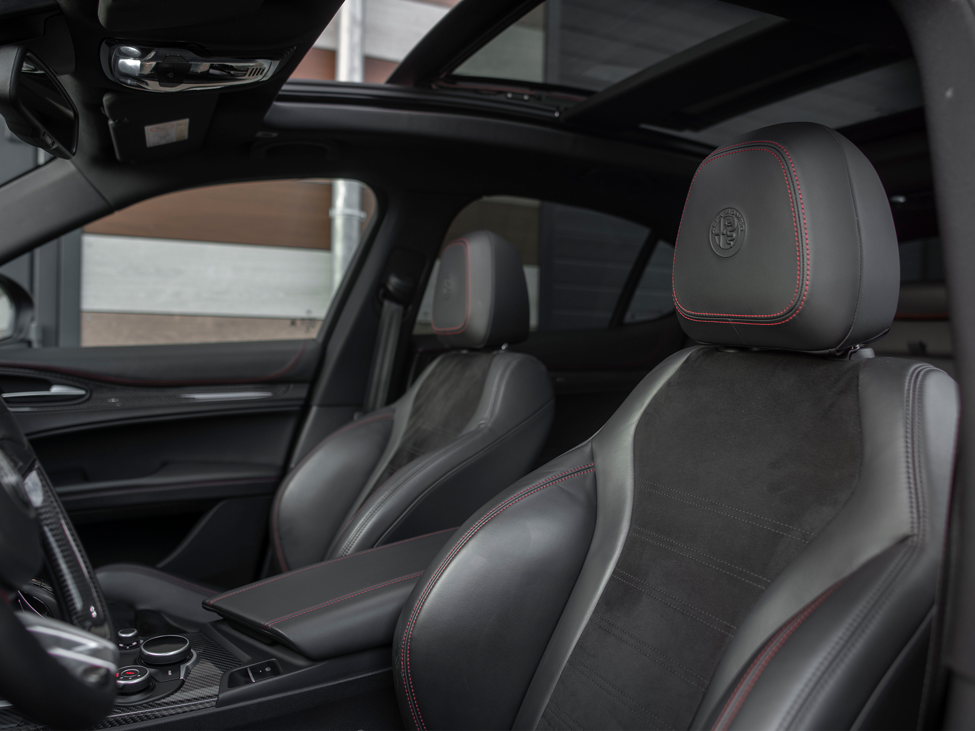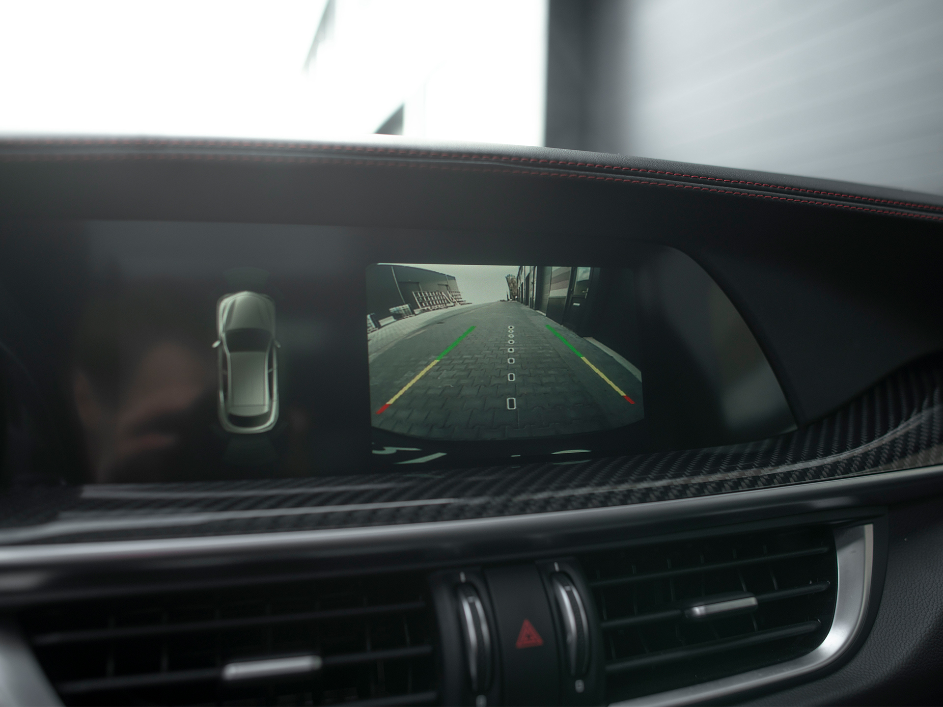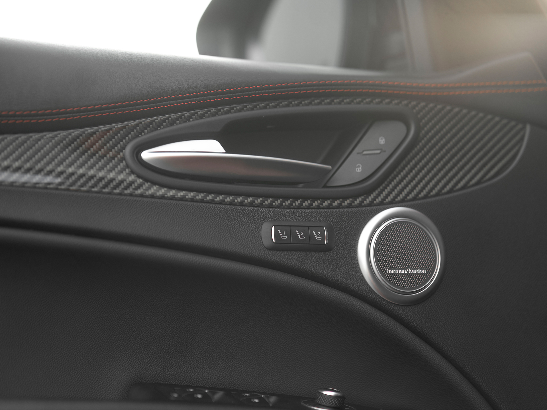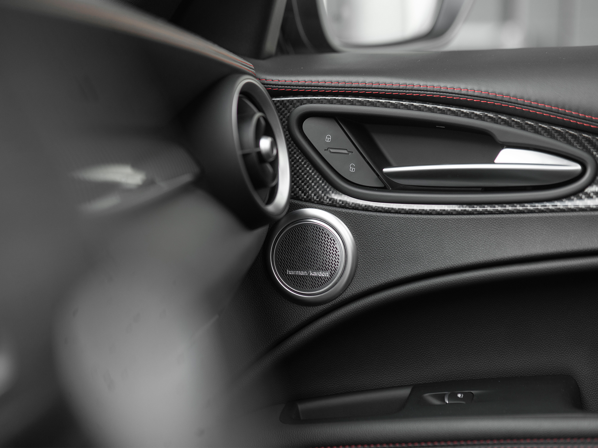 Carbon panelen versterken het gevoel in een onvervalste sportauto te zijn gestapt. Onder andere het Alcantara sportstuur bevat een lichtgewicht inleg. De verwarmbare Power Seats verhullen ondertussen niets van de luxe aan boord van de opper-Alfa. Laat staan de hoeveelheid power… Daarnaast beschikt dit bomvolle exemplaar over Adaptive Cruise Control, een elektrisch bedienbaar panoramadak en een Soundpack van Harman Kardon. Klinkt goed? Ja, zeker als u weet dat dit bovenop de standaarduitrusting is, bestaande uit Connect 3D navigatie inclusief CarPlay en 8,8 inch groot touchscreen, Driver Assist Plus, dimmende spiegels binnen en buiten, parkeersensoren voor + achter en een achteruitrijcamera.