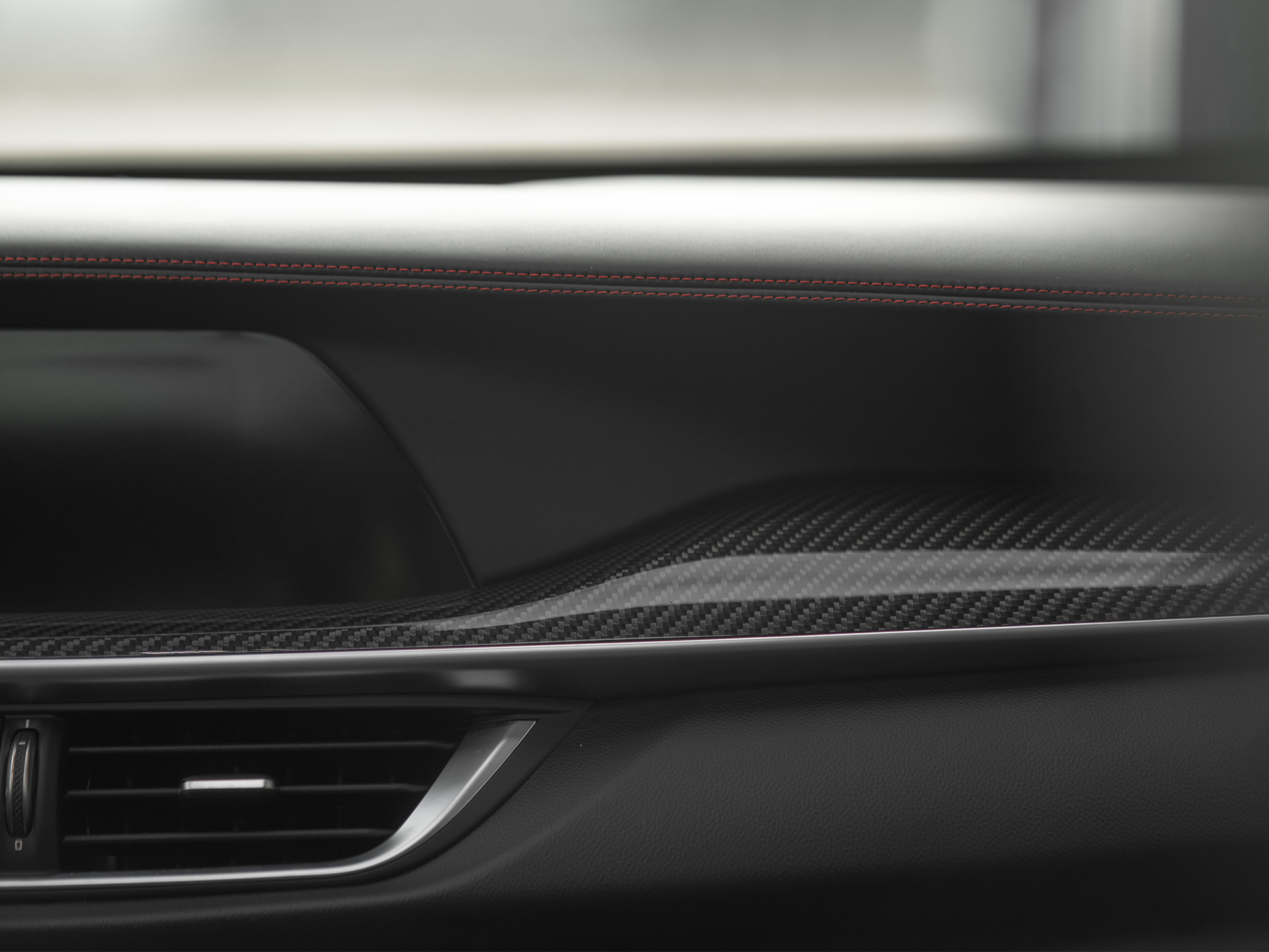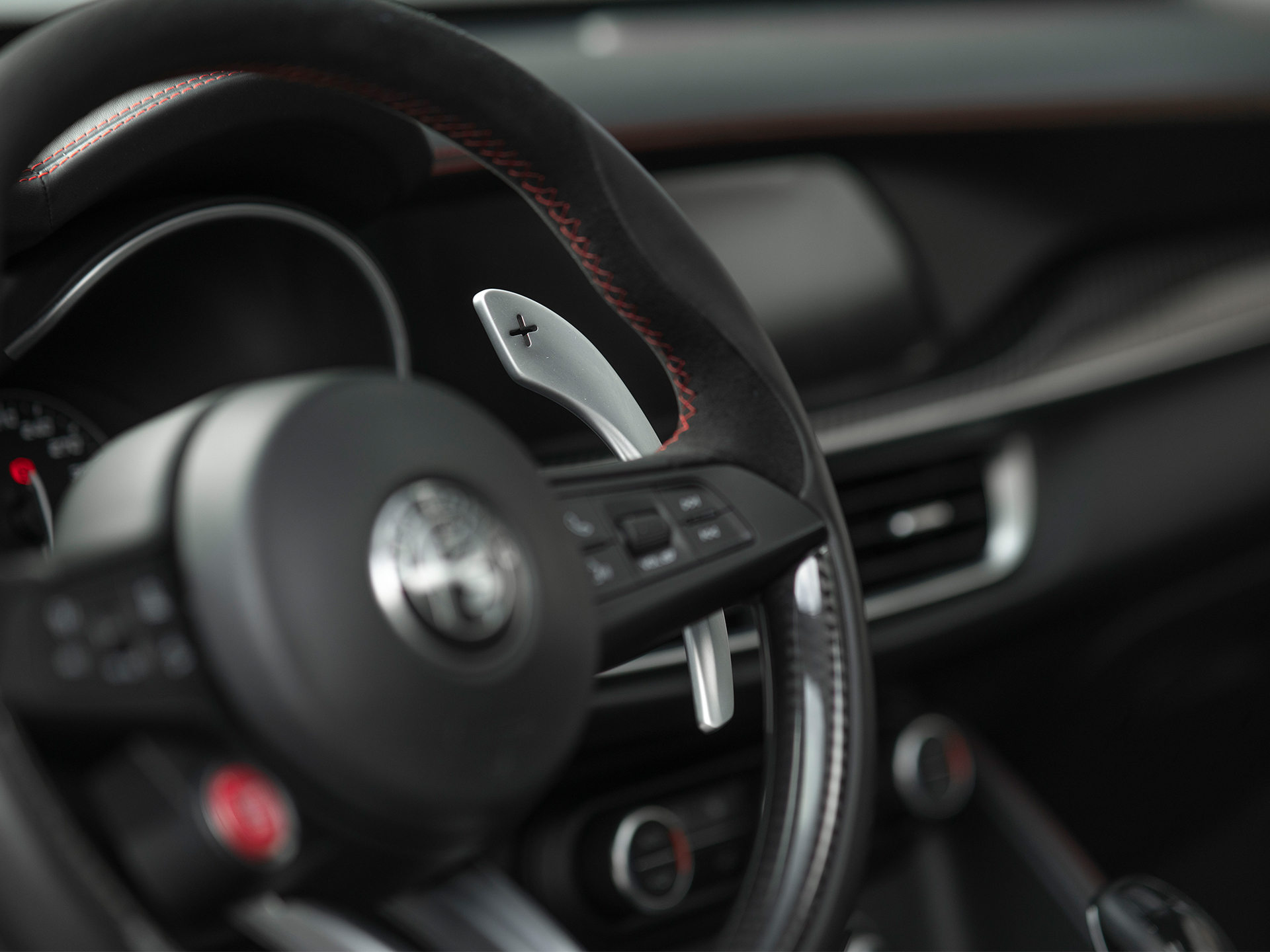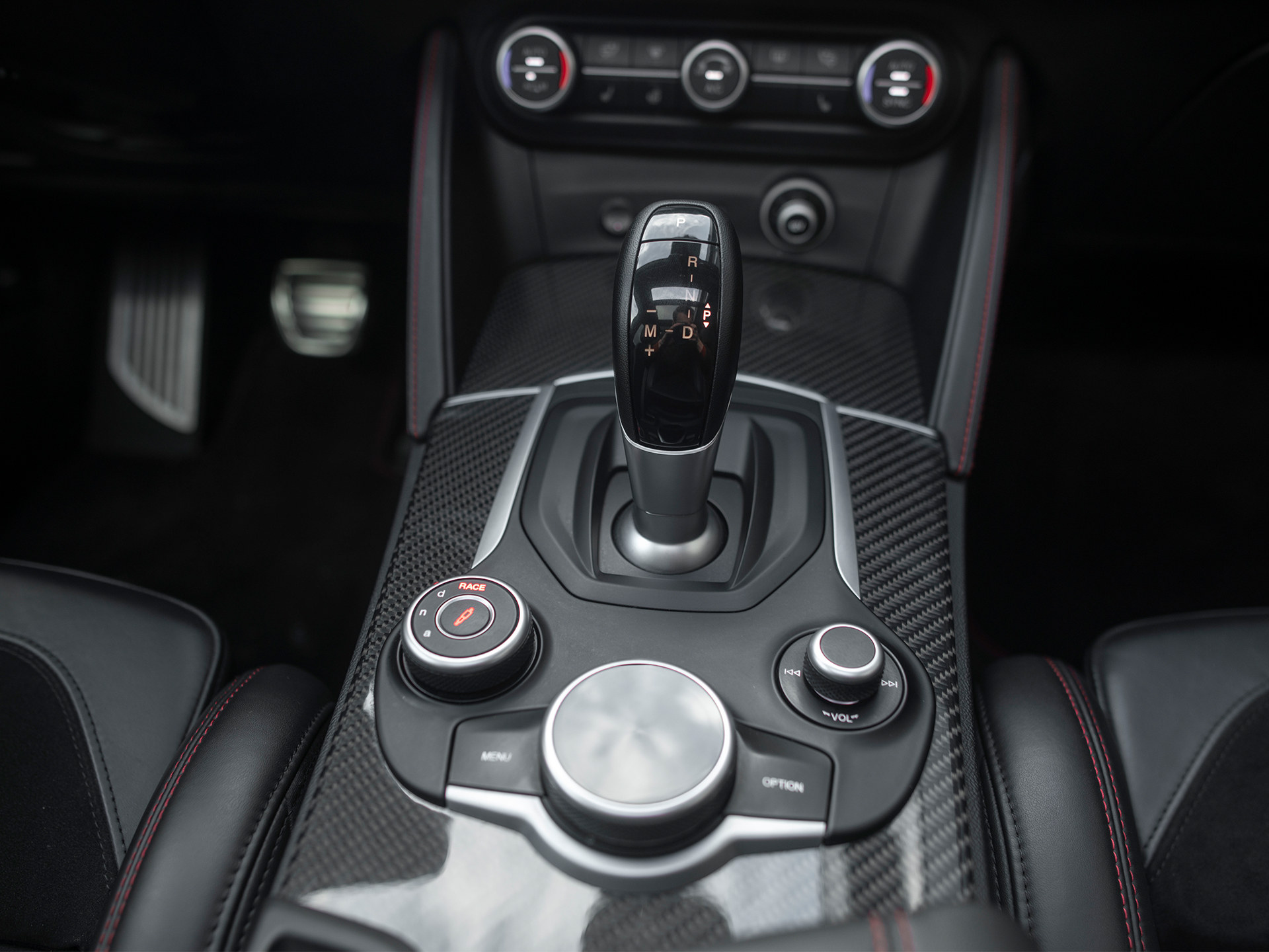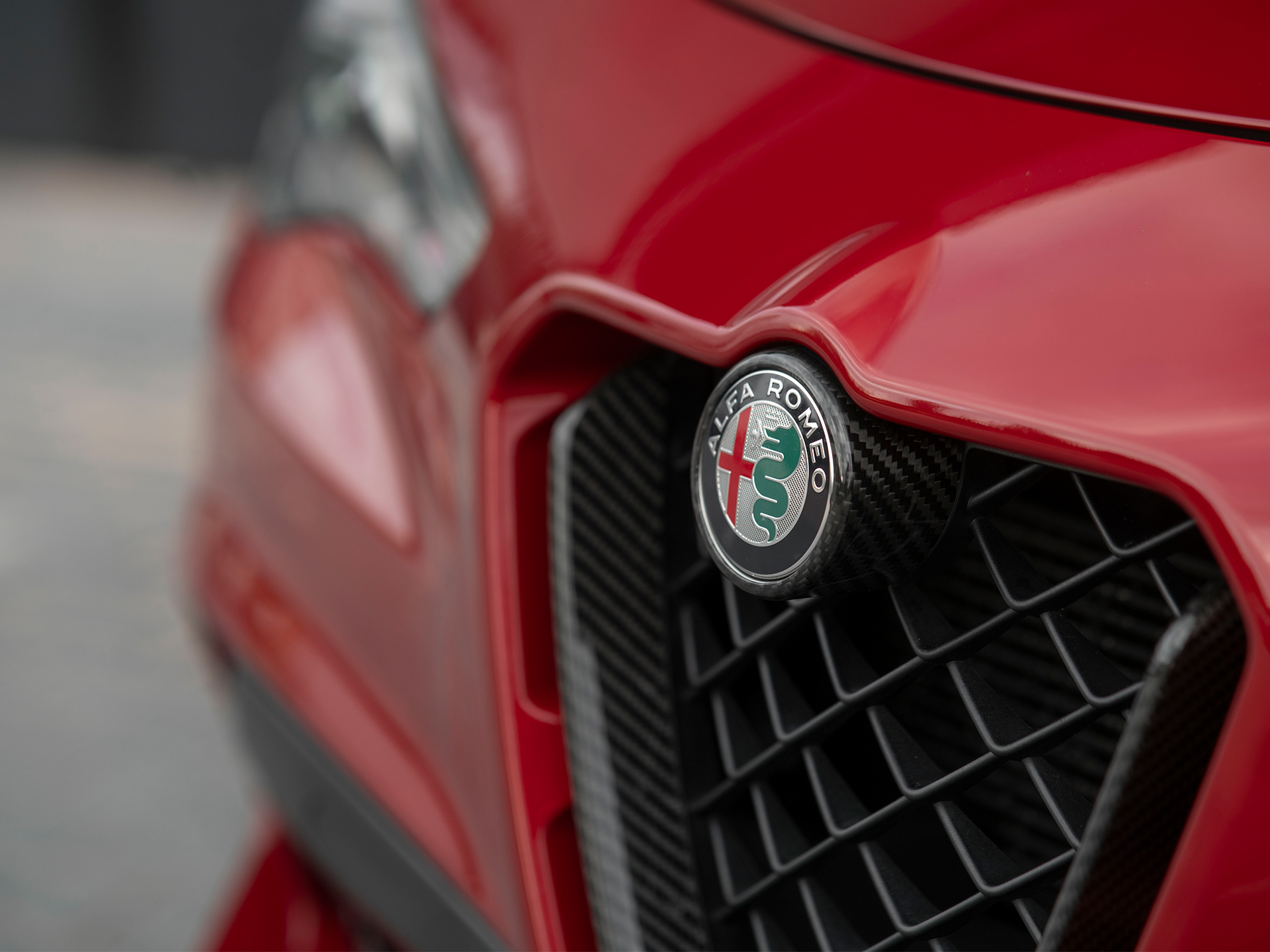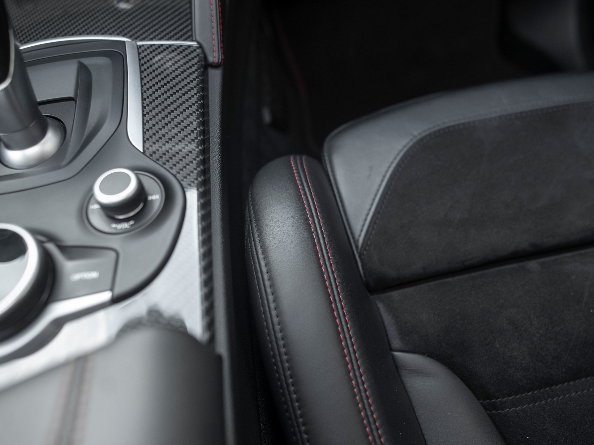 Carbon panelen versterken het gevoel in een onvervalste sportauto te zijn gestapt. Onder andere het Alcantara sportstuur bevat een lichtgewicht inleg. De verwarmbare Power Seats verhullen ondertussen niets van de luxe aan boord van de opper-Alfa. Laat staan de hoeveelheid power… Daarnaast beschikt dit bomvolle exemplaar over Adaptive Cruise Control, een elektrisch bedienbaar panoramadak en een Soundpack van Harman Kardon. Klinkt goed? Ja, zeker als u weet dat dit bovenop de standaarduitrusting is, bestaande uit Connect 3D navigatie inclusief CarPlay en 8,8 inch groot touchscreen, Driver Assist Plus, dimmende spiegels binnen en buiten, parkeersensoren voor + achter en een achteruitrijcamera.