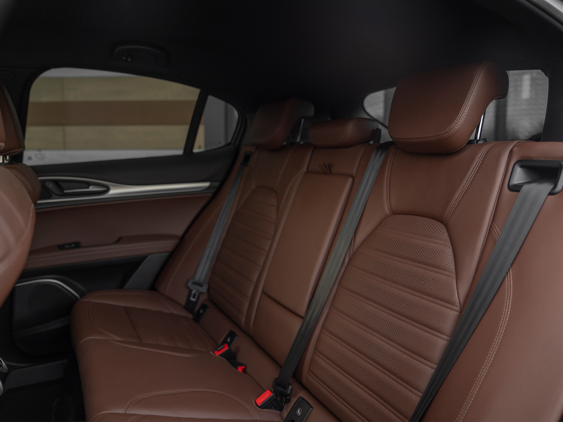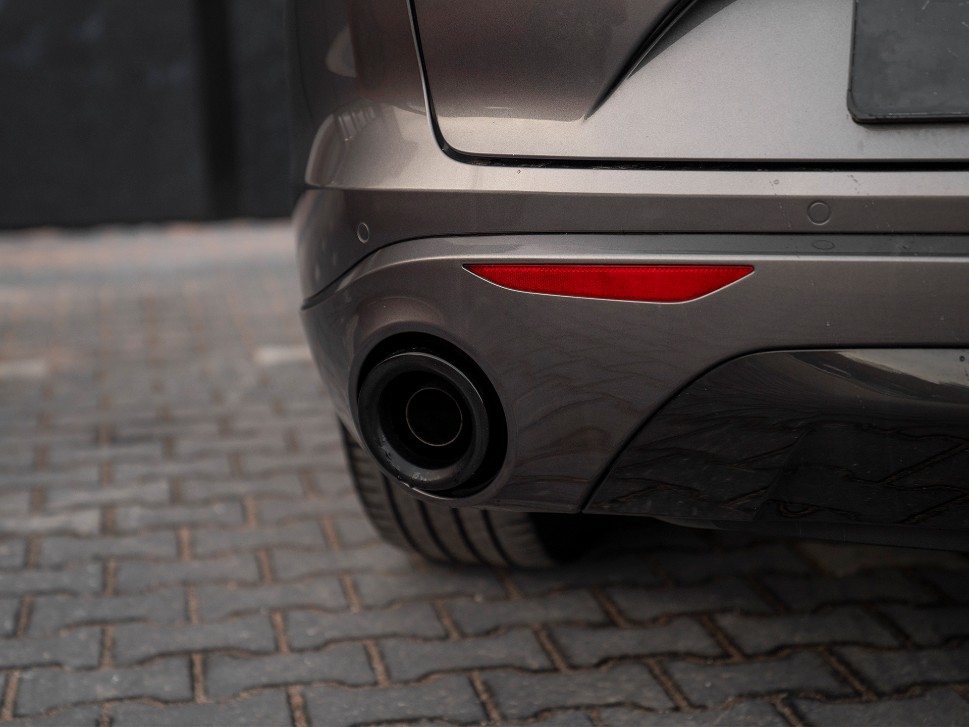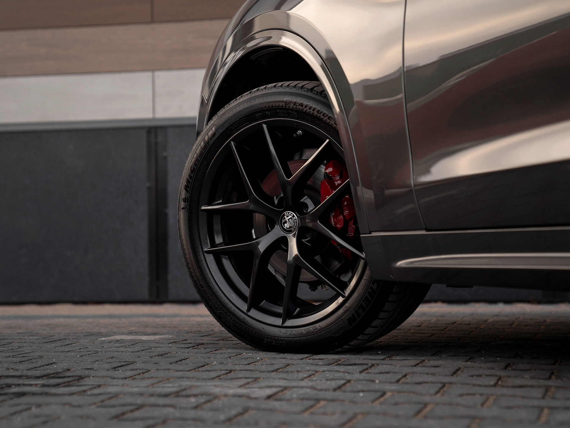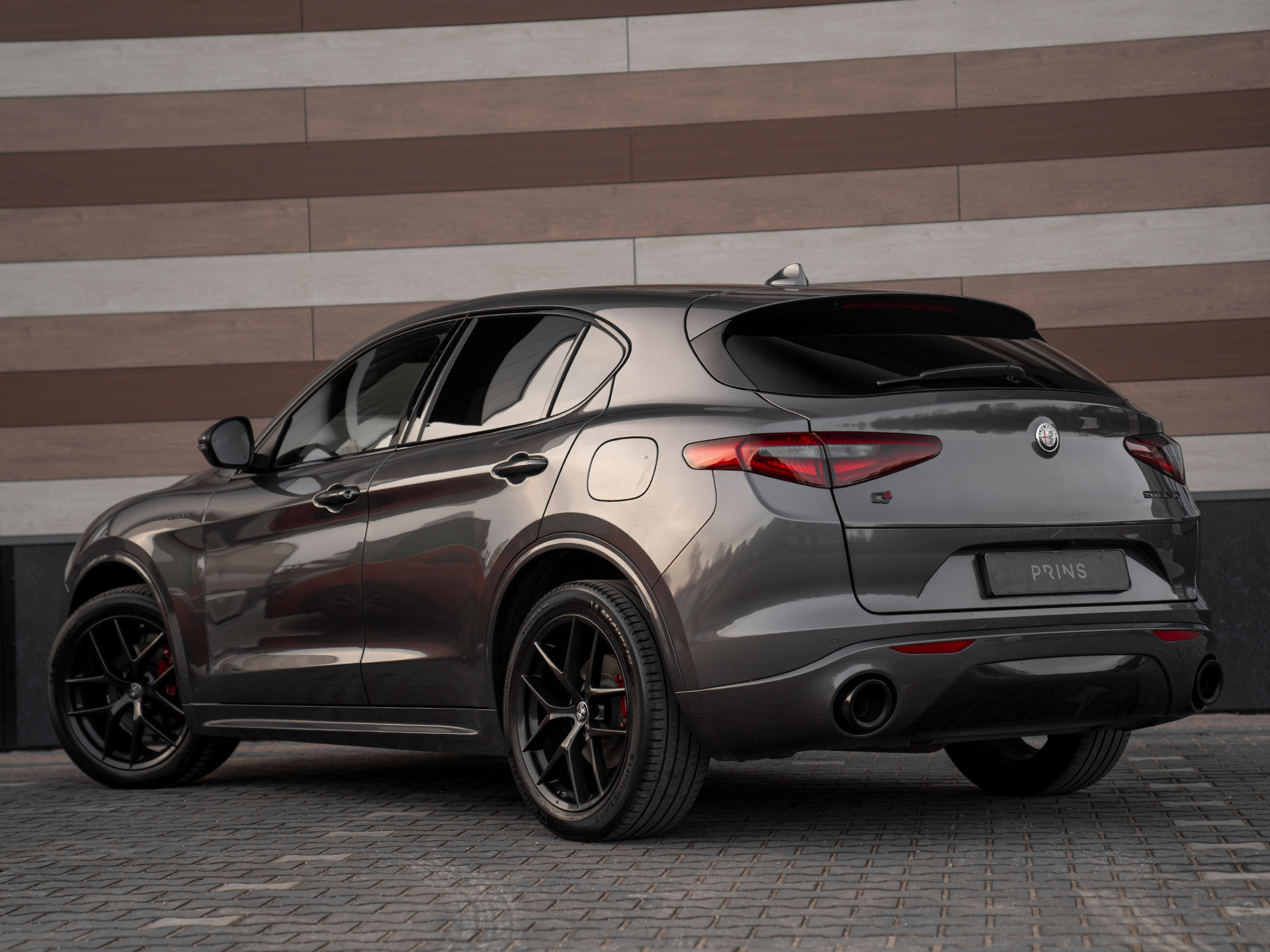 Precies zoals wij hem het liefst zien: de Stelvio 280pk Veloce in het Grigio Vesuvio. 20 inch velgen, een compleet Black Pack en rode remklauwen die de power van deze Veloce benadrukken zijn ook part of the deal.