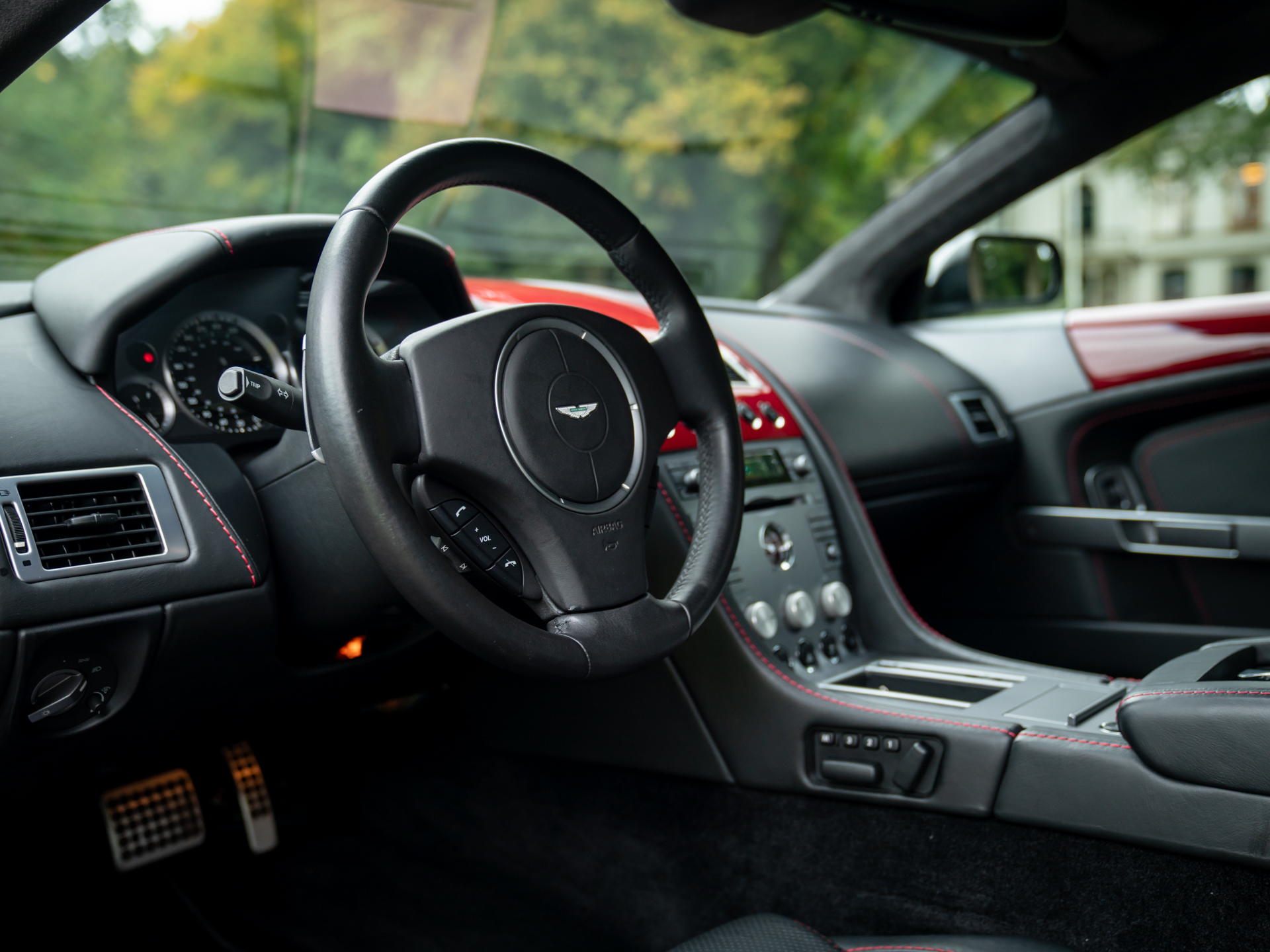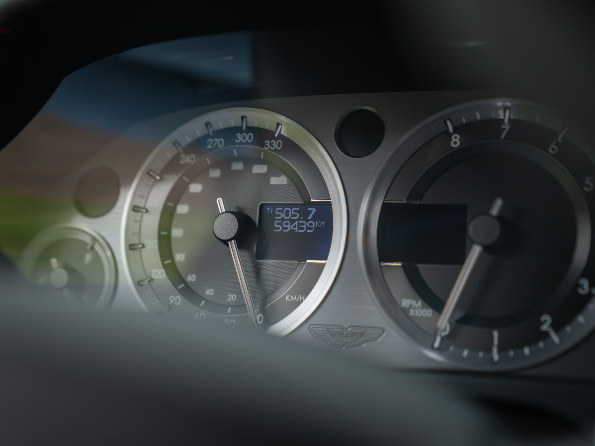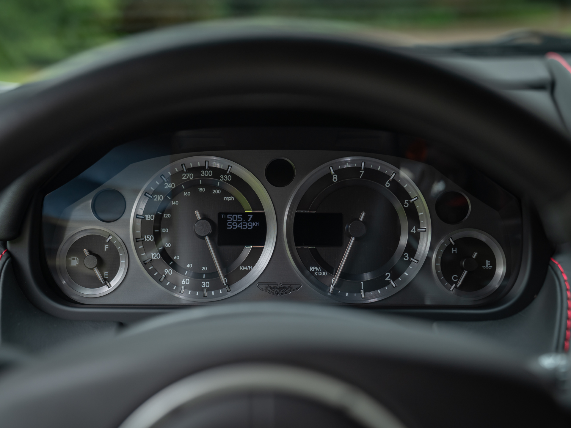Ook helder zijn de achterlichten, Bright Front Grille, Magnum Silver Meshes en 19 inch grote aluminium velgen voorzien van een Diamond Turned Finish. Achter de dubbele 5-spaaks wielen schuilen rode remklauwen. In onze fantasie refereren die aan de rood opgloeiende schijven van de DBR9 in het heetst van de strijd. De rode badge achterop met daarop de contouren van het circuit laat er geen twijfel over bestaan dat er met deze AM DB9 V12 iets bijzonders aan de hand is.