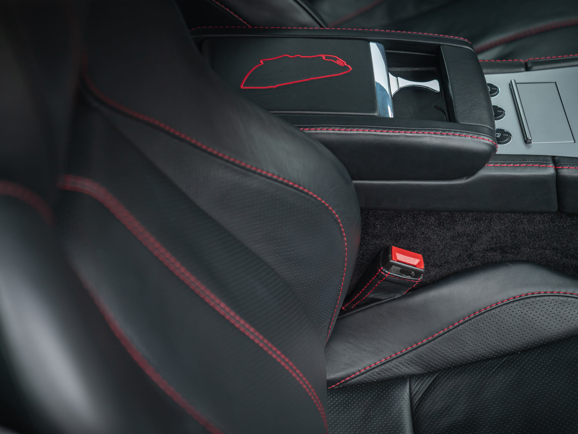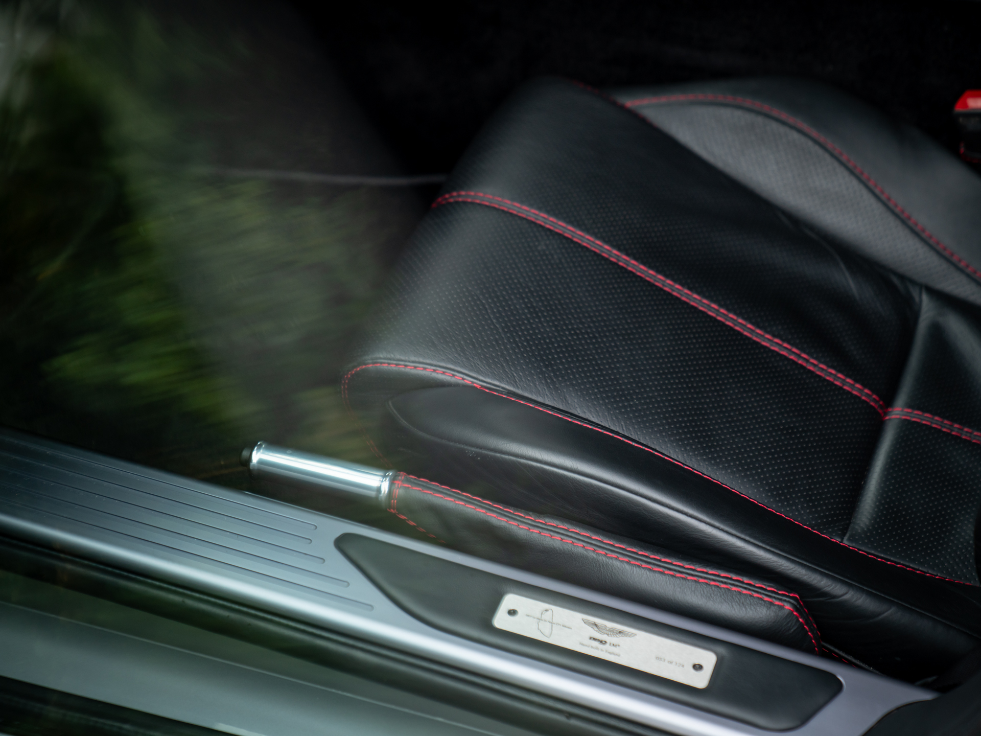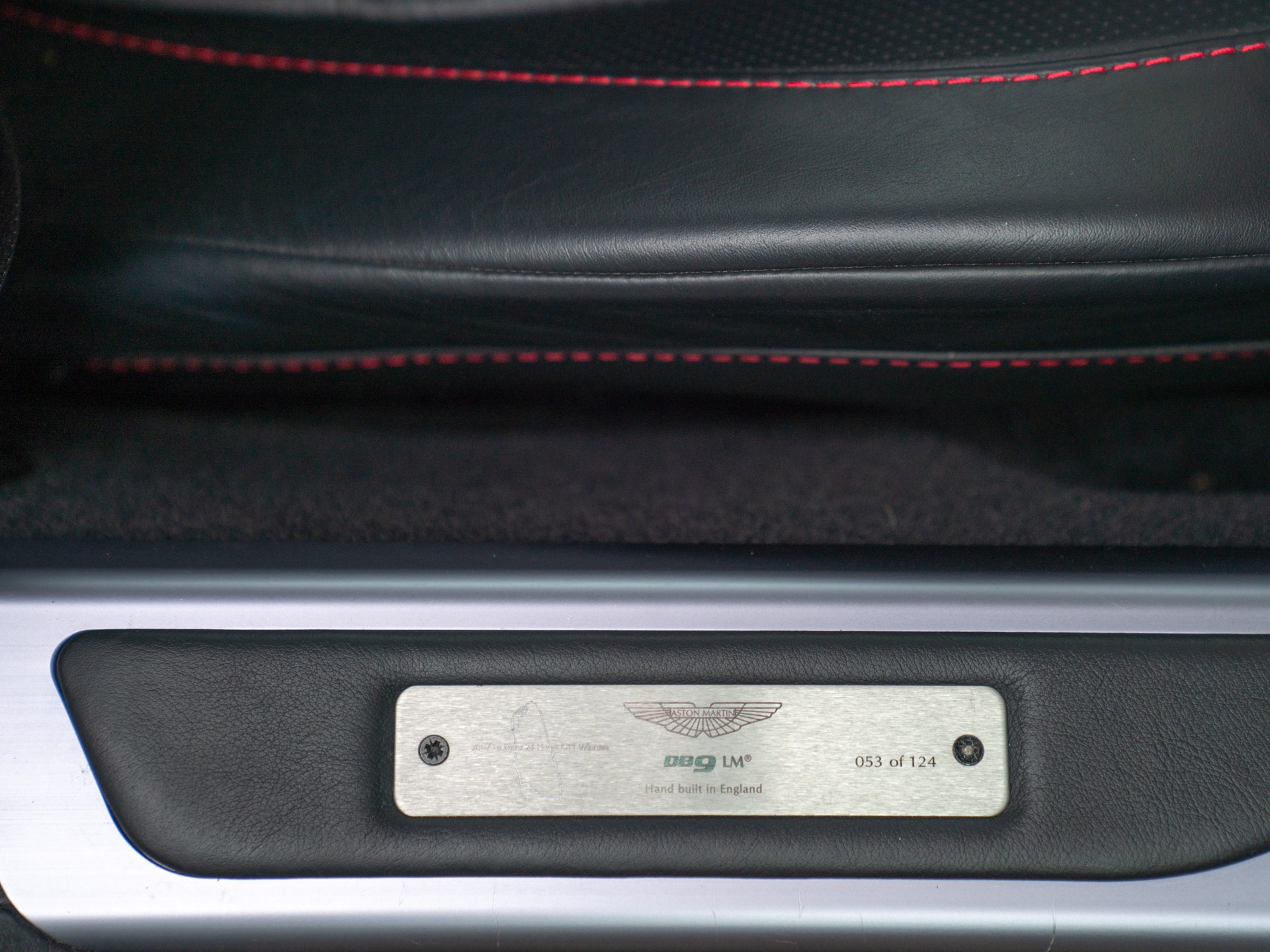 De unieke accenten zetten zich als een rode draad voort aan boord van de Aston Martin DB9 LM. Letterlijk. Zo zijn aan de Obsidian Black lederen delen contrasterende stiksels toegevoegd in de kleur rood. En geloof ons: dat zijn er veel. Het leder op de stoelen is van het geperforeerde soort en de middenarmsteun bevat een rood gestikte circuit lay-out. Nóg meer rood is er in de vorm van een Tertre Rouge afwerking op het dashboard en bovenaan de portieren. Een naam die eveneens gelinkt is aan het fameuze Franse circuit; het gaat om een bocht om precies te zijn. Tot slot is de hemelbekleding in dit geval uitgevoerd in Tailors Grey en is de dorpellijst uitgerust met een genummerde badge – mocht u zoeken naar dat beetje extra bevestiging van de beperkte oplage waarin de AM DB9 Le Mans geproduceerd is…