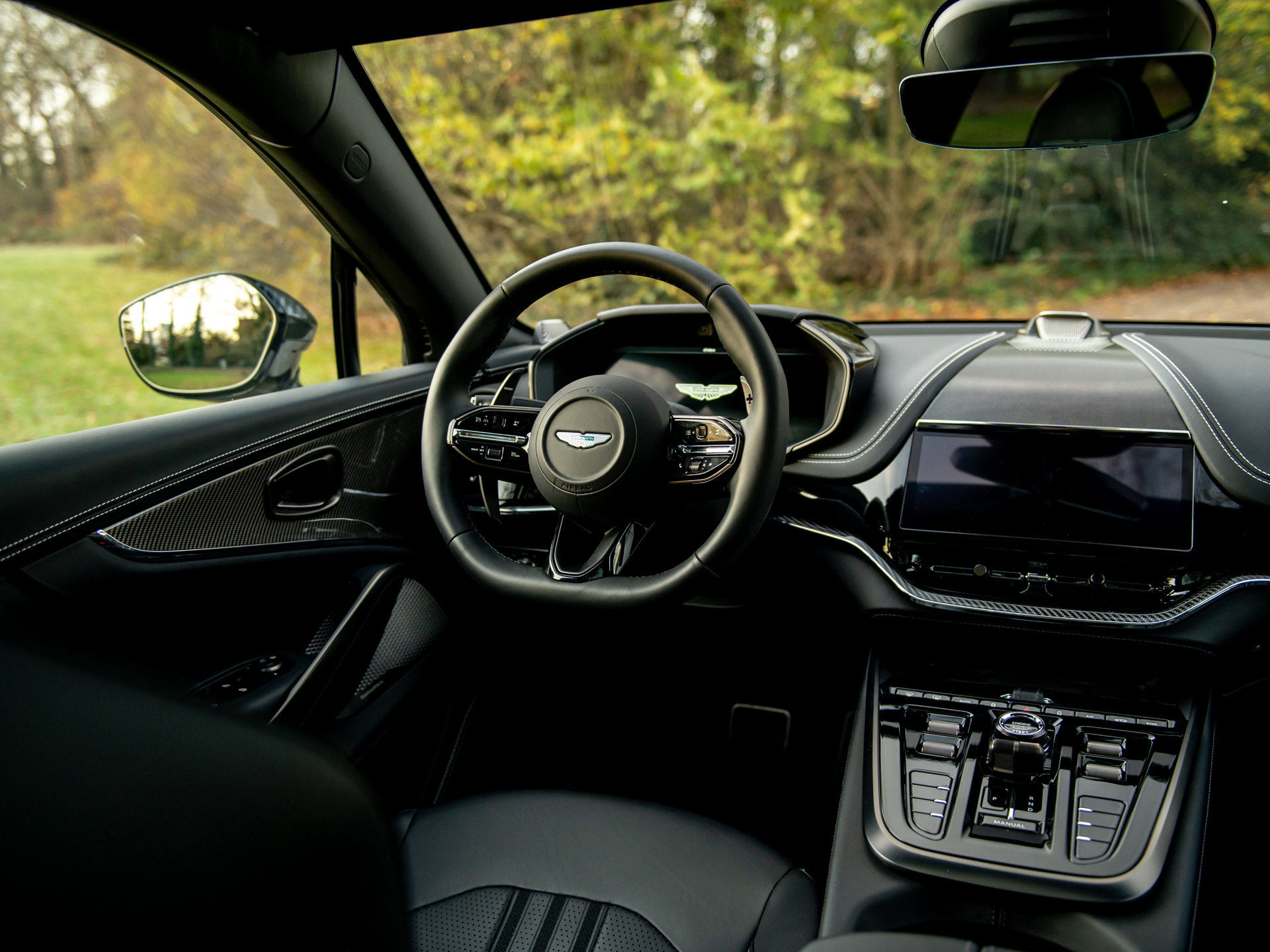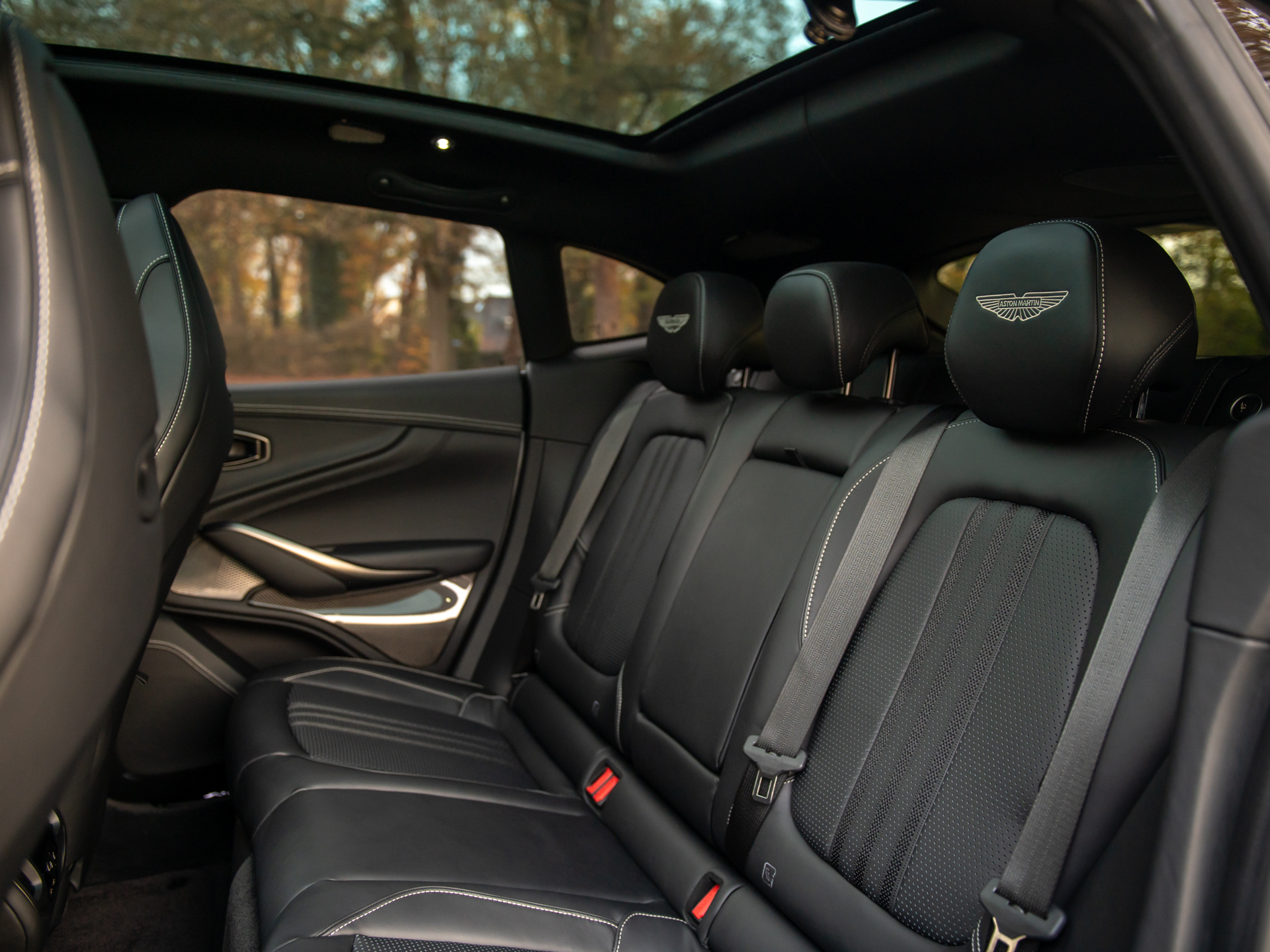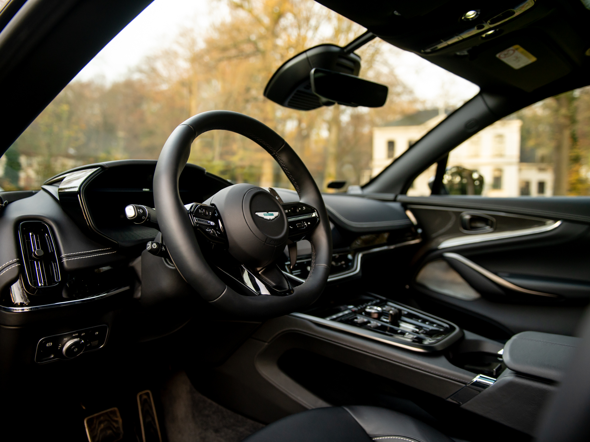 Dat de Performance-SUV van Aston Martin uitnodigt om hard te gaan, wordt eveneens duidelijk bij het aanschouwen van de Sports Plus Seats. De fraai geconstrueerde sportstoelen zijn speciaal ontworpen om maximaal in bochten te kunnen leunen en laterale krachten vakkundig op te kunnen vangen. De Onyx Black lederen finish ademt één en al kwaliteit, maar de Satin Dark Chrome Interior Jewelery Pack maakt de cockpit pas écht high-end. Net als aan de buitenkant, beschikt de binnenkant over racy details. De Gloss Twill Carbon Fiber Trim Inlay doet hightech – echter vooral ook smaakvol aan. Het beschikt namelijk over dezelfde diepe glans als de zwarte elementen aan boord van de DBX. Achter het afgevlakte lederen sportstuur schittert een digitaal instrumentarium, klaar om astronomisch hoge cijfers haarscherp in beeld te brengen. Het centrale display heeft een prominente plek, maar is niet overmatig aanwezig. Dat is toch wel de klasse van Aston Martin, dat zichzelf weer overtroffen heeft met de facelift. Lichte contraststiksels en dito emblemen in de hoofdsteunen zorgen voor de perfecte finishing touch. De verleiding is enorm om met laatstgenoemde telkens weer in contact te komen!