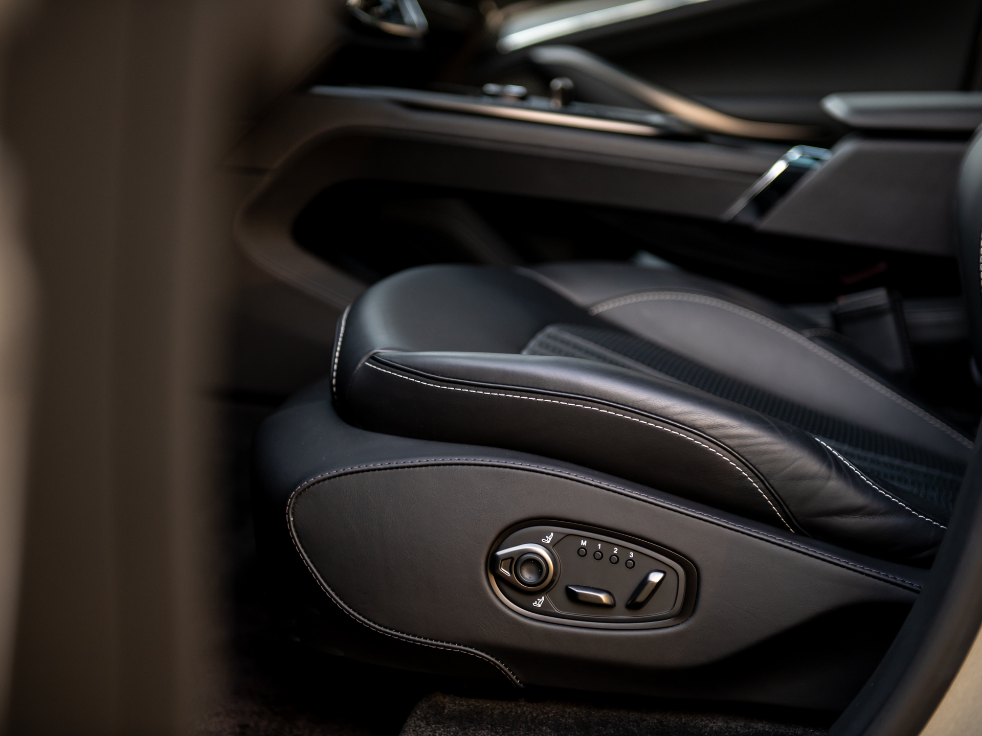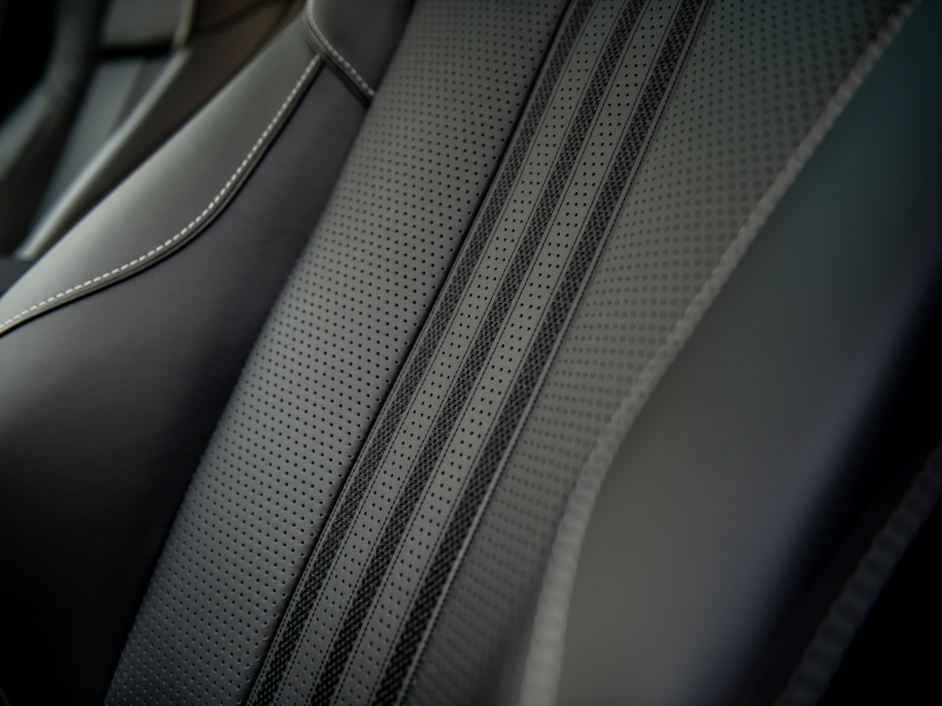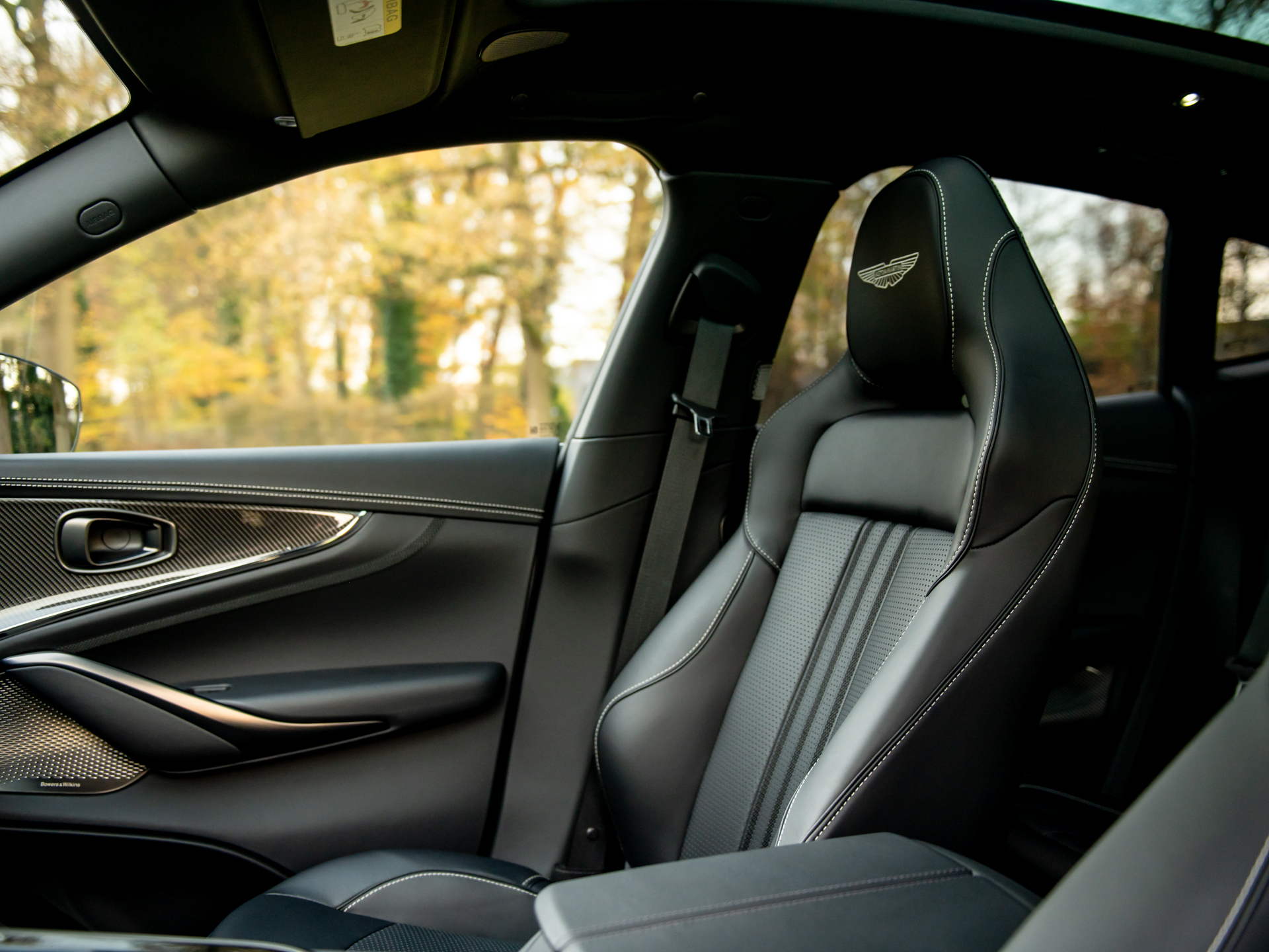 Dat de Performance-SUV van Aston Martin uitnodigt om hard te gaan, wordt eveneens duidelijk bij het aanschouwen van de Sports Plus Seats. De fraai geconstrueerde sportstoelen zijn speciaal ontworpen om maximaal in bochten te kunnen leunen en laterale krachten vakkundig op te kunnen vangen. De Onyx Black lederen finish ademt één en al kwaliteit, maar de Satin Dark Chrome Interior Jewelery Pack maakt de cockpit pas écht high-end. Net als aan de buitenkant, beschikt de binnenkant over racy details. De Gloss Twill Carbon Fiber Trim Inlay doet hightech – echter vooral ook smaakvol aan. Het beschikt namelijk over dezelfde diepe glans als de zwarte elementen aan boord van de DBX. Achter het afgevlakte lederen sportstuur schittert een digitaal instrumentarium, klaar om astronomisch hoge cijfers haarscherp in beeld te brengen. Het centrale display heeft een prominente plek, maar is niet overmatig aanwezig. Dat is toch wel de klasse van Aston Martin, dat zichzelf weer overtroffen heeft met de facelift. Lichte contraststiksels en dito emblemen in de hoofdsteunen zorgen voor de perfecte finishing touch. De verleiding is enorm om met laatstgenoemde telkens weer in contact te komen!