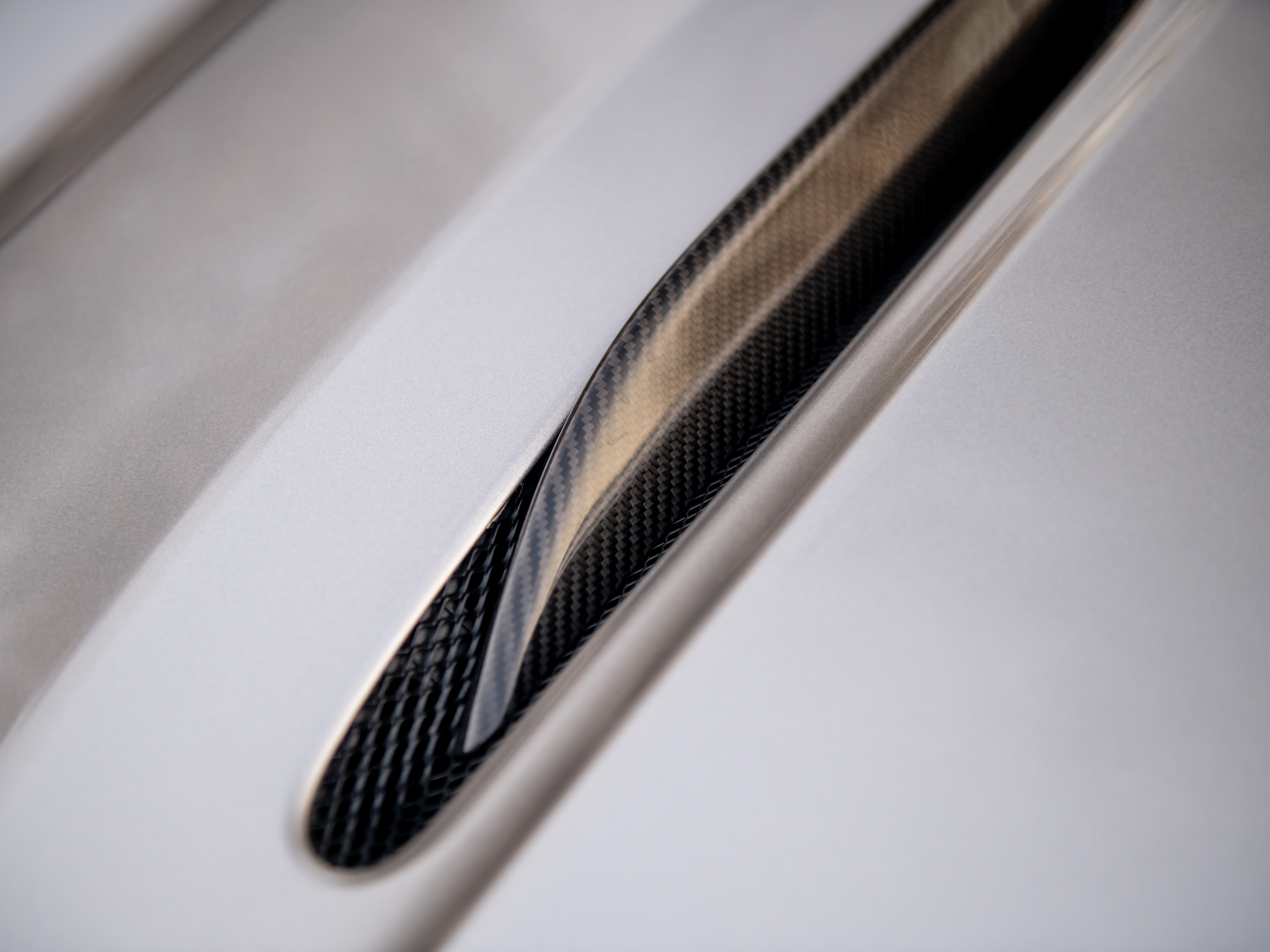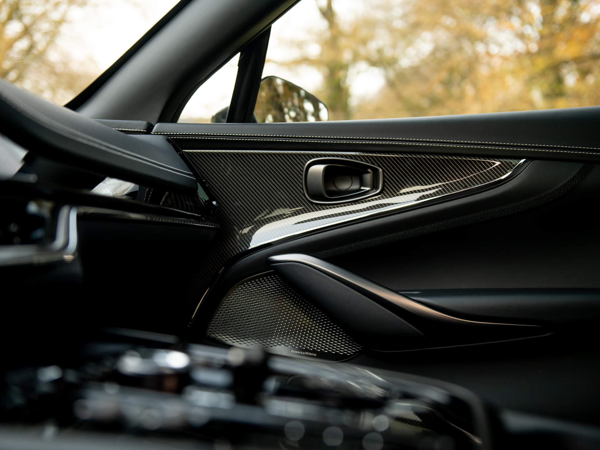 Zilver stijgt hard in waarde. En zo te zien is aluminium de volgende: het charismatische lijnenspel van de Aston Martin DBX komt briljant mooi tot zijn recht in combinatie met het Aluminite Silver lakwerk. In deze tint valt de 707 op, zonder schreeuwerig te worden. Is hij tijdloos, zonder sober te zijn. Maar wat de SUV pas écht spannend maakt, is de toevoeging van een DBX707 Gloss Black Lower Exterior Pack, gecombineerd met een Gloss Twill Carbon Fiber Upper Exterior Pack. Bij laatstgenoemde zijn de carbon fenders in de motorkap en dito spiegelkappen inbegrepen. Om dit geweldige kleurcontrast helemaal af te maken is de Front Grille uitgevoerd in Gloss Black, zijn de logo’s + opschriften zwart, de 23 inch (!) grote velgen van het type “Forged” en is ook het akoestische glas achter donkergetint. Gewoon wauw! De Smoked Rear Lights lijken optisch helemaal op te gaan in het koetwerk, het dak is grotendeels van glas en de Brake Calipers zijn hartstikke Red. Om maar even aan te geven dat de AM DBX 707 over serieuze stopkwaliteiten beschikt. En die komen vooral van pas als…