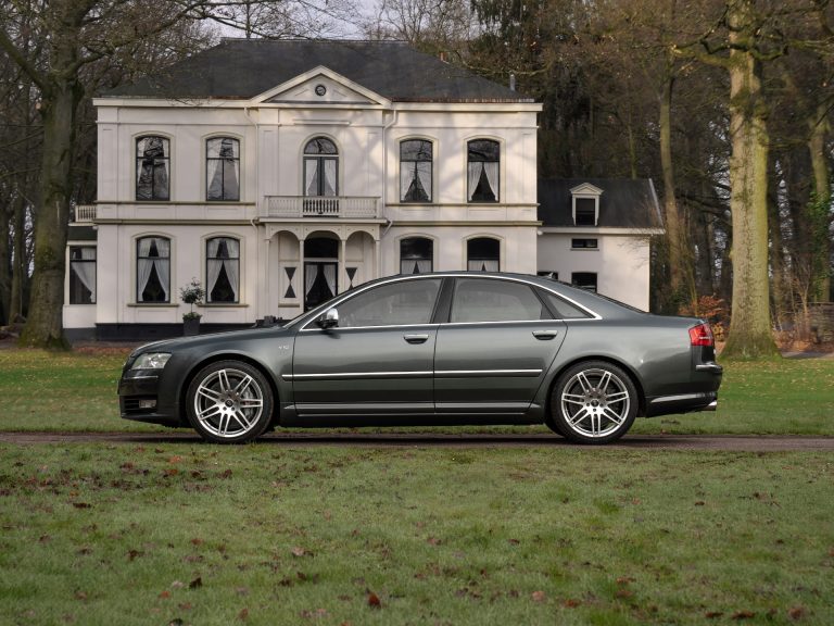 De 2e generatie Audi A8 is misschien wel de best gelukte ooit. Het concept is rond en strak, no-nonsense en vernieuwend tegelijk. De aluminium koets maakt zowel een slanke als een markante indruk dankzij de vele rechte lijnen. De Single Frame Grille beleefde zijn debuut op het faceliftmodel, en daar profiteert deze S8 ook van. Het exterieur is al die jaren mooi onverprutst gebleven en er is zichtbaar veel respect geweest voor het pretentieloze doch elegante design van de tijdloze topklasse Audi Limousine. Bumpers, wielen, sideskirts en natuurlijk de aluminiumkleurige buitenspiegels; het is allemaal typisch Audi Sport en onaangeroerd gebleven.Hetzelfde geldt voor de vele chromen sierlijsten die schitterend bij het Daytona Grey lakwerk afsteken, zoals dat hoort bij een classy 4-deurs sedan van deze stand. Kenners zien daarentegen wel iets anders aan de 2 dubbele uitlaten: de 4 eindstukken zijn recht in plaats van schuin afgesneden. Dit is het gevolg van de montage van een heuse Miltek sportuitlaat. Toegegeven: niet origineel af-fabriek, maar o zo nodig om de beleving van de V10 machine zo ongerept en puur mogelijk over te brengen. Wat ons betreft een absolute must dus!