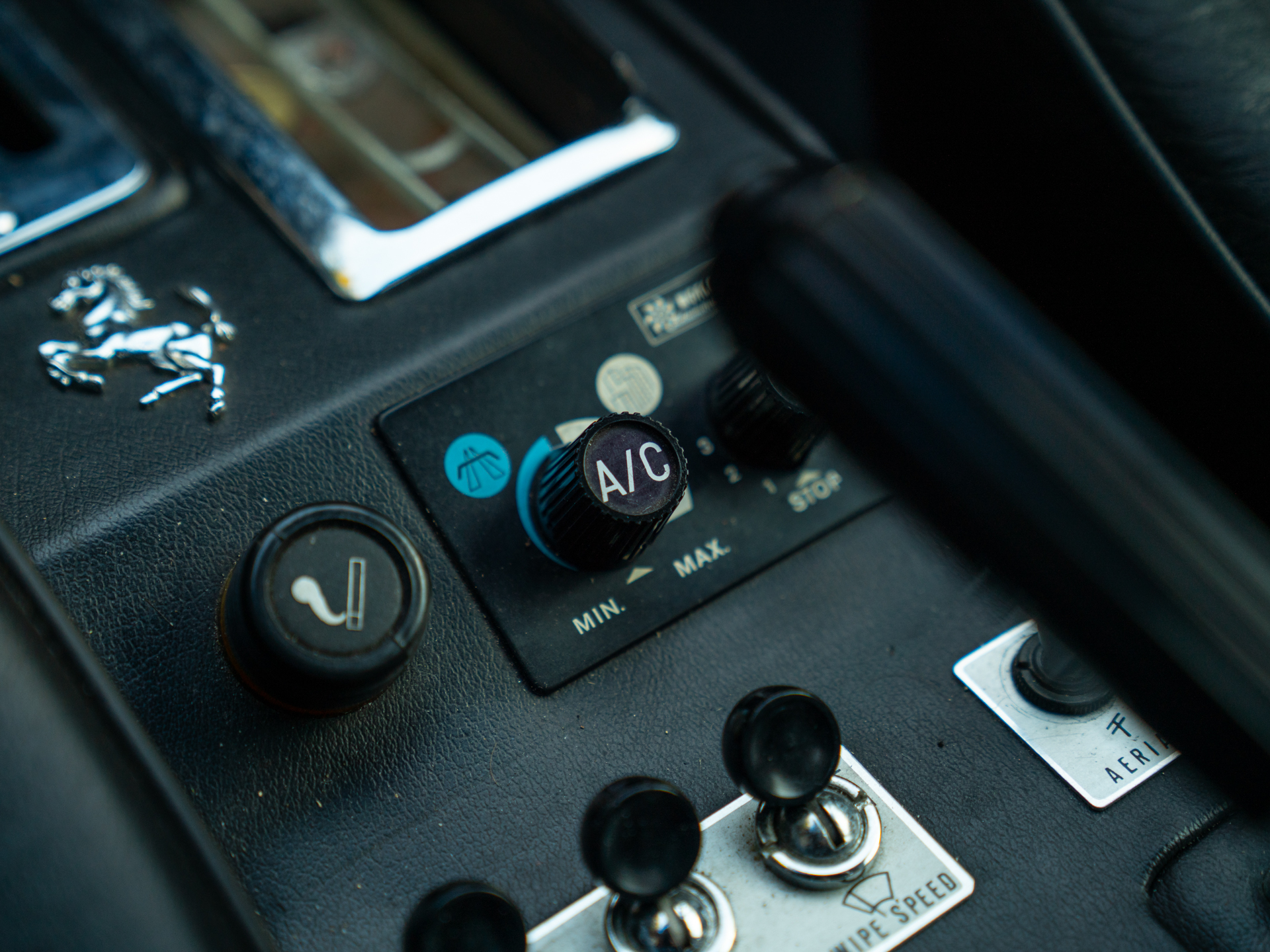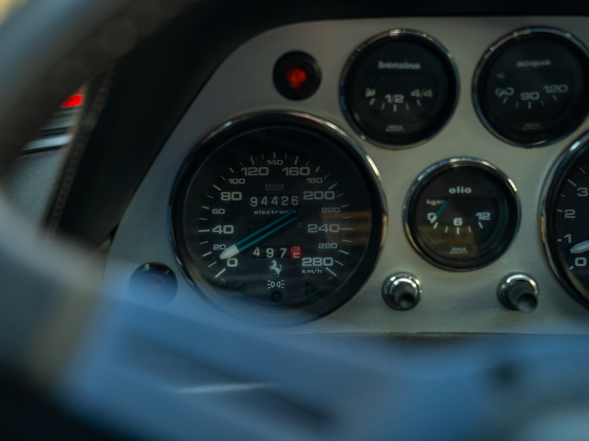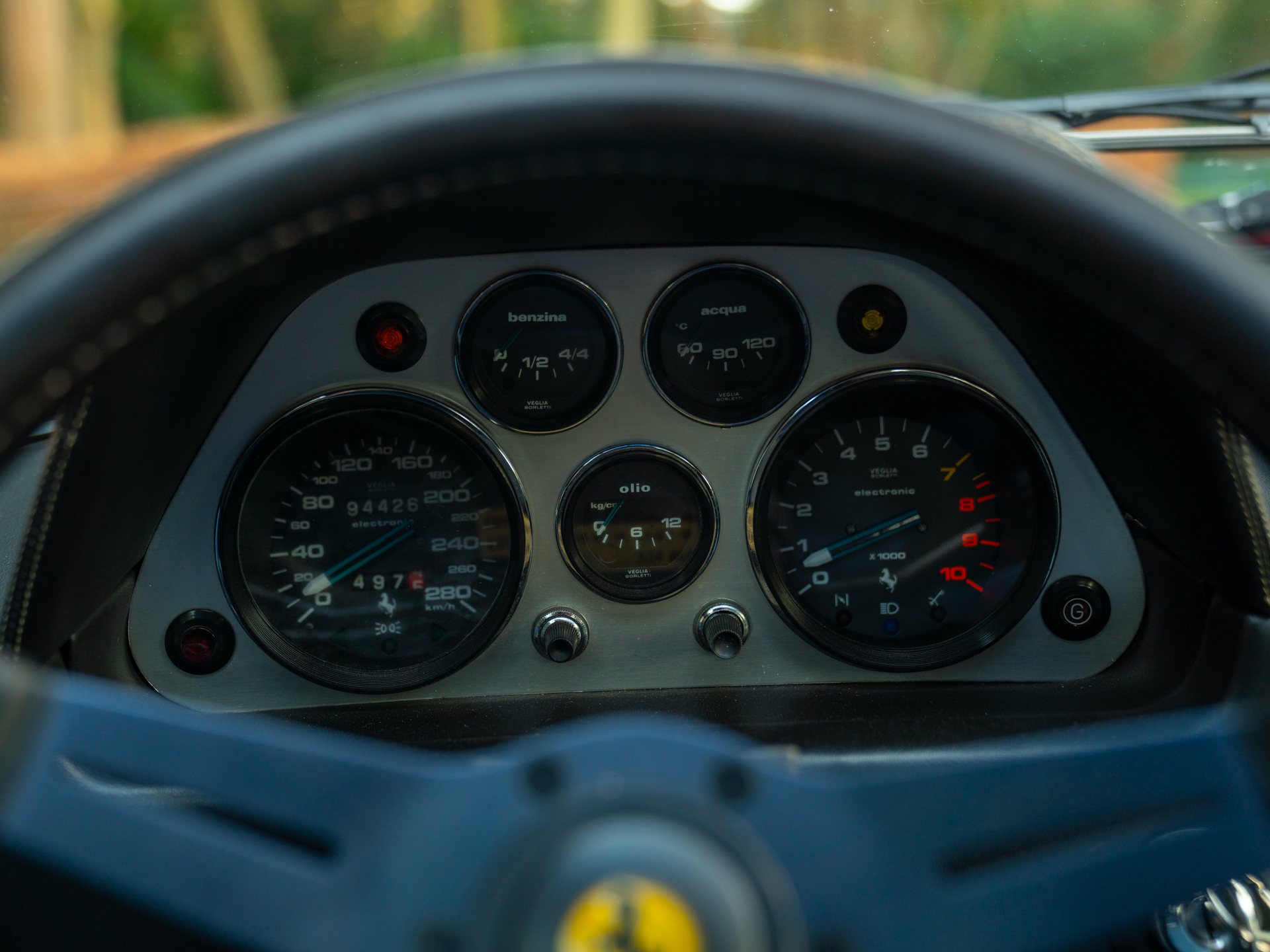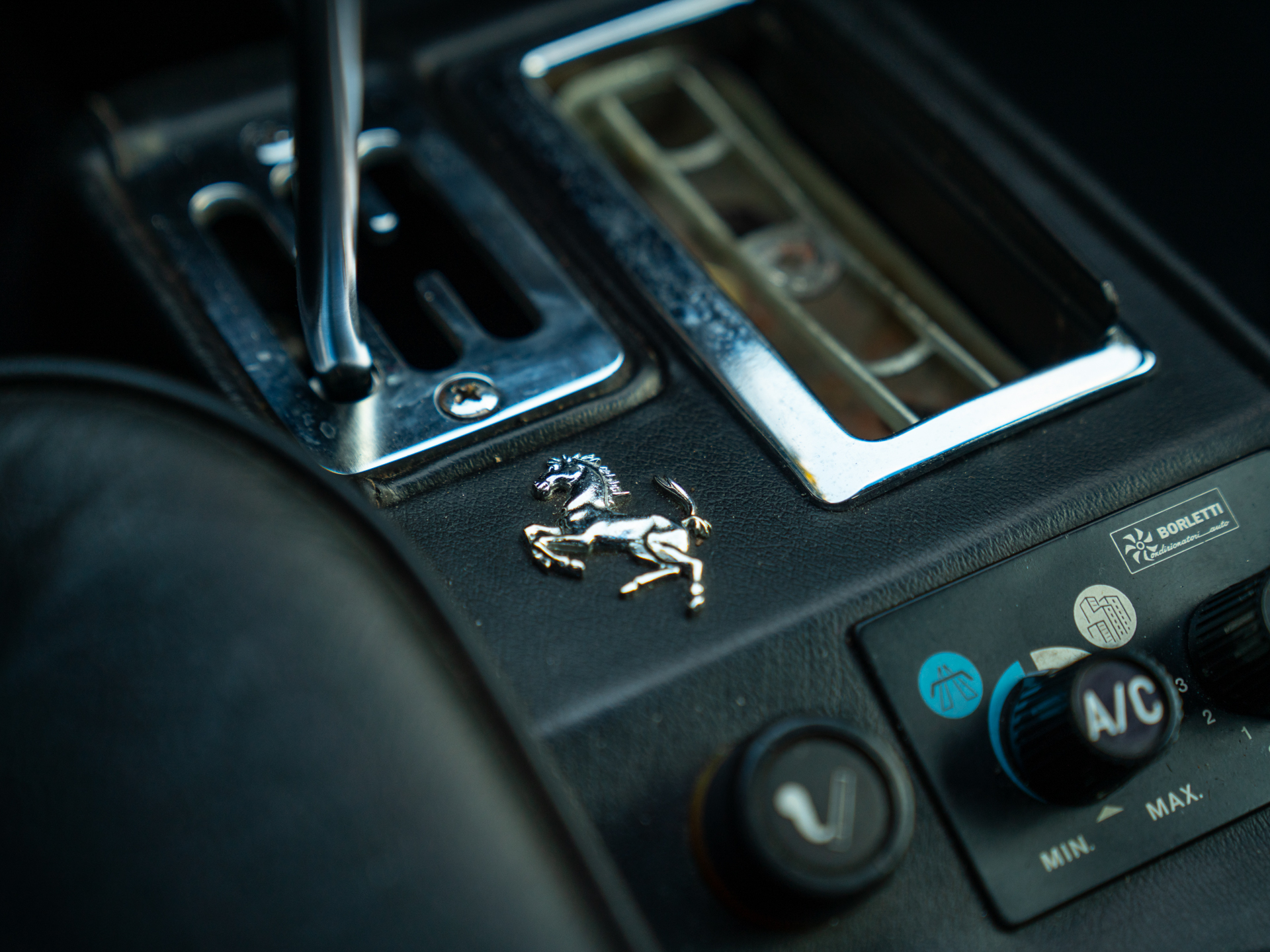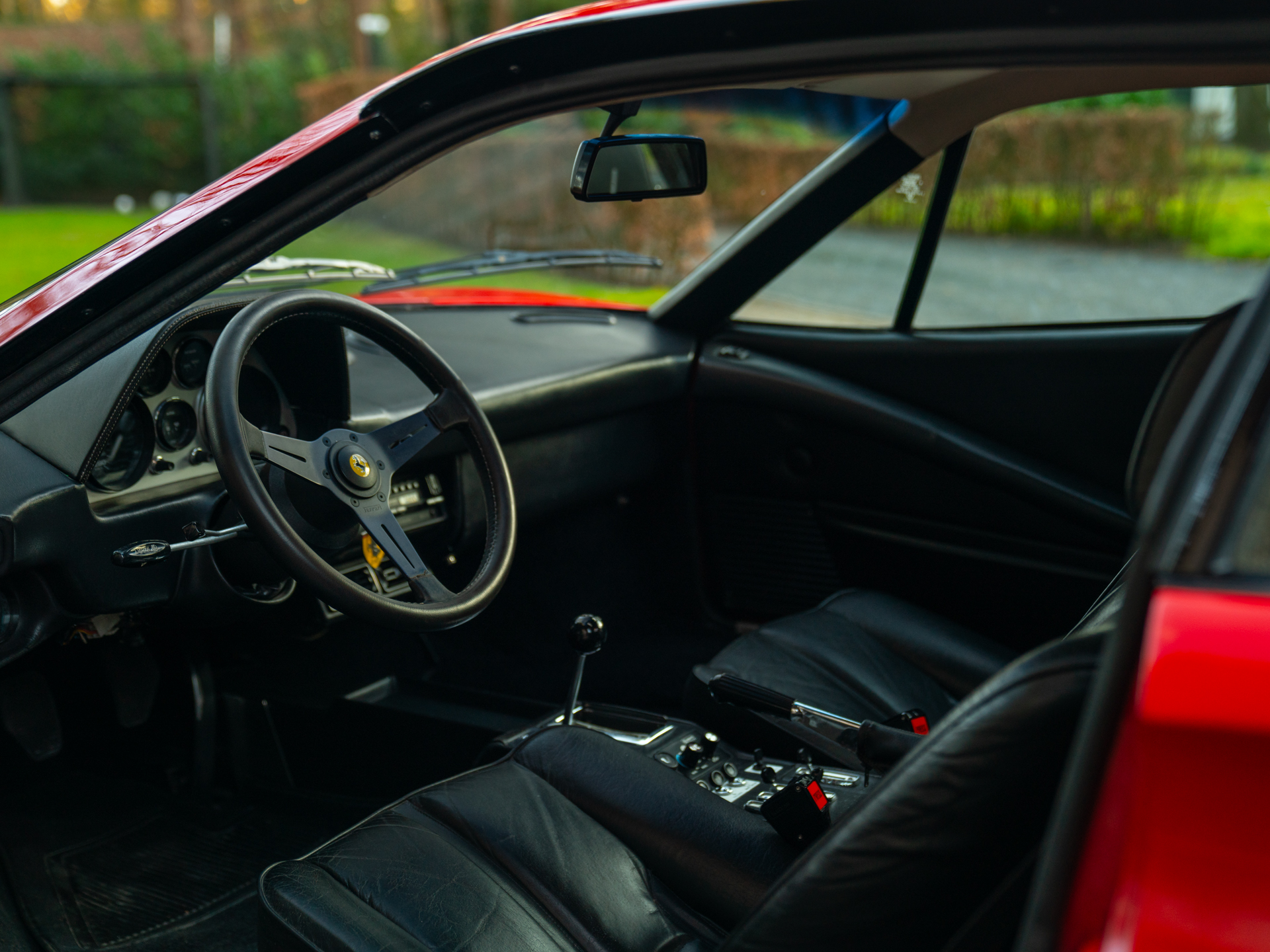 Zitten in de 208 GTB is een waanzinnige ervaring. Alles oogt, voelt en ruikt zoals een klassieker hoort te zijn. Dat elk detail in originele staat verkeert, heeft zeker zijn charme. Kunt u meteen zien dat de oorspronkelijke koper geweldig veel smaak had: het Nero lederen interieur is afgewerkt met lichte contraststiksels bovenlangs het instrumentarium en aan de binnenzijde van het Nardi Ferrari stuurwiel. De hemelbekleding is crème uitgevoerd, maar het zijn de Veglia Borletti meters en tuimelschakelaars die de show pas écht weten te stelen. Nog meer authenticiteit is er in de vorm van een originele Blaupunkt Atlanta SQR22 radio-/cassettespeler. We vragen ons spontaan af hoe vaak Dolce Vita in deze magische cockpit gedraaid zou zijn…