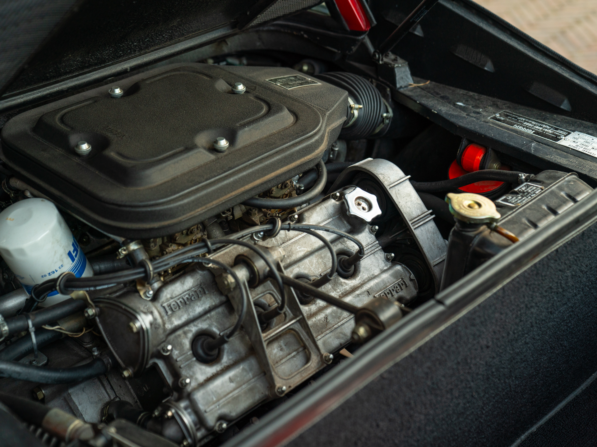 De compacte 2,0 liter Ferrari-V8 beschikt over 4 dubbele Weber carburateurs en is gekoppeld aan een handgeschakelde transmissie. De manuele 5-bak is een kunstwerk om te zien, met zijn schitterend uitgefreesde aluminium coulissen en traditionele H-patroon. De atmosferische 8-cilinder presteert op zijn best bij een toerental van 6.800 tpm, wanneer een totaal van 155 paarden de achteras bereikt. Zelfs naar klassieke Ferrari-maatstaven is dit tamelijk bescheiden te noemen, maar de geluidservaring zegt toch iets anders. Dit raspaard weet moeiteloos alle zintuigen op scherp te zitten. En een bizarre hoeveelheid kippenvel op te wekken! Beleef ’t bij Prins.