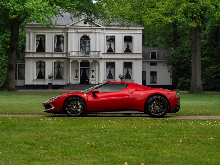 De Rosso Imola carrosseriekleur behoort dus tot Ferrari’s “Special Colours” en de Argento Nurburgring Racing Livery is zo “Historical” als wat. Extra geschiedenis wordt er echter geschreven door het verloop van de lichtgrijze touch: vanaf het voorbumperelement, via de binnenkant van de koplampen, gaat het zilveren hamermotief over in een dubbele striping. Om vervolgens te worden doorgetrokken op het dak + de spoiler achter de carbon (!) motorkap en te eindigen in één groot vlak rondom de grille bij de centrale uitlaat. Achter de peperdure 20 inch lichtgewicht wielen shinen aluminiumkleurige remklauwen die keurig corresponderen met de Racing Livery. Meer koolstofvezel is er in de vorm van carbon front flaps, carbon side skirts, een carbon diffusor en ook de lijst tussen de achterlichten is carbon-made. Scuderia Ferrari Shields op de voorste schermen linken naar zowel vroegere als moderne volbloed machines van het merk met de Prancing Horse. Verder zouden we willen dat het legendarische circuit van Imola altijd zo rood kleurt als deze 296 GTB! Wat een fantastisch mooie lak: fel en stijlvol tegelijkertijd. Kortom, helemaal des Ferrari’s…