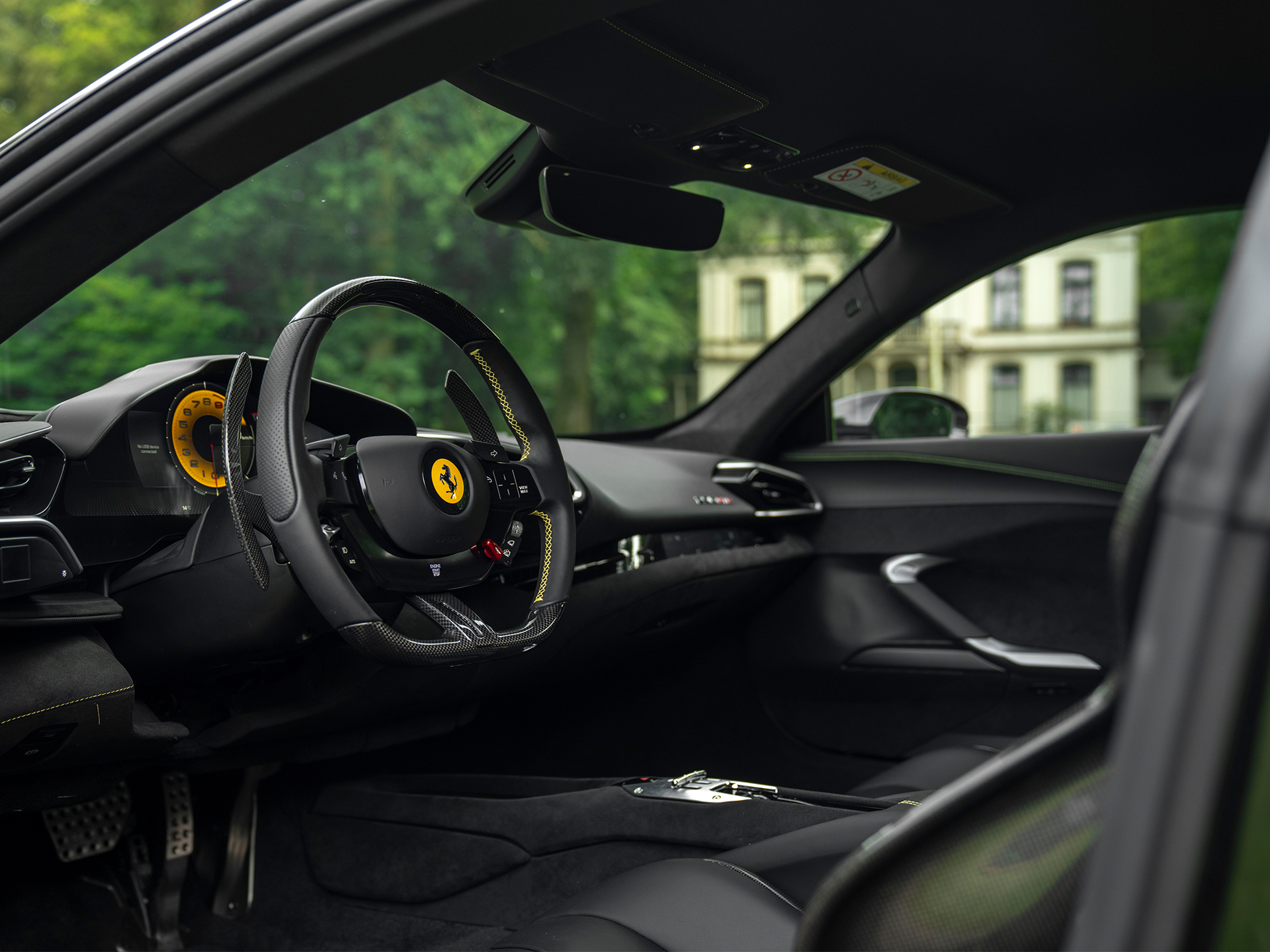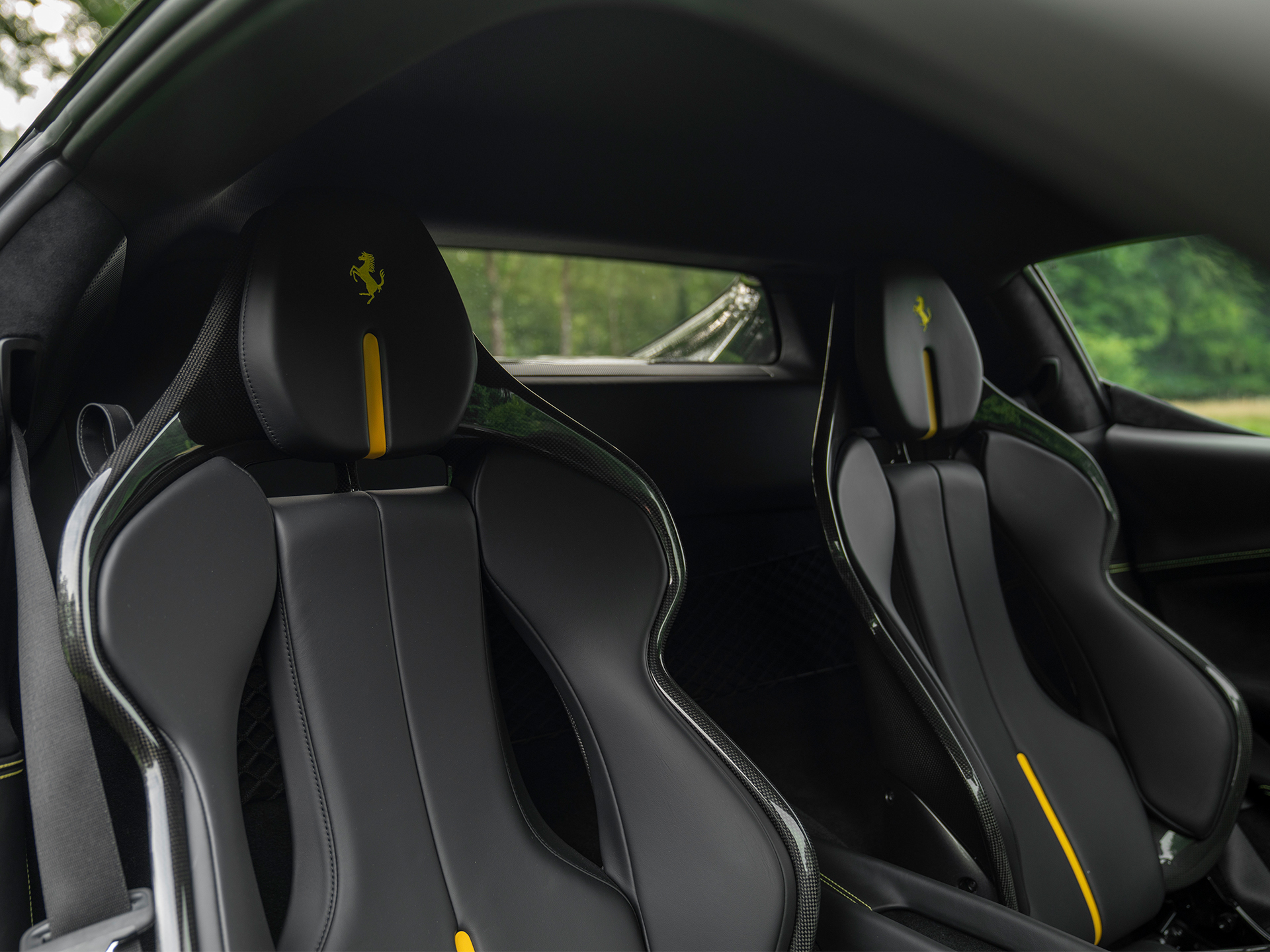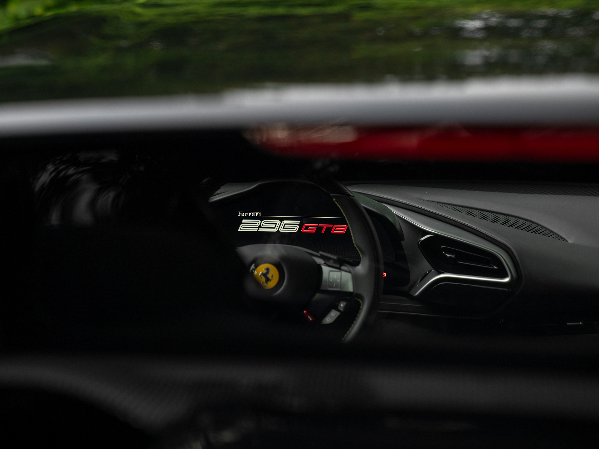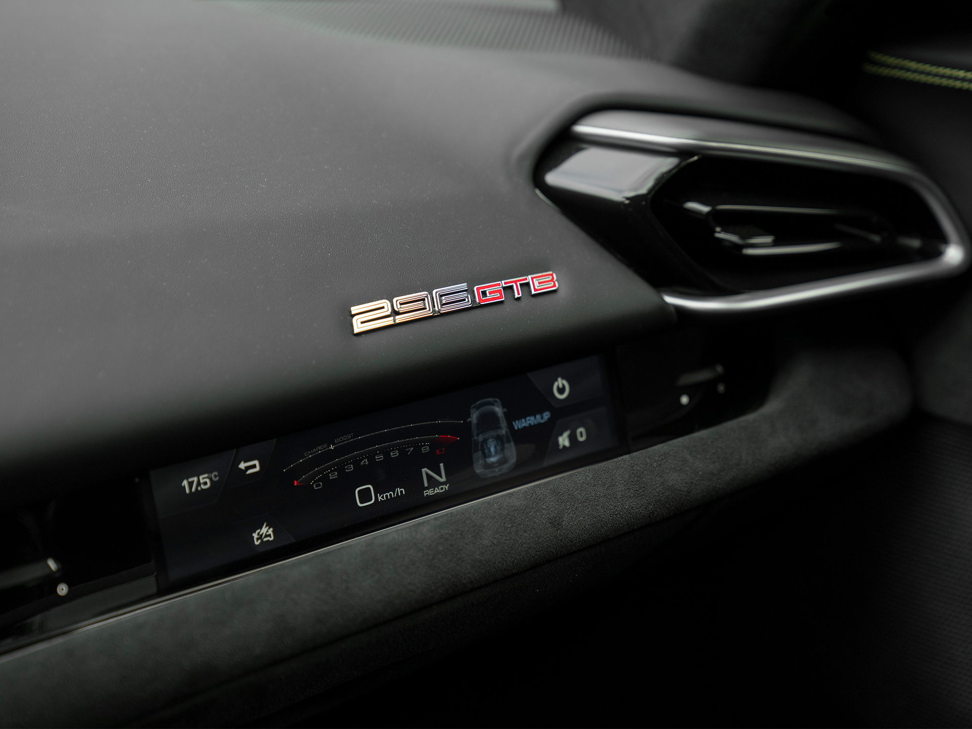 Dezelfde zwart/gele lijn wordt doorgetrokken in de haast minimalistisch ontworpen 296 GTB cockpit. De digitale rev-counter is op verzoek net zo Giallo gemaakt als de stiksels op de vele Nero lederen + alcantara delen. Waaronder het sportstuur inclusief carbon inzetstukken, dito Shift Paddles erachter én een LED Shift Indicator. Ook de alcantara onderkant van het dashboard, de lederen middenarmsteun + bovenranden / kaartenvakken van de deurpanelen zijn prachtig afgewerkt met Giallo contraststiksels. De middenbanen in de Carbon Racing Seats mét Cavallino’s in de hoofdsteunen sluiten zich hier op stijlvolle wijze naadloos bij aan. Zelfs de lederen zonnekleppen verzonken in alcantara hemelbekleding worden omringd door Giallo stiknaden. Het toppunt van Italiaanse distinctie! Alles oogt nieuw, voelt nieuw, ruikt nieuw… Is simpelweg nieuw.