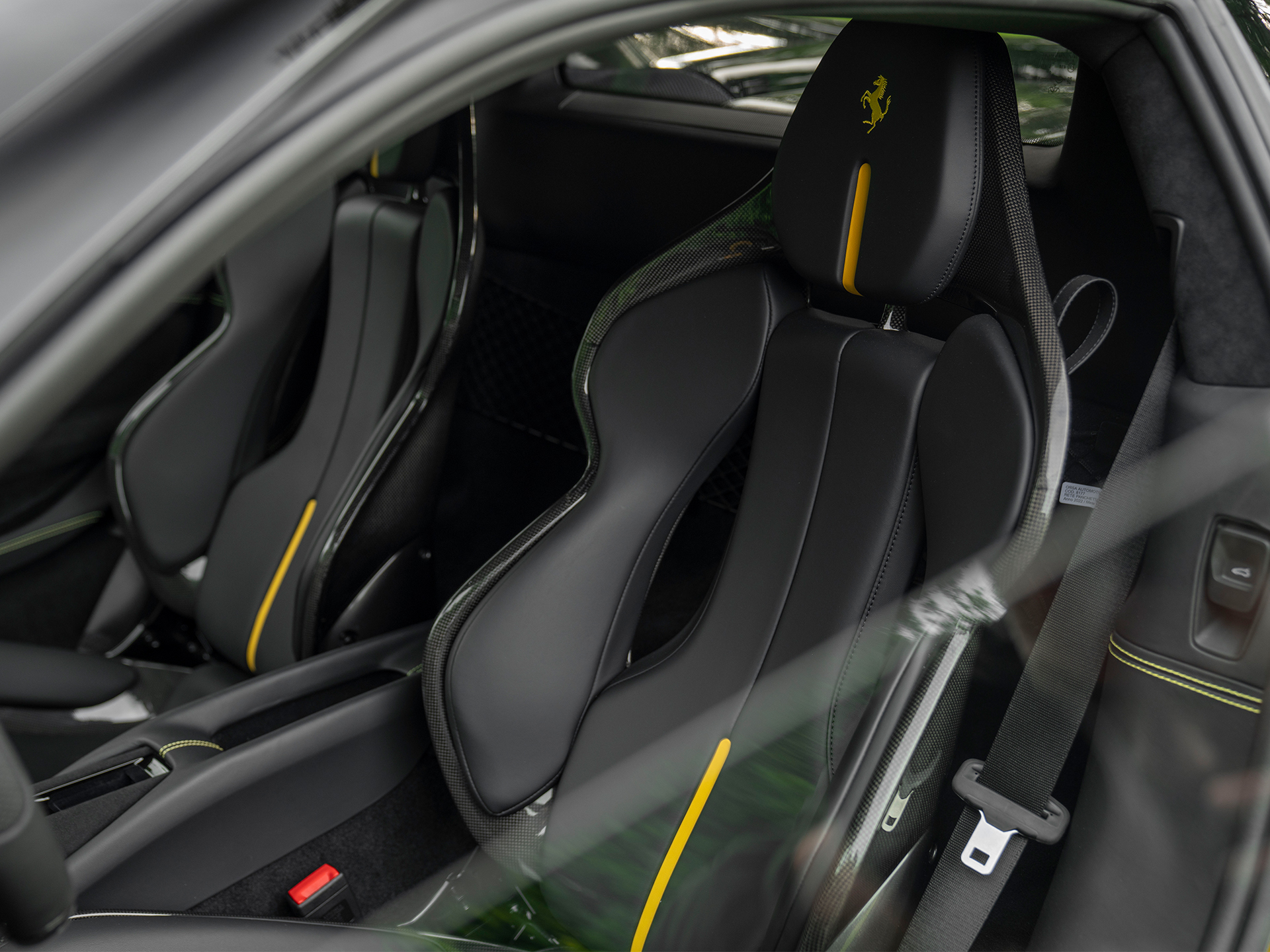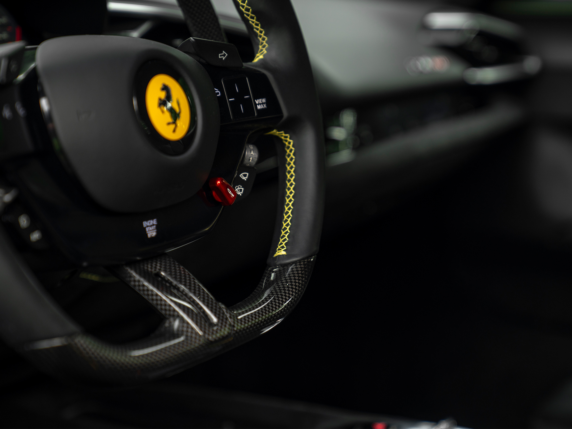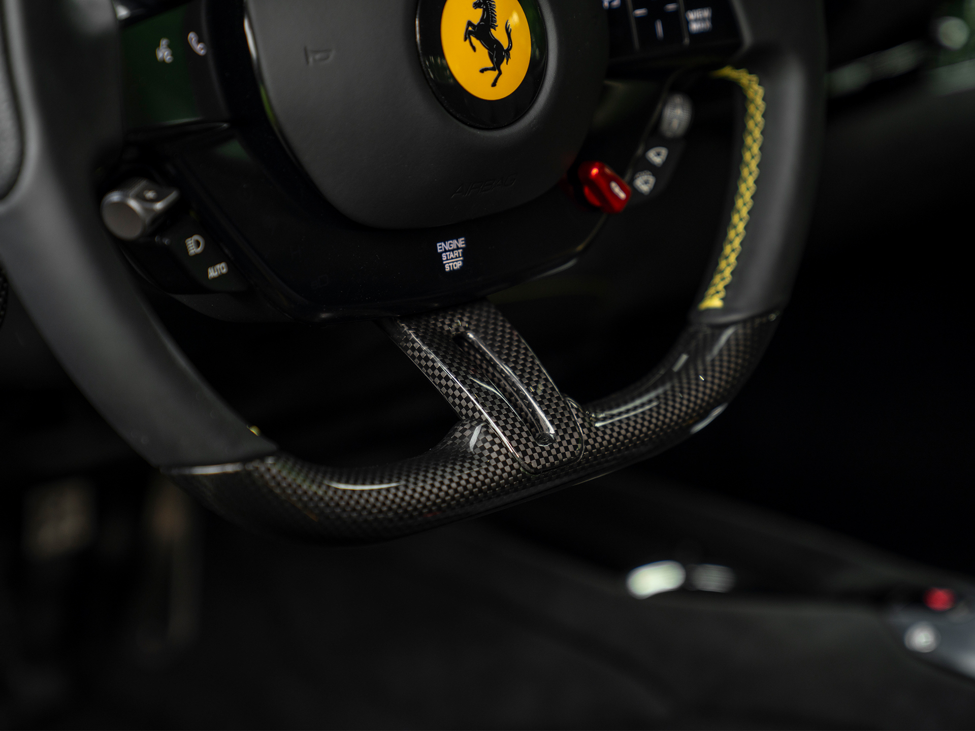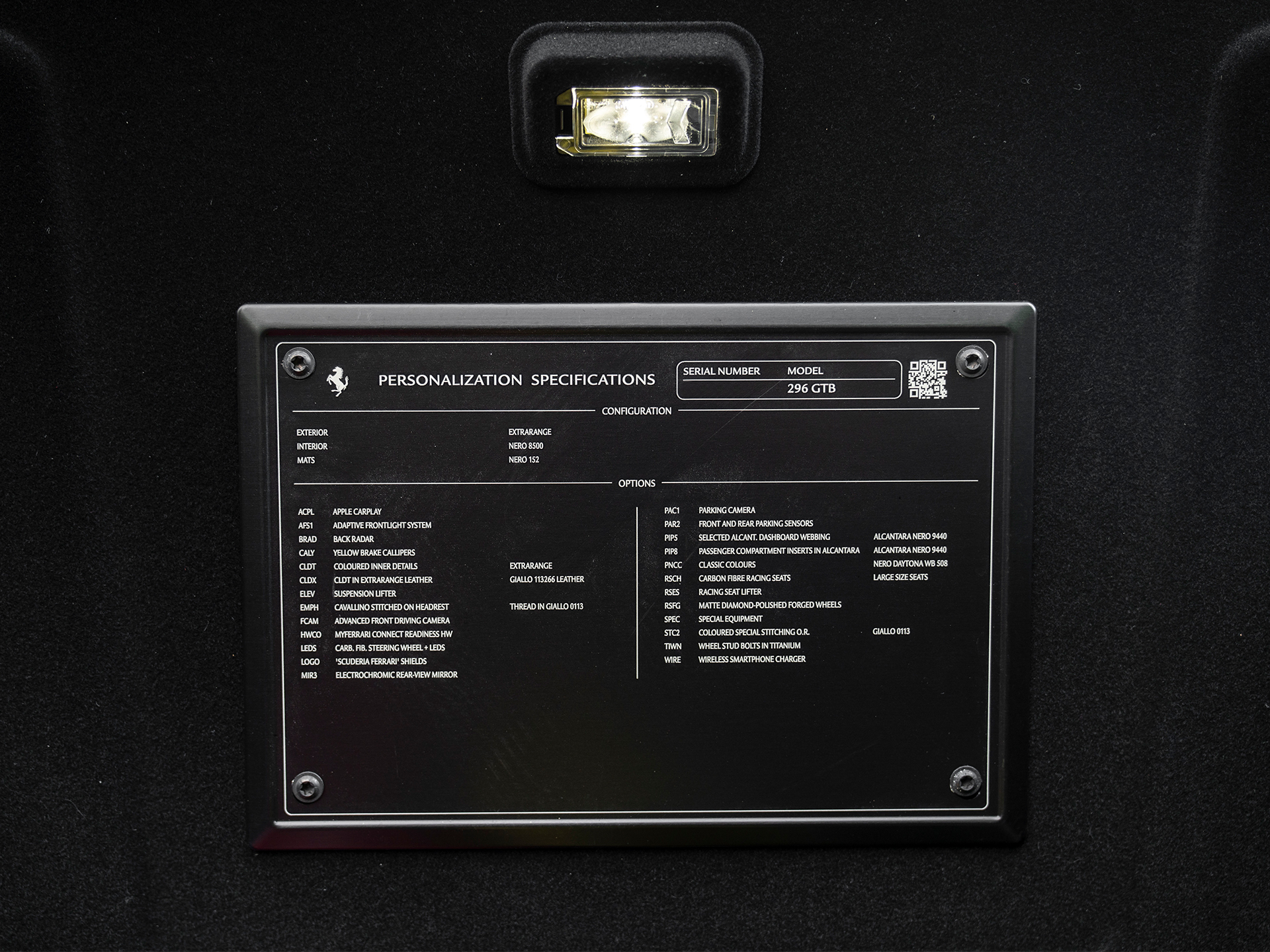 Dezelfde zwart/gele lijn wordt doorgetrokken in de haast minimalistisch ontworpen 296 GTB cockpit. De digitale rev-counter is op verzoek net zo Giallo gemaakt als de stiksels op de vele Nero lederen + alcantara delen. Waaronder het sportstuur inclusief carbon inzetstukken, dito Shift Paddles erachter én een LED Shift Indicator. Ook de alcantara onderkant van het dashboard, de lederen middenarmsteun + bovenranden / kaartenvakken van de deurpanelen zijn prachtig afgewerkt met Giallo contraststiksels. De middenbanen in de Carbon Racing Seats mét Cavallino’s in de hoofdsteunen sluiten zich hier op stijlvolle wijze naadloos bij aan. Zelfs de lederen zonnekleppen verzonken in alcantara hemelbekleding worden omringd door Giallo stiknaden. Het toppunt van Italiaanse distinctie! Alles oogt nieuw, voelt nieuw, ruikt nieuw… Is simpelweg nieuw.