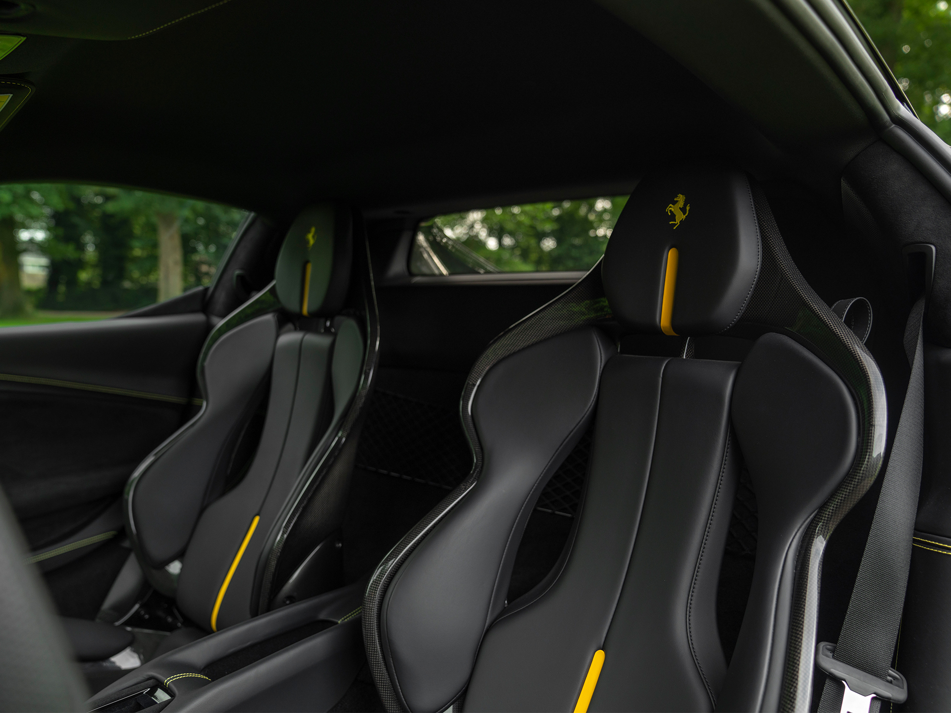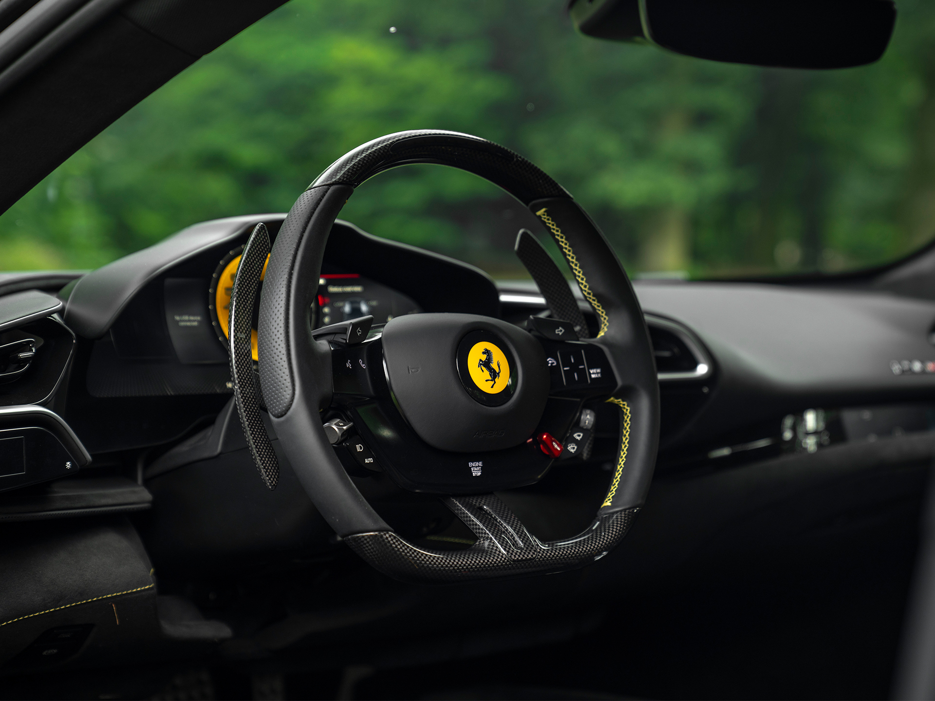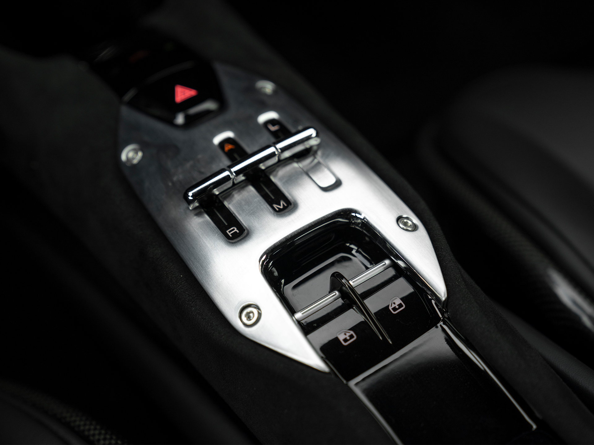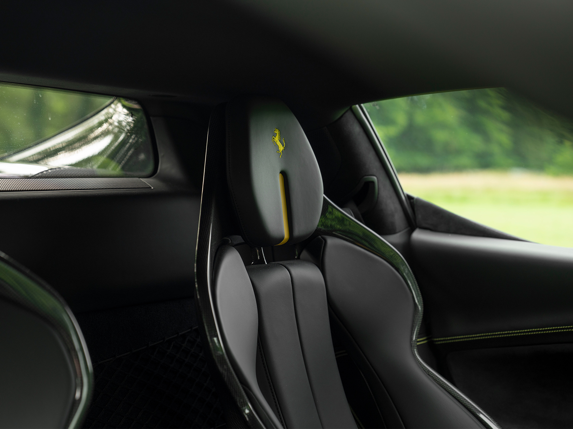 Dezelfde zwart/gele lijn wordt doorgetrokken in de haast minimalistisch ontworpen 296 GTB cockpit. De digitale rev-counter is op verzoek net zo Giallo gemaakt als de stiksels op de vele Nero lederen + alcantara delen. Waaronder het sportstuur inclusief carbon inzetstukken, dito Shift Paddles erachter én een LED Shift Indicator. Ook de alcantara onderkant van het dashboard, de lederen middenarmsteun + bovenranden / kaartenvakken van de deurpanelen zijn prachtig afgewerkt met Giallo contraststiksels. De middenbanen in de Carbon Racing Seats mét Cavallino’s in de hoofdsteunen sluiten zich hier op stijlvolle wijze naadloos bij aan. Zelfs de lederen zonnekleppen verzonken in alcantara hemelbekleding worden omringd door Giallo stiknaden. Het toppunt van Italiaanse distinctie! Alles oogt nieuw, voelt nieuw, ruikt nieuw… Is simpelweg nieuw.