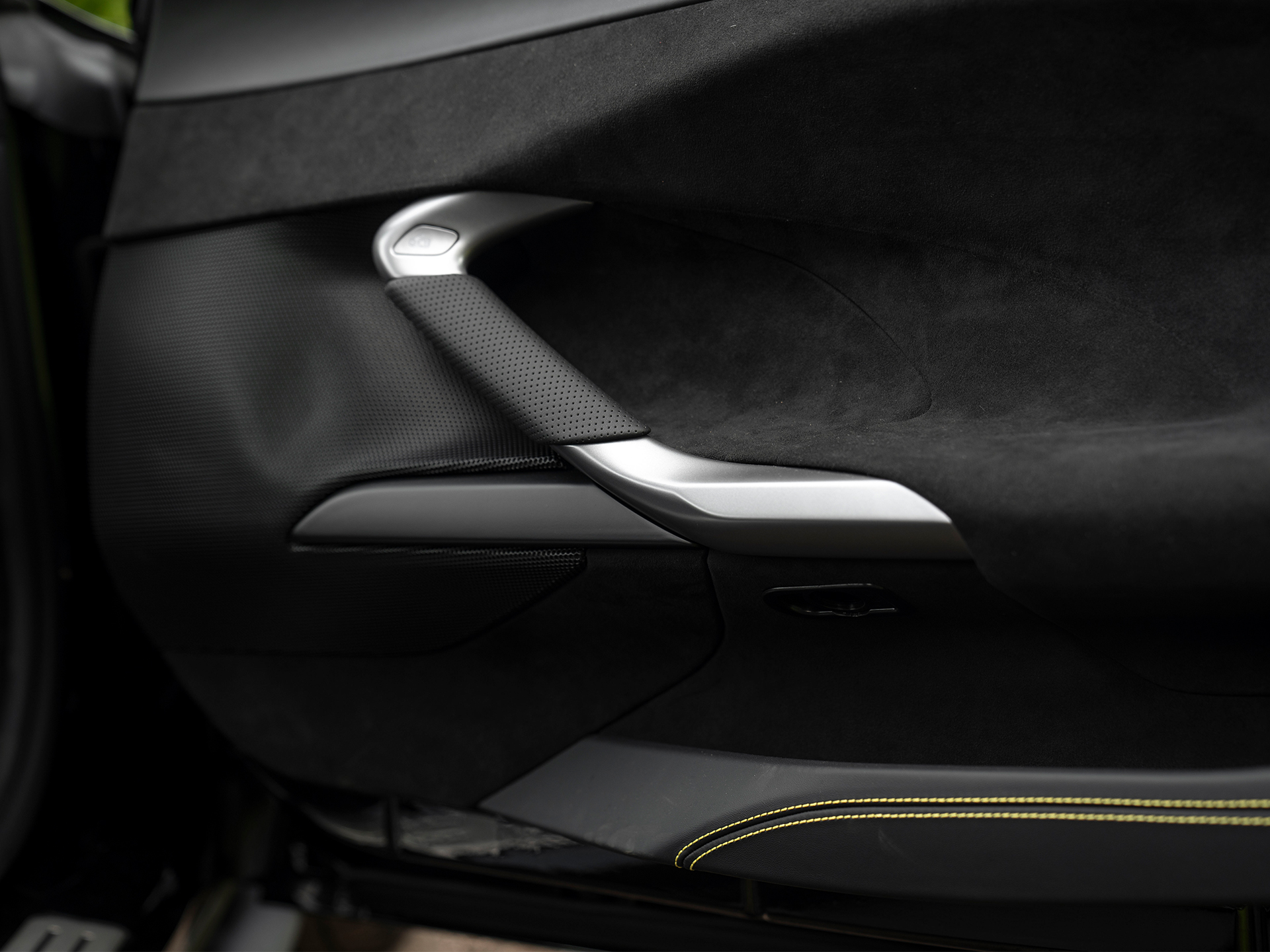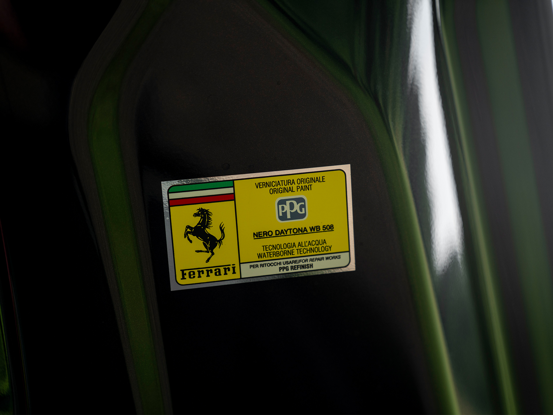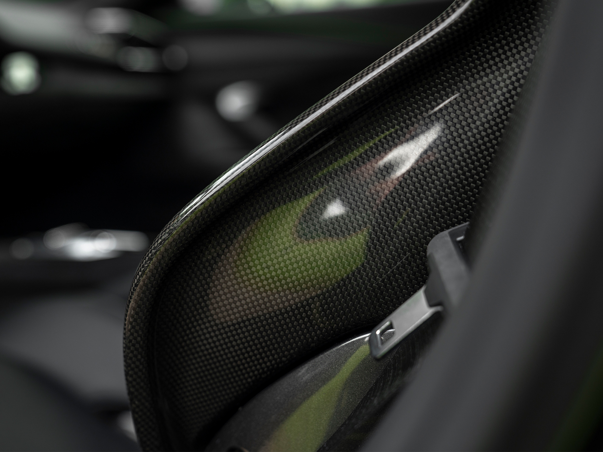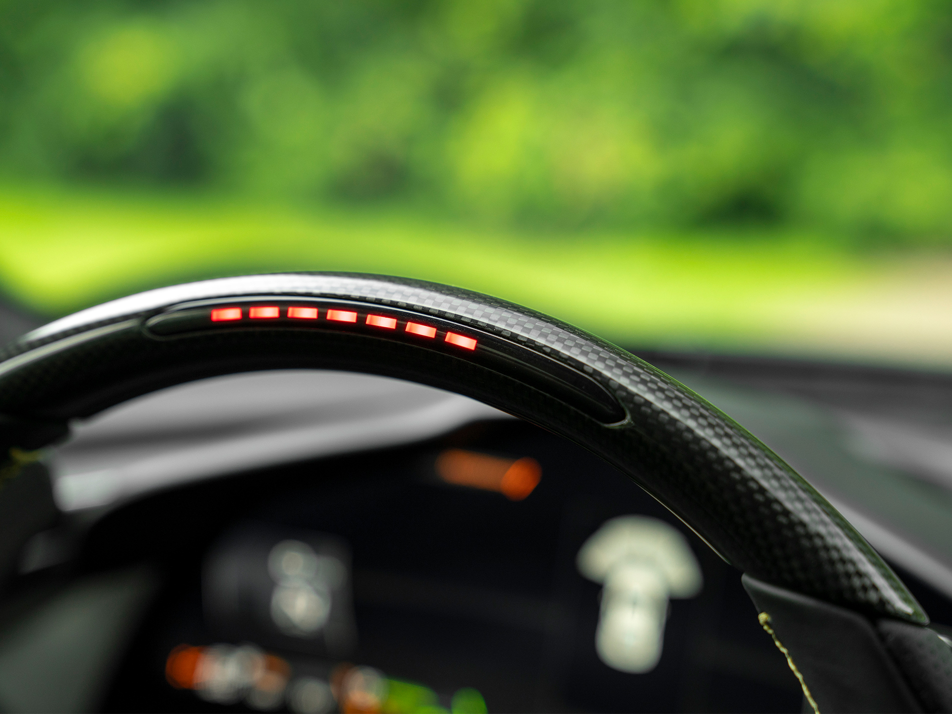 Dezelfde zwart/gele lijn wordt doorgetrokken in de haast minimalistisch ontworpen 296 GTB cockpit. De digitale rev-counter is op verzoek net zo Giallo gemaakt als de stiksels op de vele Nero lederen + alcantara delen. Waaronder het sportstuur inclusief carbon inzetstukken, dito Shift Paddles erachter én een LED Shift Indicator. Ook de alcantara onderkant van het dashboard, de lederen middenarmsteun + bovenranden / kaartenvakken van de deurpanelen zijn prachtig afgewerkt met Giallo contraststiksels. De middenbanen in de Carbon Racing Seats mét Cavallino’s in de hoofdsteunen sluiten zich hier op stijlvolle wijze naadloos bij aan. Zelfs de lederen zonnekleppen verzonken in alcantara hemelbekleding worden omringd door Giallo stiknaden. Het toppunt van Italiaanse distinctie! Alles oogt nieuw, voelt nieuw, ruikt nieuw… Is simpelweg nieuw.