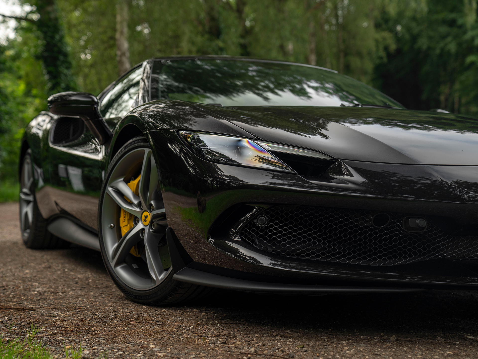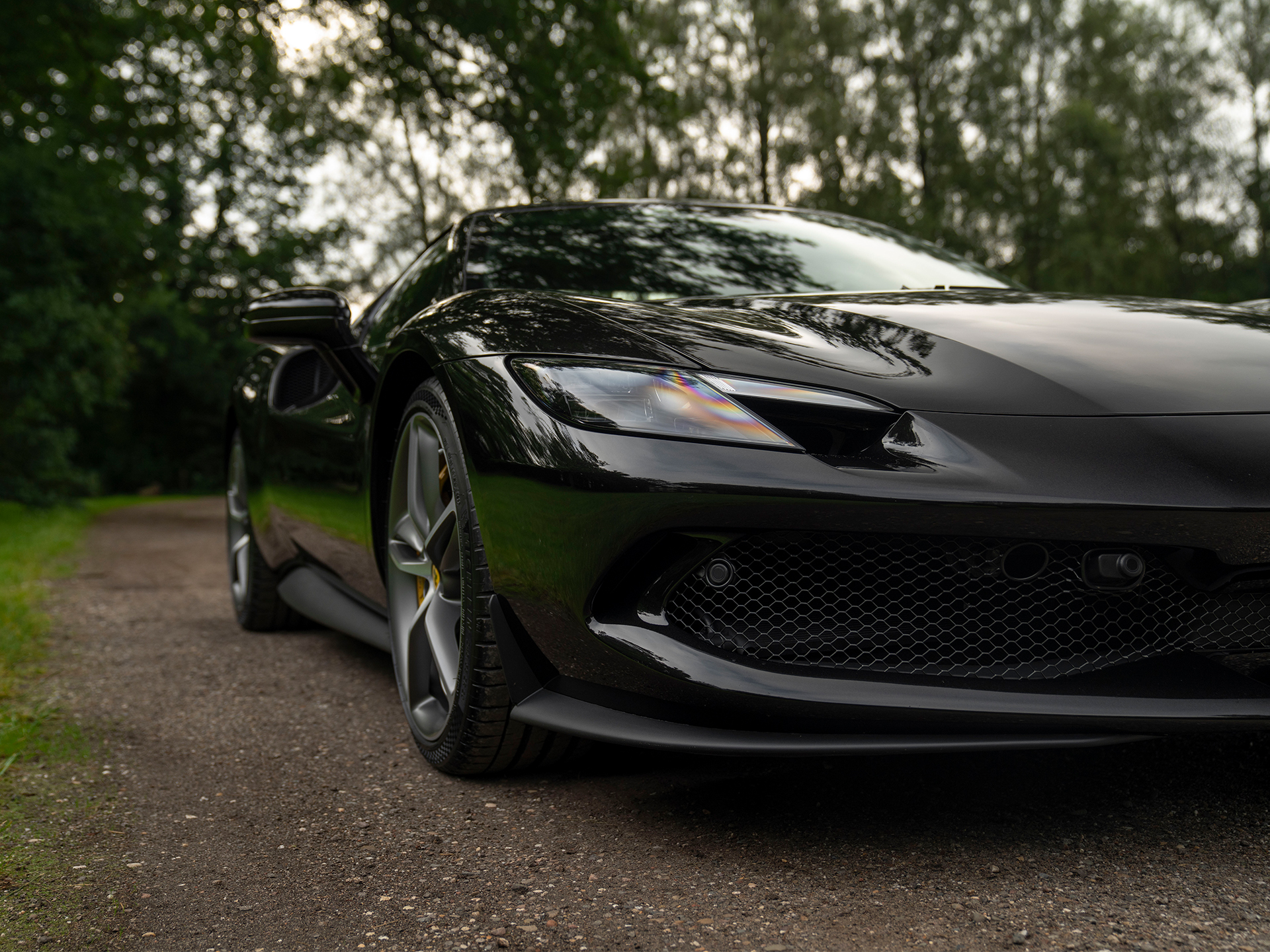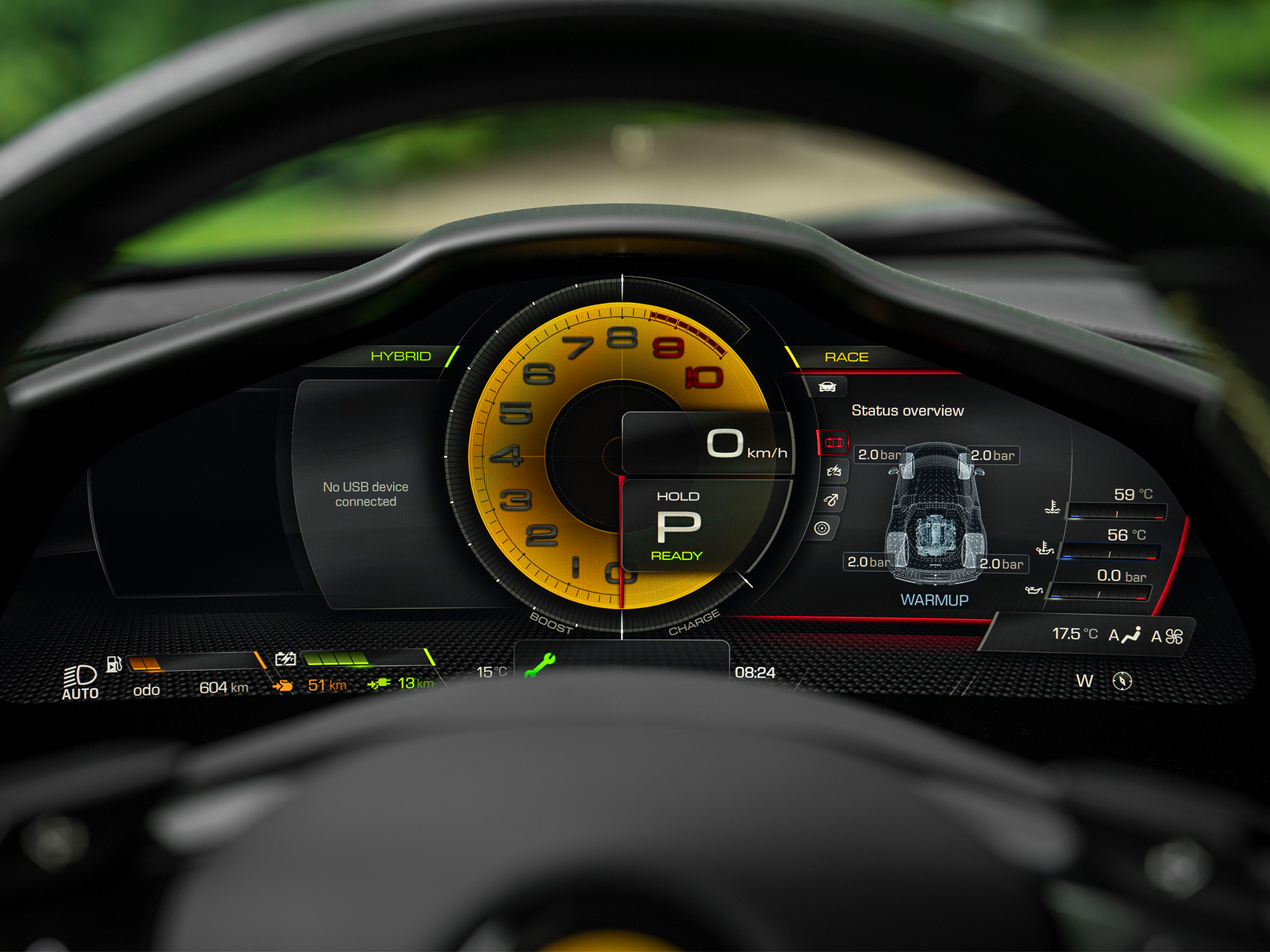 Met 600 kilometer op de digitale klokken vragen we ons hardop af of de 3.0 V6 Hybrid wel vaker dan één keer is warmgelopen. Warmlopen doet u sowieso bij het proberen van de twin-turbo 6-cilinder Ferrari. Downgrading? Dat woord durven wij niet meer in de mond te nemen bij het ervaren van 830 (!) bloedstollende paarden op de achterwielen, gecombineerd met een asfalt verslindend koppel van 740 Nm! Zonder elektropower komt de Ferrari V6 ook al tot een indrukwekkende 663 pk’s. Maar waarom zou u dat willen als het complete pakket een acceleratietijd van 0 naar 100 km/h binnen 2,9 seconden oplevert? Via 7 automatische verzetten en meerdere rood oplichtende LED’s in het carbon stuurwiel wordt een topsnelheid van 330 km/h gehaald. Houd dit een kleine 2 uur achtereenvolgens vol en u zit al op de totale kilometerstand van dit exemplaar…