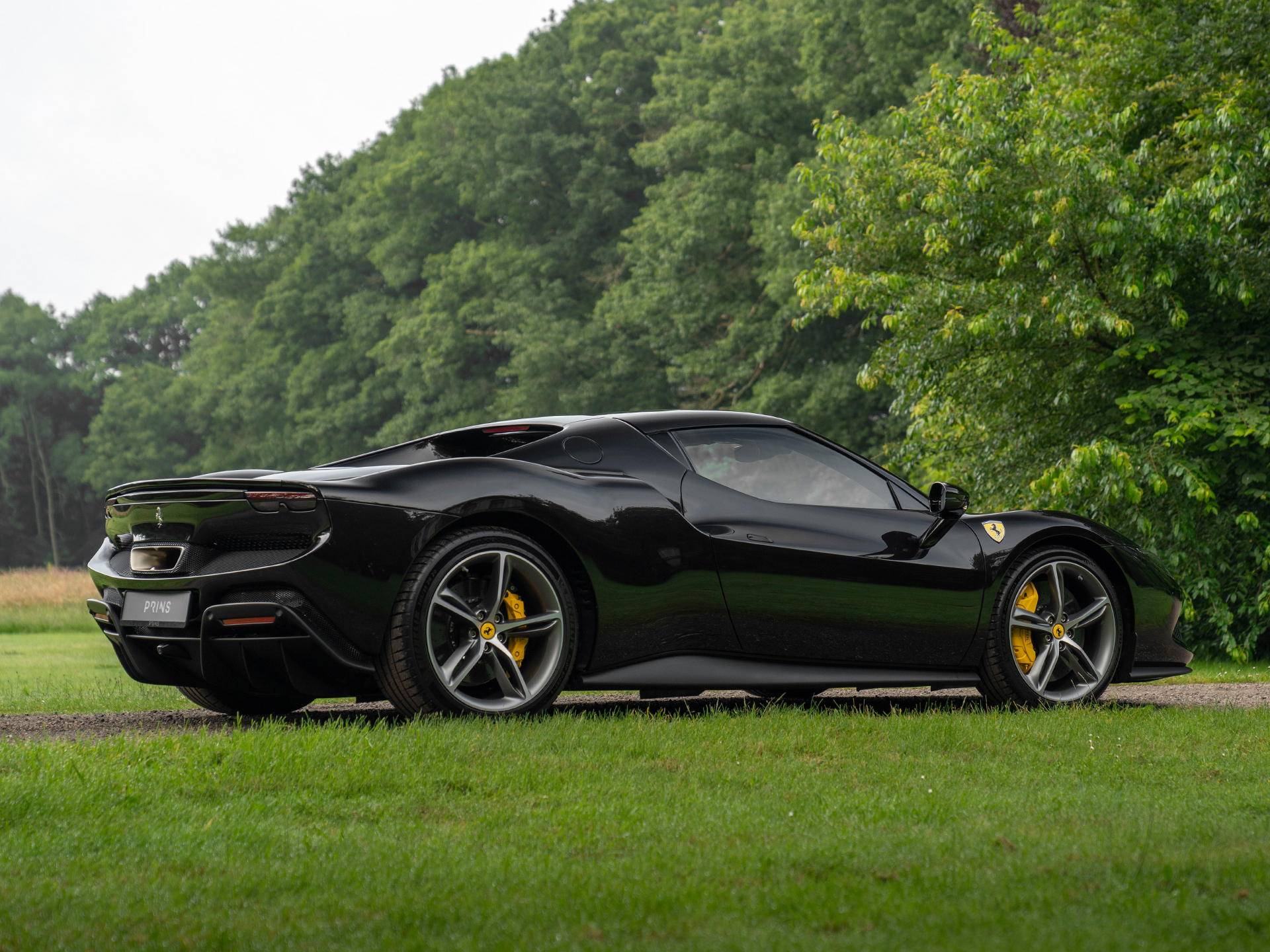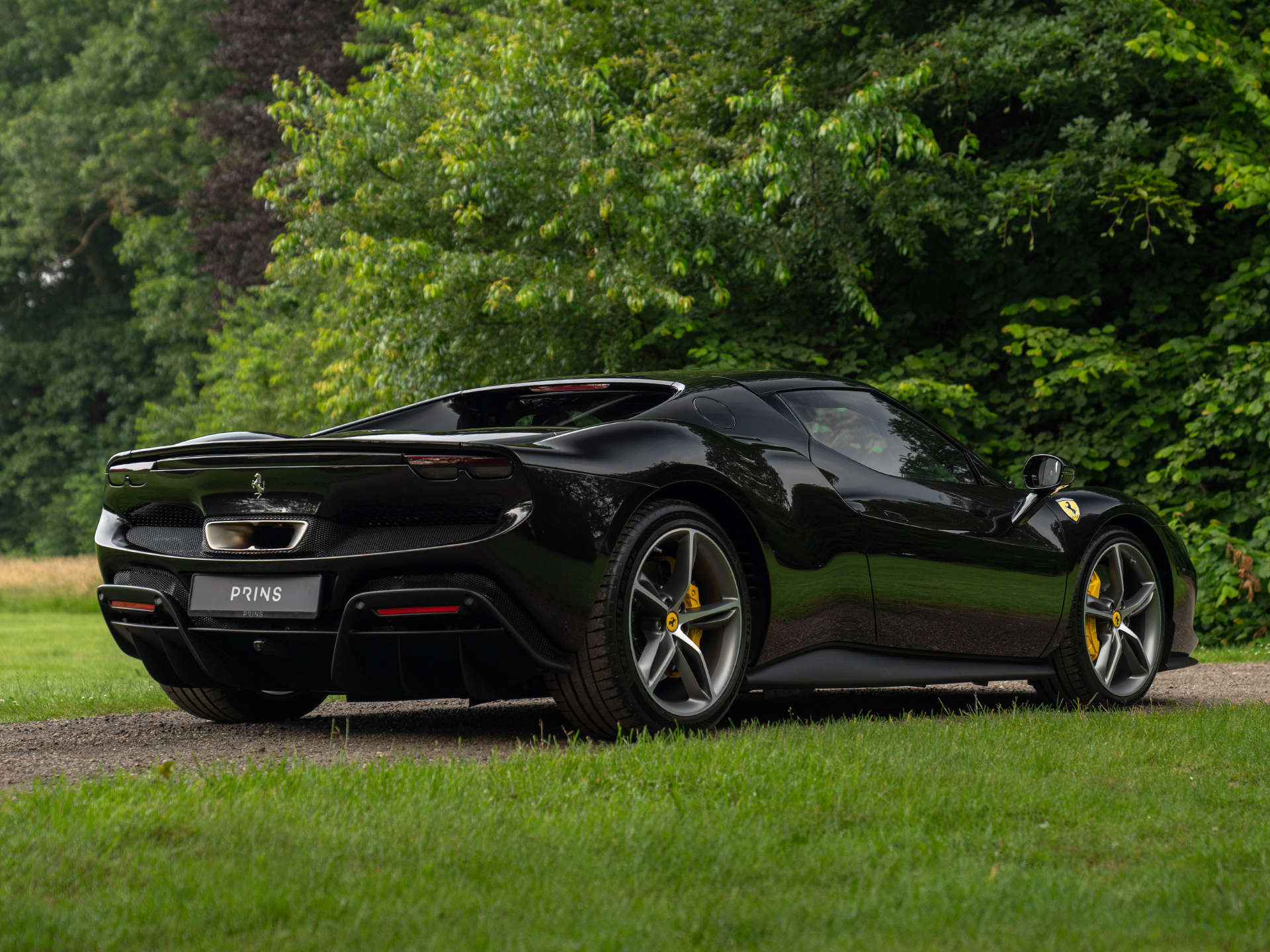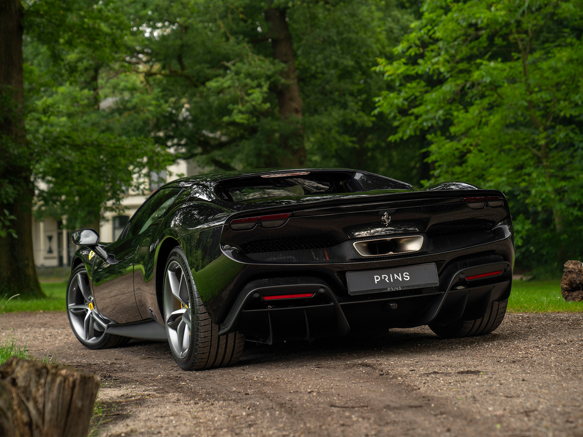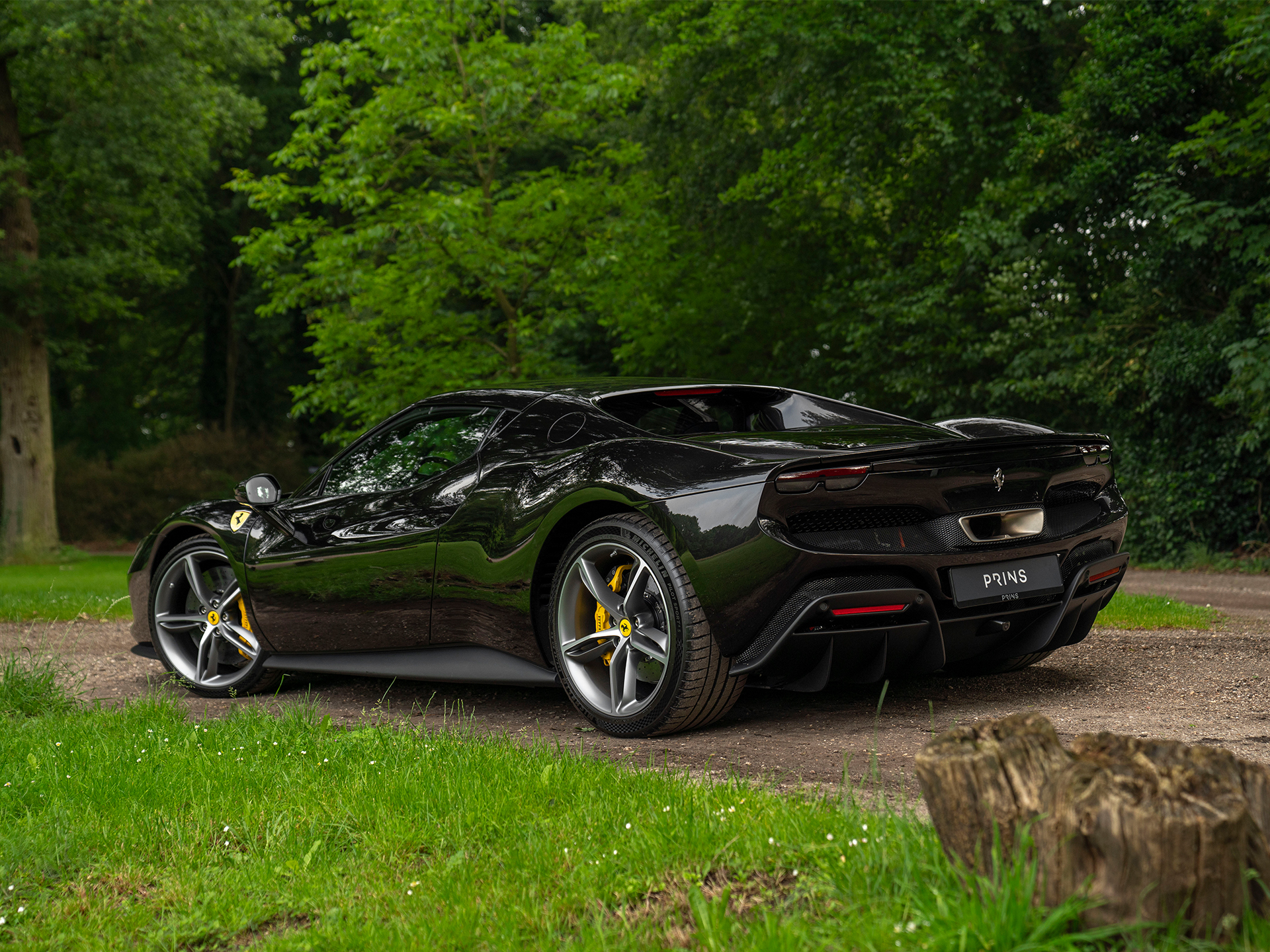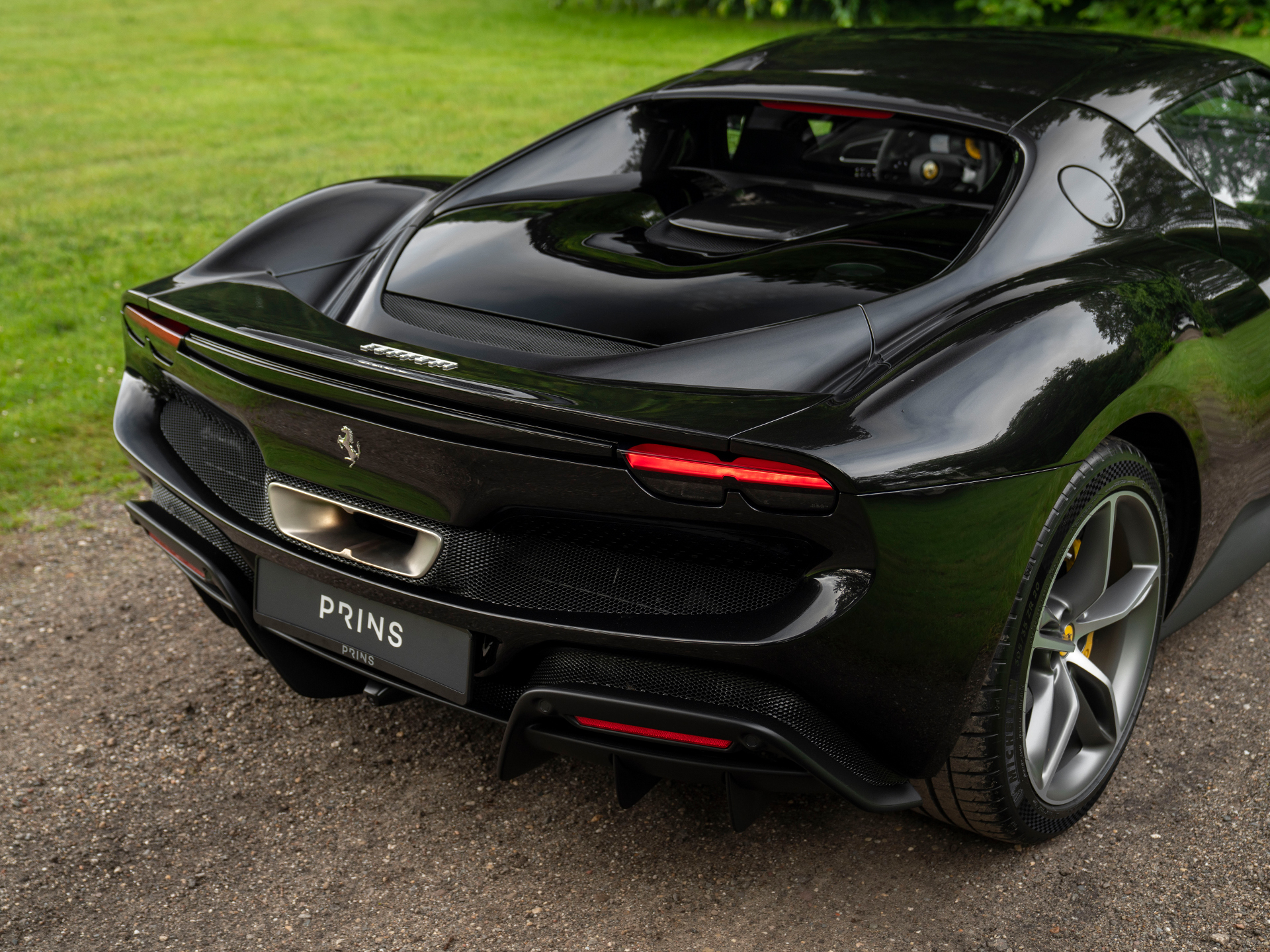 Heel puur en tegelijkertijd helemaal vol met opties: deze schitterend gespecificeerde Ferrari 296 GTB is origineel Nederlands geleverd en komt rechtstreeks bij de 1e eigenaar vandaan. Het inktzwarte lakwerk is een bekende uit Maranello en zorgt voor een mooie, cleane uitstraling. Dat het juist op de 296 een Extra-Range Colour betreft, maakt ‘m dan weer extra uniek. Uniek is tevens de kilometerstand die niet verder komt dan een retourrit Parijs. Niet geheel verrassend is het een btw-auto en dat kan voor u fiscaal dan weer gunstig uitpakken. Ook gunstig is het feit dat u een nagenoeg niet van nieuw te onderscheiden Ferrari kunt rijden – en nog snel ook, in tegenstelling tot de levertijd die de fabriek afgeeft. Áls u al een nieuwe order kunt plaatsen… Niet meteen aan de buitenkant te zien zijn peperdure opties zoals Carbon Racing Seats inclusief Racing Seat Lifter, een carbon stuur mét LED Shift Indicator, een front-liftsysteem, camera’s voor + achter en nog heel veel meer. Klaar om vol in de lichtgewicht kuipstoelen te worden gedrukt terwijl er 830 paarden in 2,9 seconden van 0 naar 100 km/h galopperen?