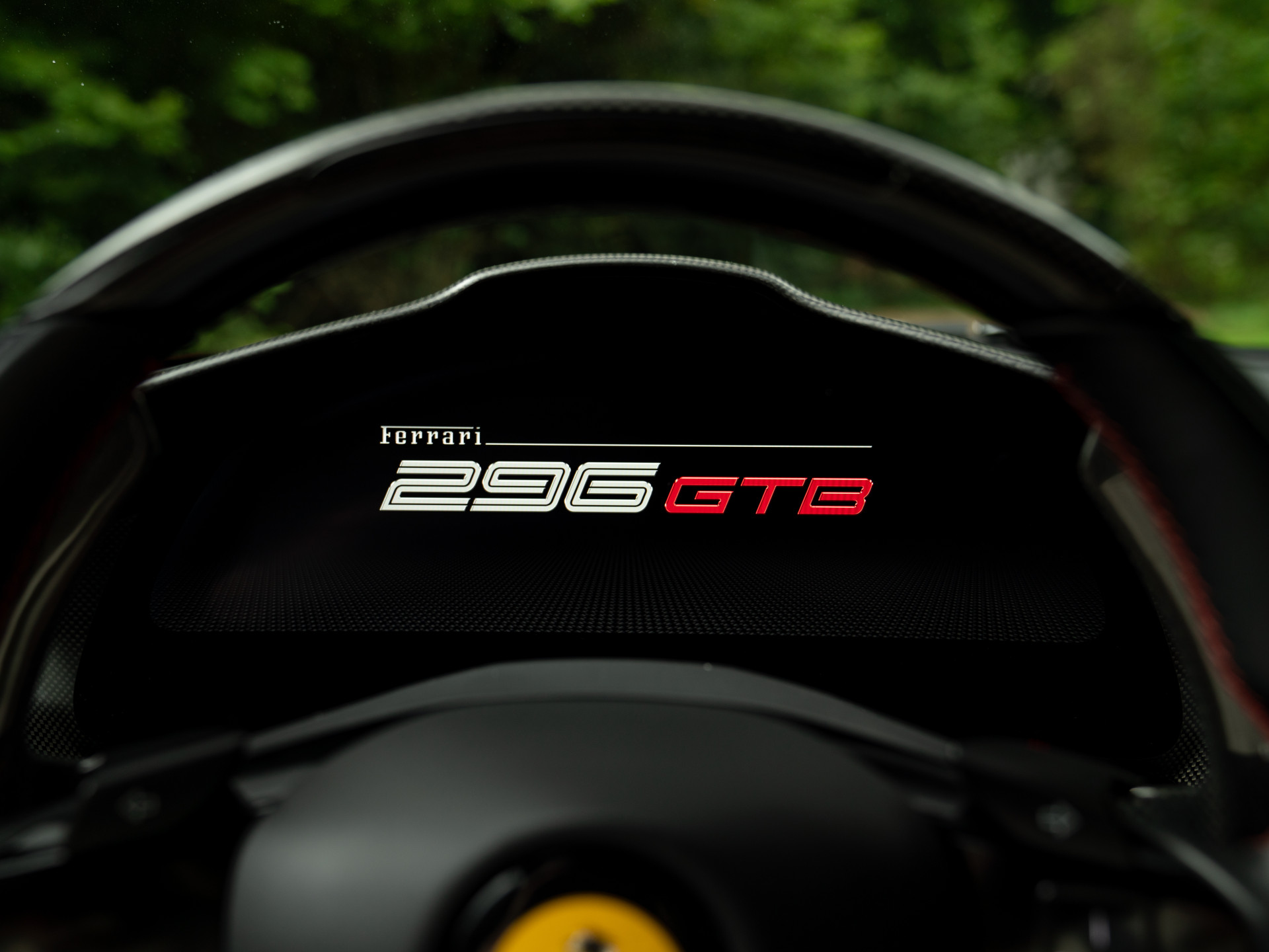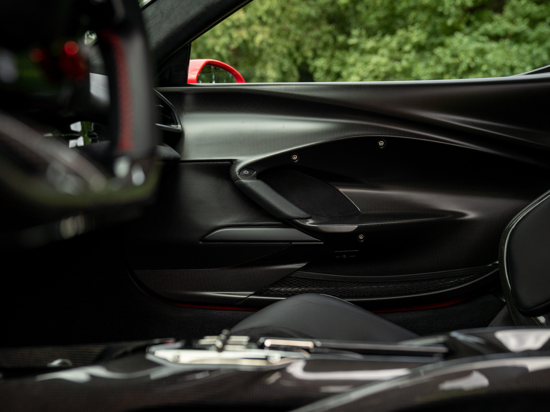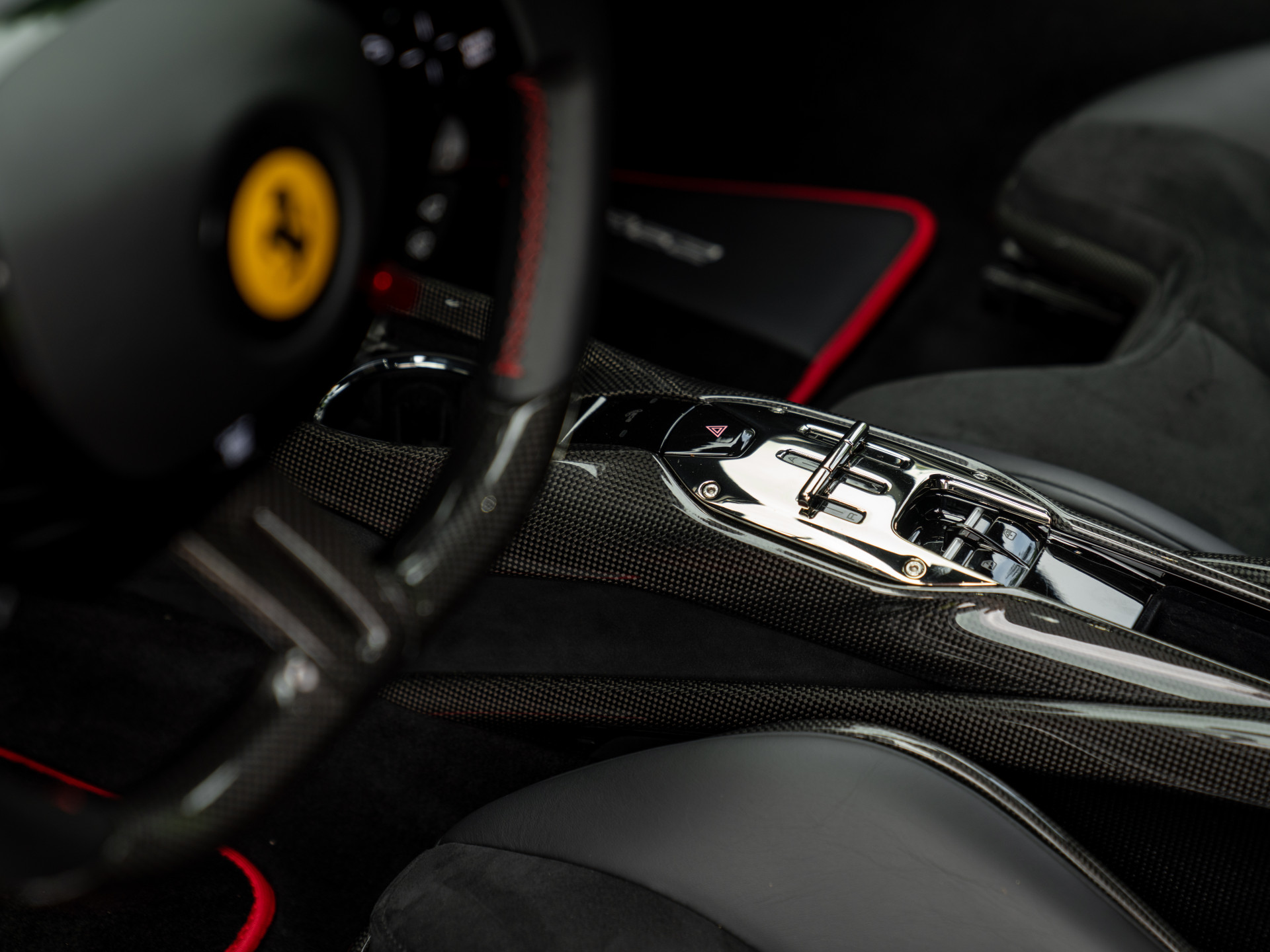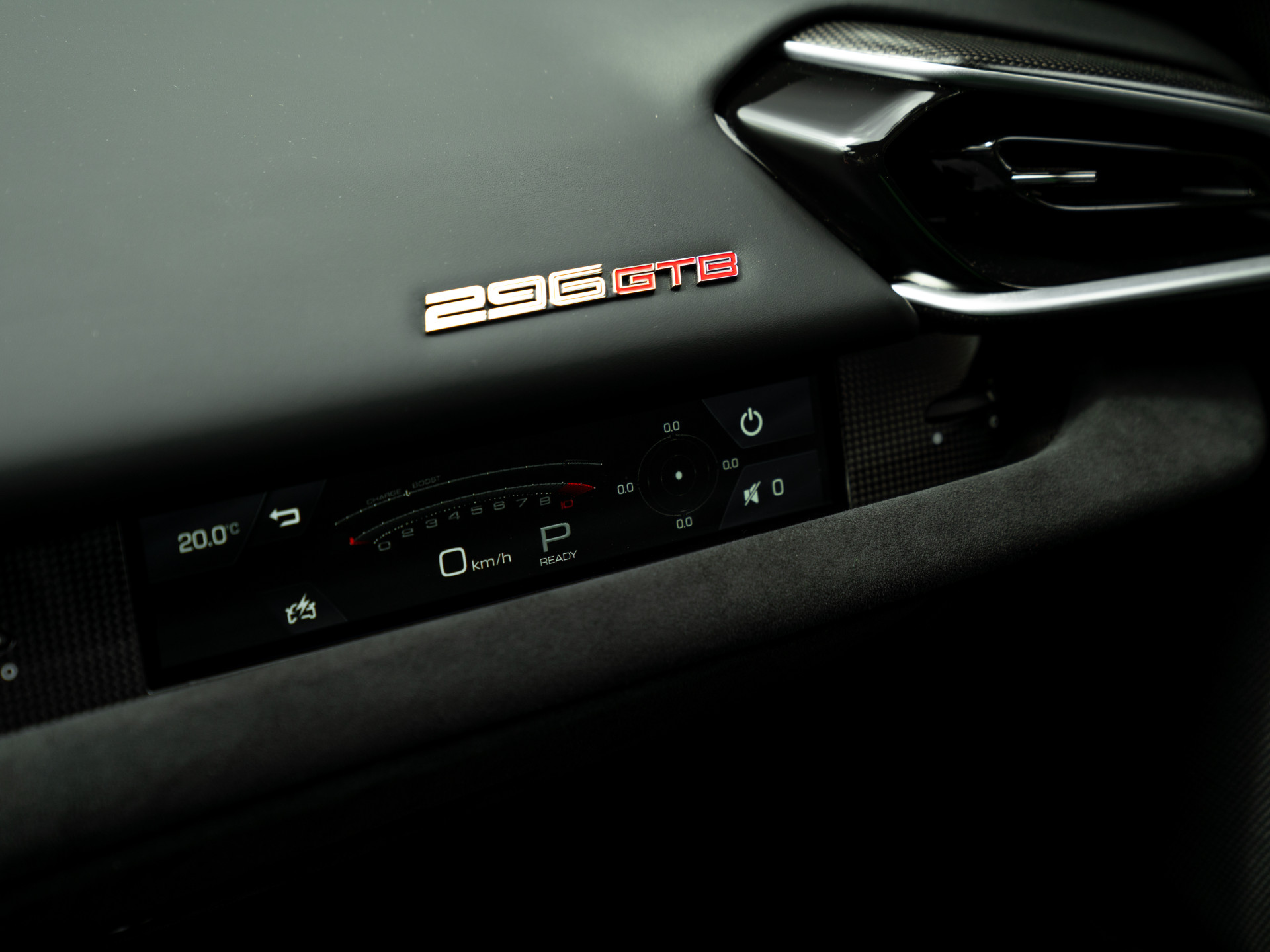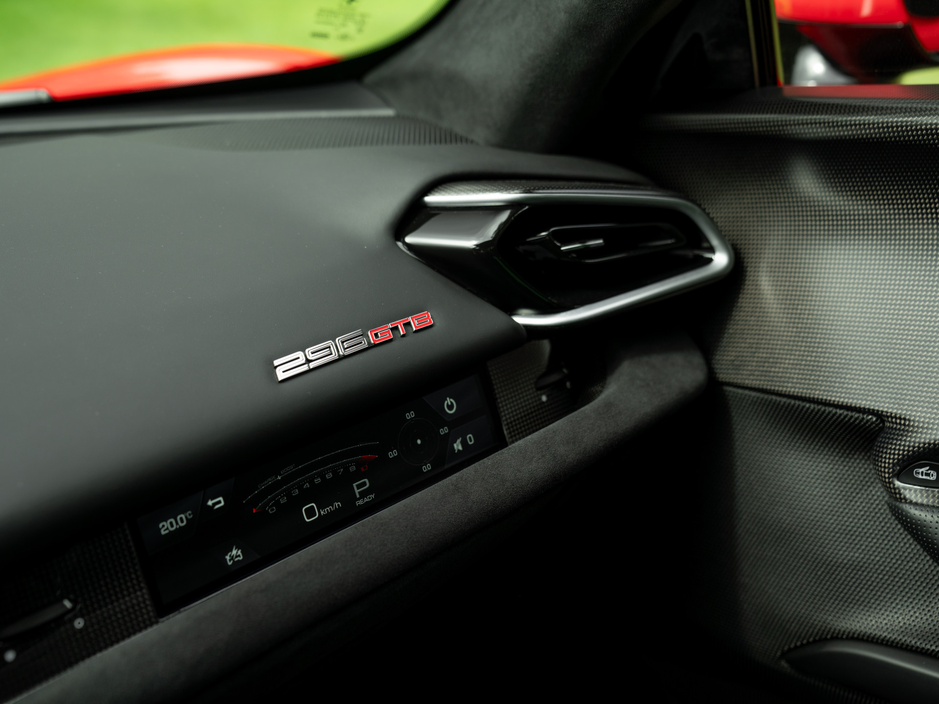 Gelukkig voor ons heeft de oorspronkelijke eigenaar de moeite genomen om de binnenkant van de Ferrari 296 GTB minstens zo spectaculair aan te kleden als de buitenkant. Stap over de carbon instaplijsten met Assetto Fiorano opdruk, en laat u zakken in heuse Carbon Racing Seats voorzien van Nero alcantara bekleding. Dezelfde bekleding komt terug aan de onderzijde van het dashboard + de stijlen. De carbon afwerking wordt op zijn beurt doorgetrokken tot en met het stuurwiel (inclusief LED Shift Indicator), de Shift Paddles en de complete midden-/tunnelconsole. Niet te zien vanuit de cockpit, maar wél aanwezig is de carbon kofferbakruimte voorin. Tot zover de glanzende koolstofvezel delen. De afslankkuur is namelijk (nog) groter dan dat: deurpanelen, achterwand én instrumentarium hebben een Matte Carbon finish. Ondanks de ongelimiteerde inspanningen om kilo’s te besparen, zag Ferrari ruimte om de 296 GTB cockpit in stijl op te fleuren. Het Rosso van de Cavallino’s in de hoofdsteunen komt namelijk één-op-één terug in de vorm van prachtige accenten in de stoelen, stiksels in stuur + dashboard, alsmede de digitale rev-counter. Briljant.