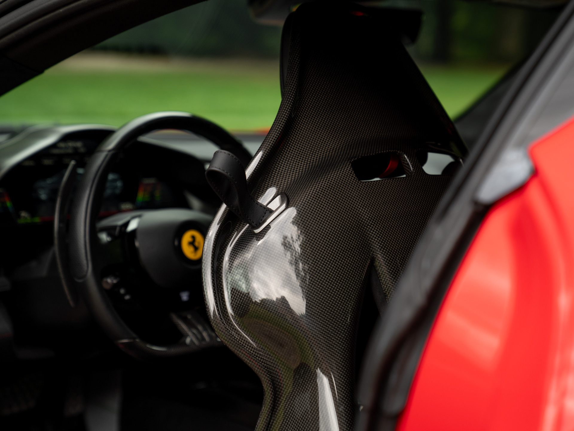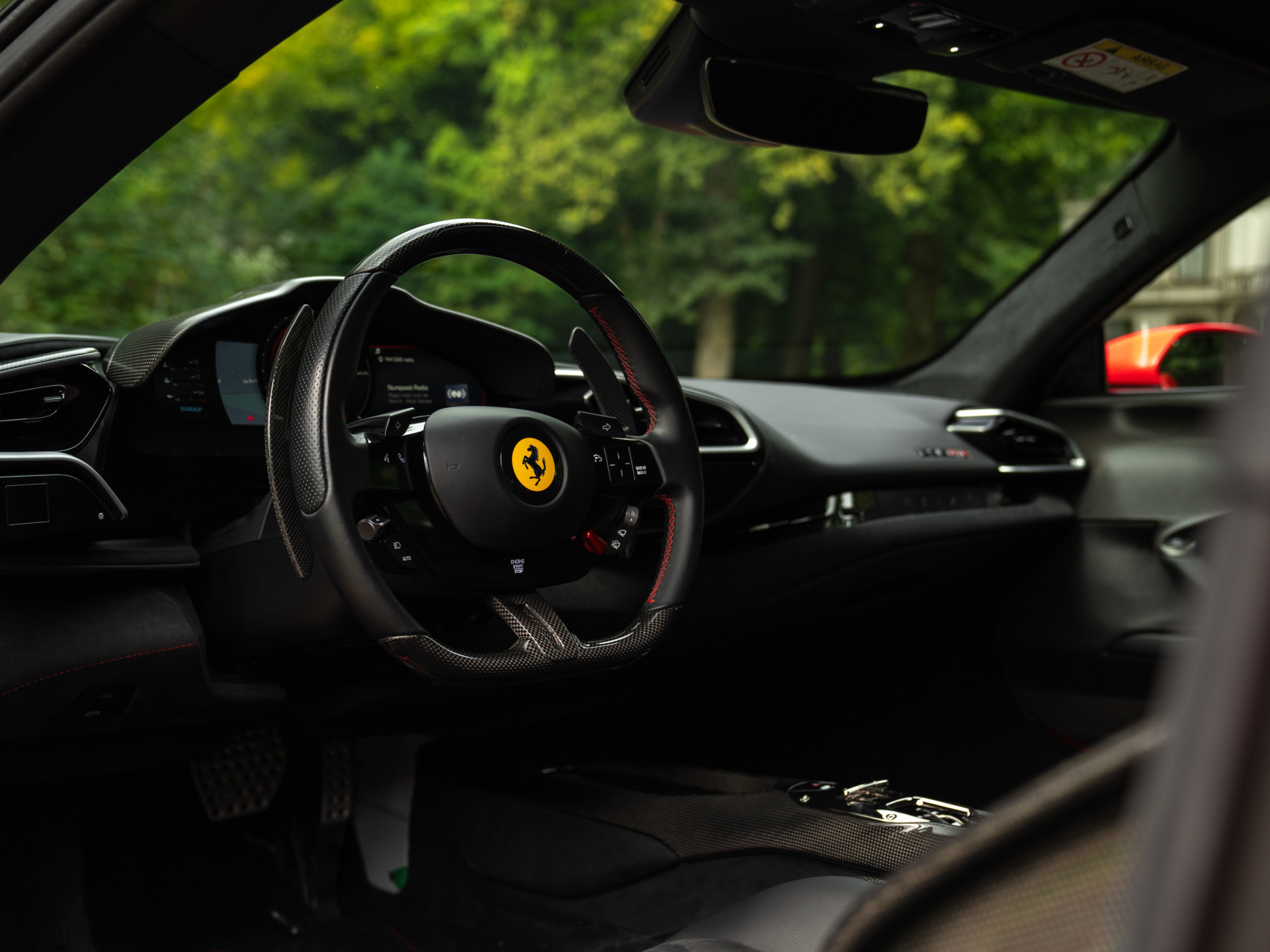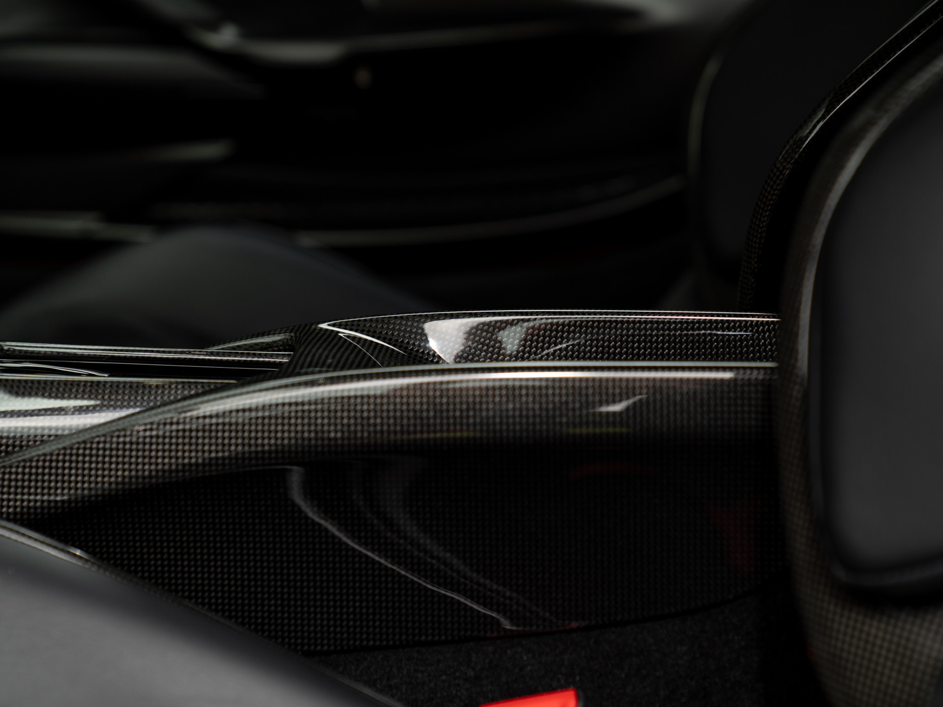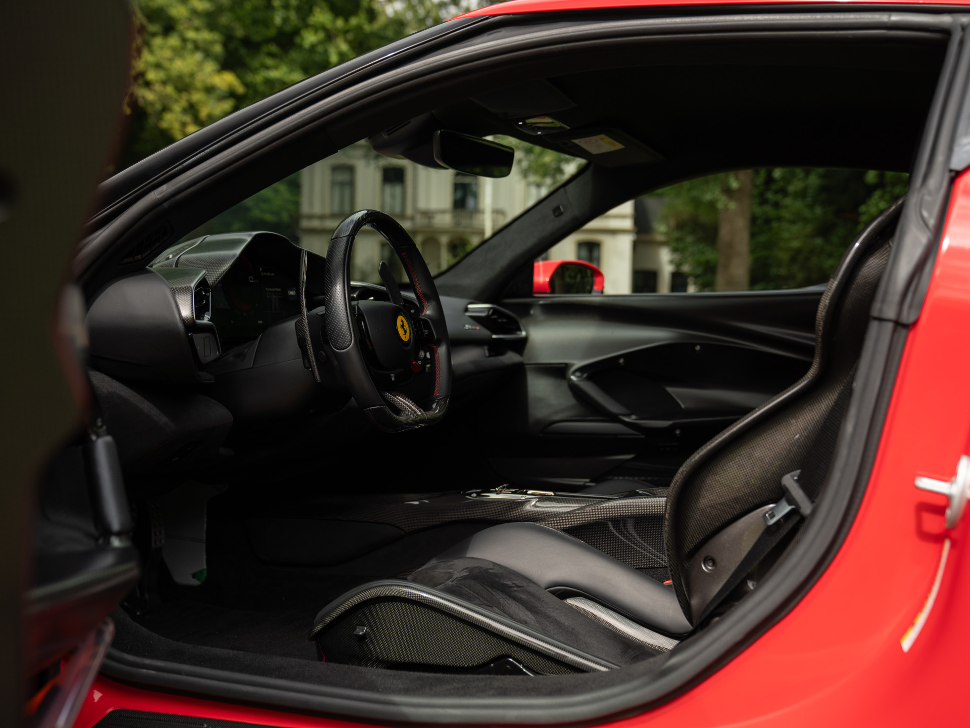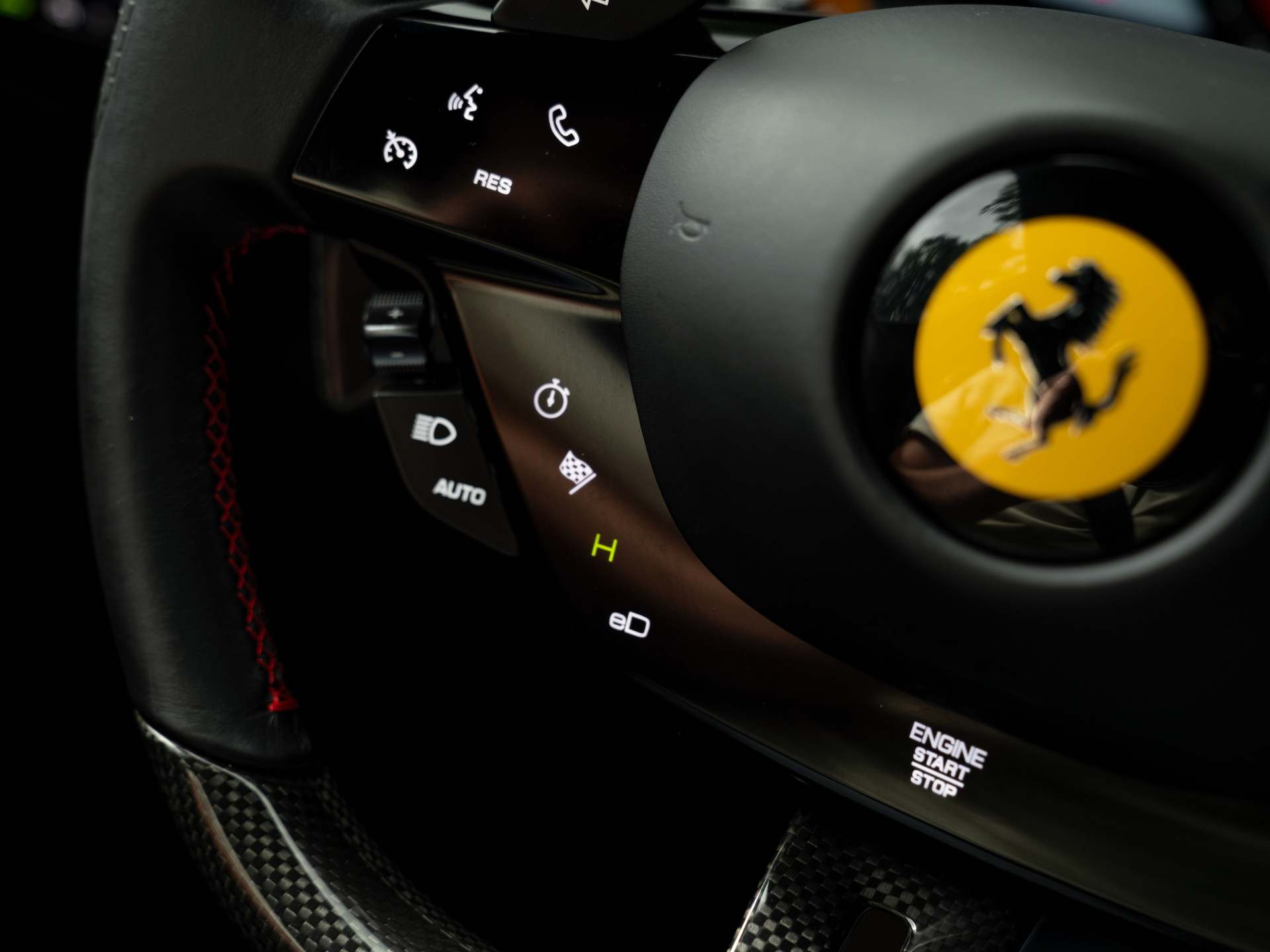 Gelukkig voor ons heeft de oorspronkelijke eigenaar de moeite genomen om de binnenkant van de Ferrari 296 GTB minstens zo spectaculair aan te kleden als de buitenkant. Stap over de carbon instaplijsten met Assetto Fiorano opdruk, en laat u zakken in heuse Carbon Racing Seats voorzien van Nero alcantara bekleding. Dezelfde bekleding komt terug aan de onderzijde van het dashboard + de stijlen. De carbon afwerking wordt op zijn beurt doorgetrokken tot en met het stuurwiel (inclusief LED Shift Indicator), de Shift Paddles en de complete midden-/tunnelconsole. Niet te zien vanuit de cockpit, maar wél aanwezig is de carbon kofferbakruimte voorin. Tot zover de glanzende koolstofvezel delen. De afslankkuur is namelijk (nog) groter dan dat: deurpanelen, achterwand én instrumentarium hebben een Matte Carbon finish. Ondanks de ongelimiteerde inspanningen om kilo’s te besparen, zag Ferrari ruimte om de 296 GTB cockpit in stijl op te fleuren. Het Rosso van de Cavallino’s in de hoofdsteunen komt namelijk één-op-één terug in de vorm van prachtige accenten in de stoelen, stiksels in stuur + dashboard, alsmede de digitale rev-counter. Briljant.
