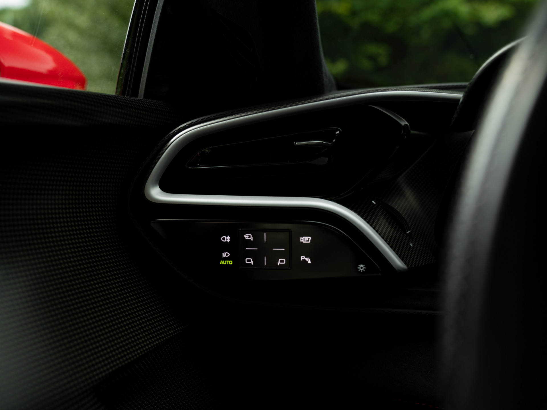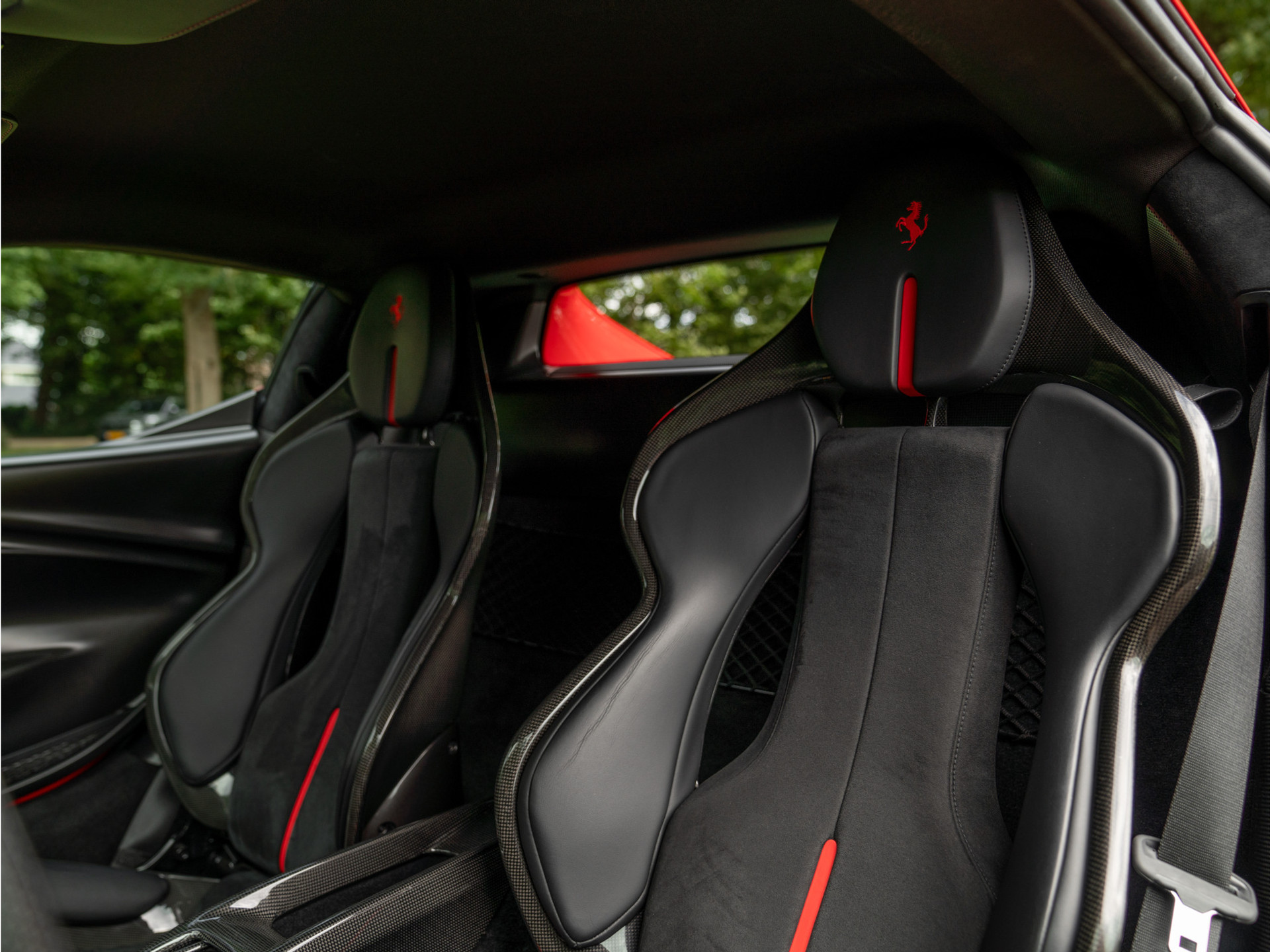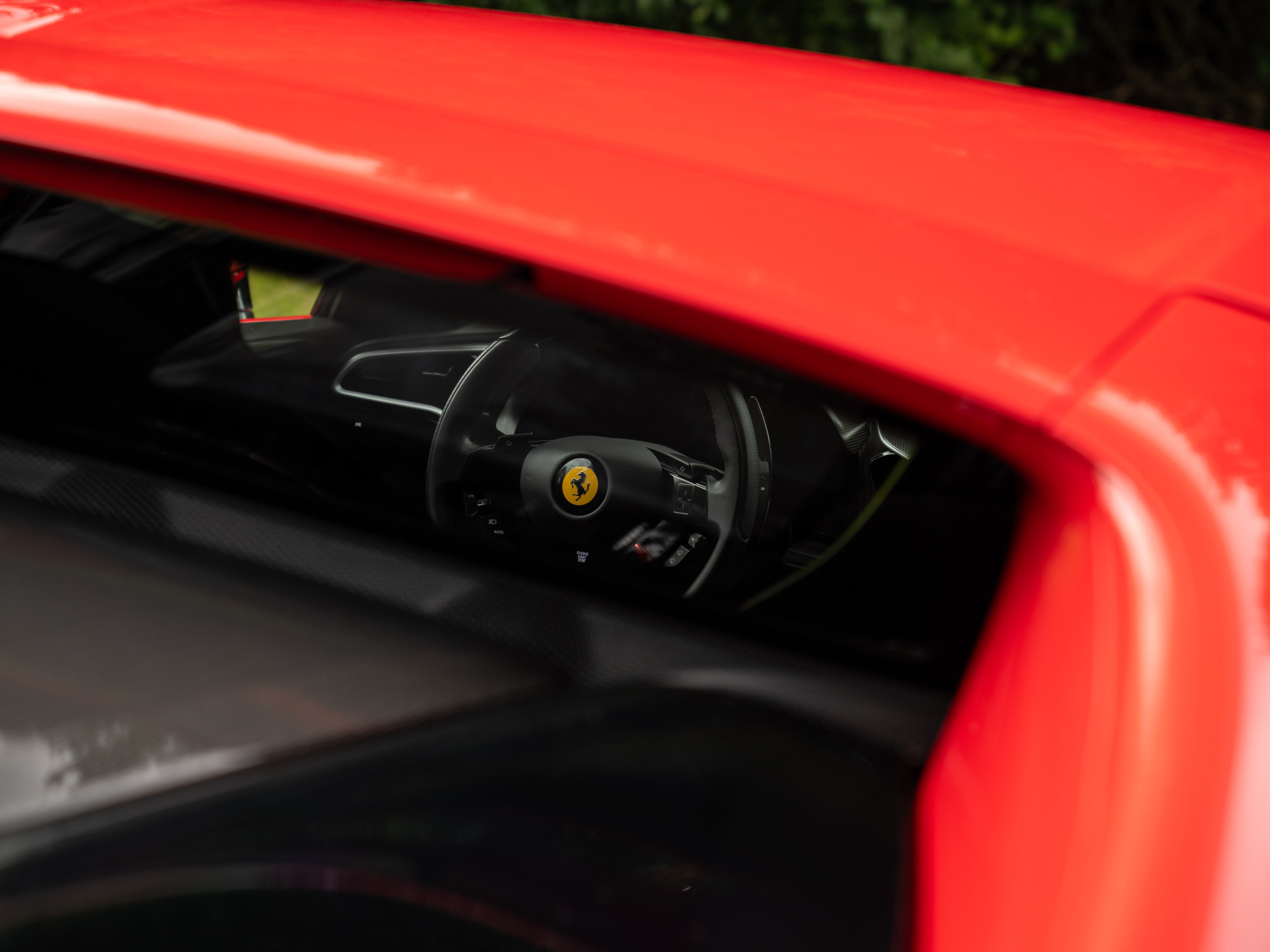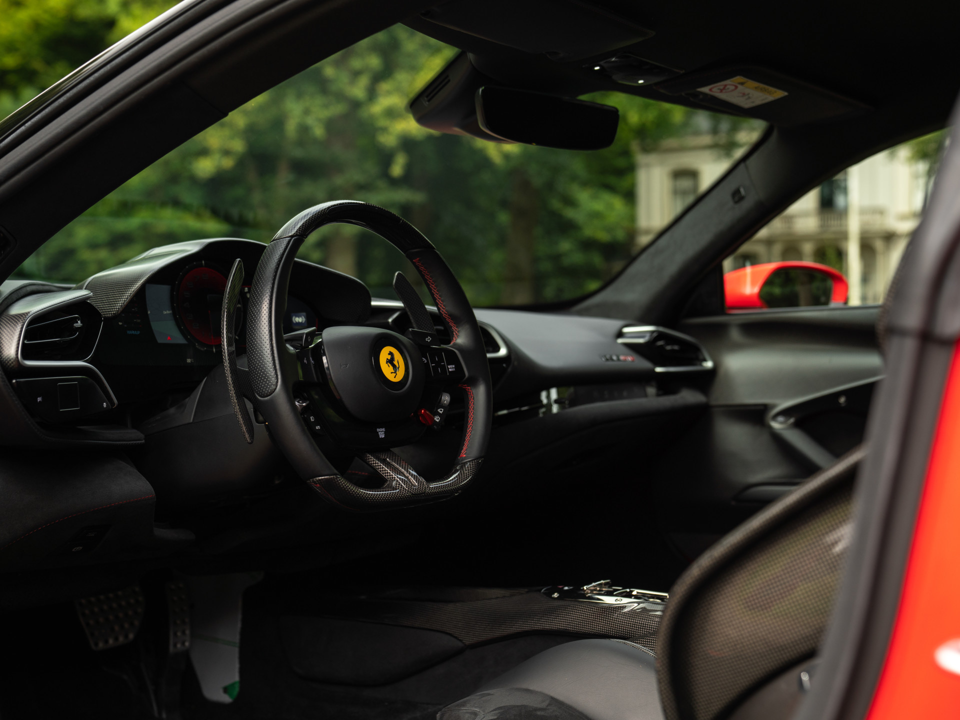 Gelukkig voor ons heeft de oorspronkelijke eigenaar de moeite genomen om de binnenkant van de Ferrari 296 GTB minstens zo spectaculair aan te kleden als de buitenkant. Stap over de carbon instaplijsten met Assetto Fiorano opdruk, en laat u zakken in heuse Carbon Racing Seats voorzien van Nero alcantara bekleding. Dezelfde bekleding komt terug aan de onderzijde van het dashboard + de stijlen. De carbon afwerking wordt op zijn beurt doorgetrokken tot en met het stuurwiel (inclusief LED Shift Indicator), de Shift Paddles en de complete midden-/tunnelconsole. Niet te zien vanuit de cockpit, maar wél aanwezig is de carbon kofferbakruimte voorin. Tot zover de glanzende koolstofvezel delen. De afslankkuur is namelijk (nog) groter dan dat: deurpanelen, achterwand én instrumentarium hebben een Matte Carbon finish. Ondanks de ongelimiteerde inspanningen om kilo’s te besparen, zag Ferrari ruimte om de 296 GTB cockpit in stijl op te fleuren. Het Rosso van de Cavallino’s in de hoofdsteunen komt namelijk één-op-één terug in de vorm van prachtige accenten in de stoelen, stiksels in stuur + dashboard, alsmede de digitale rev-counter. Briljant.
