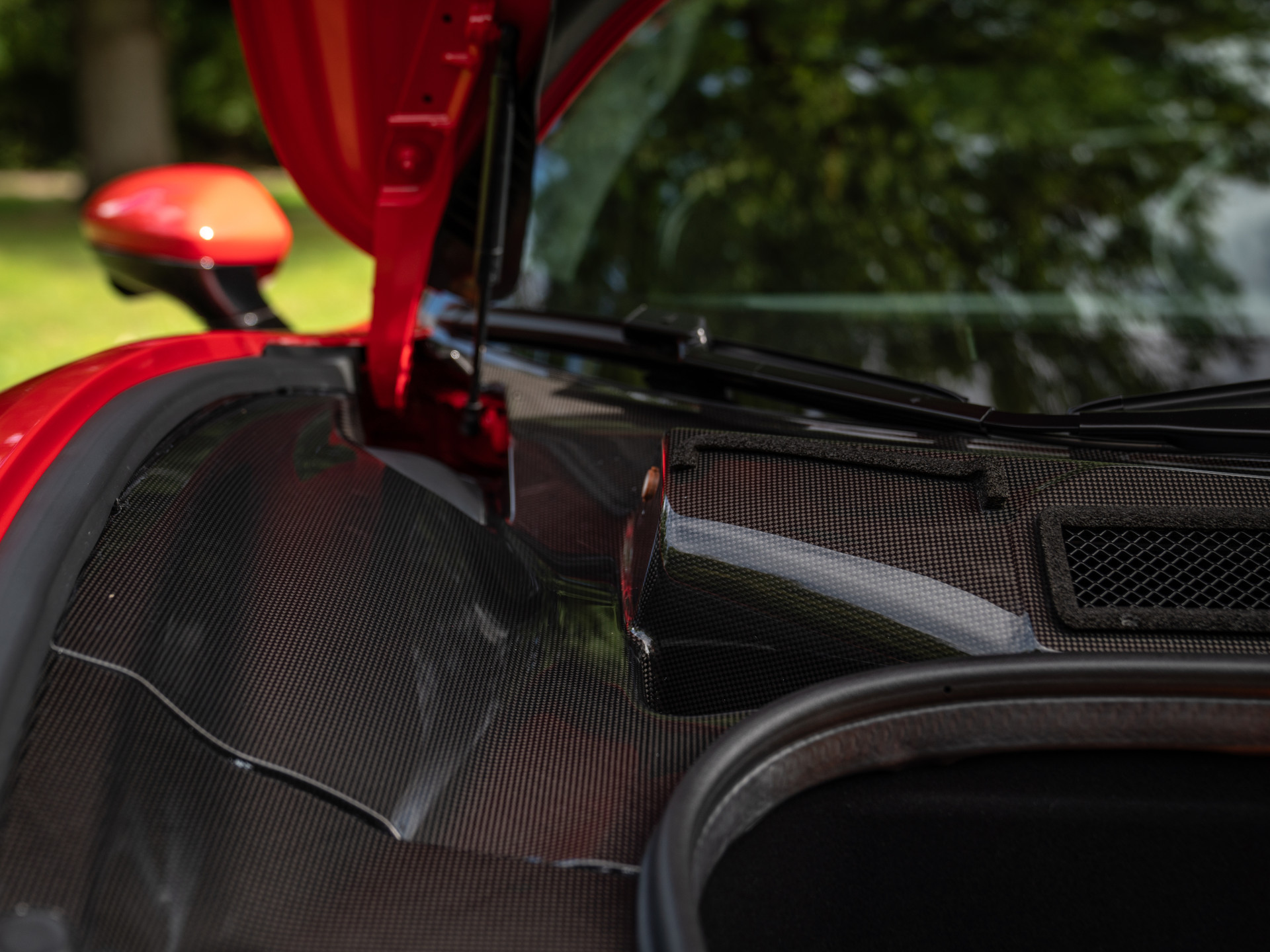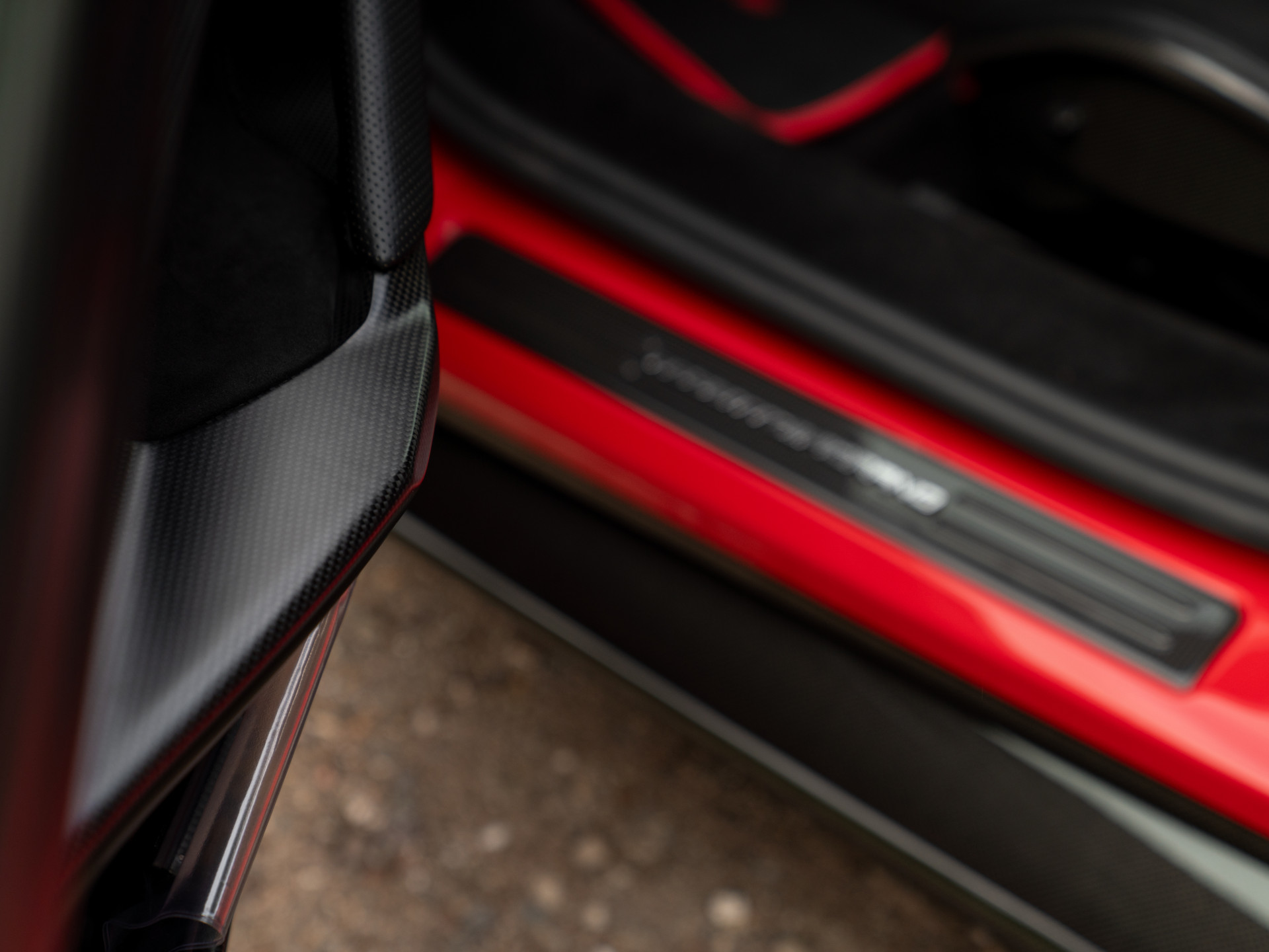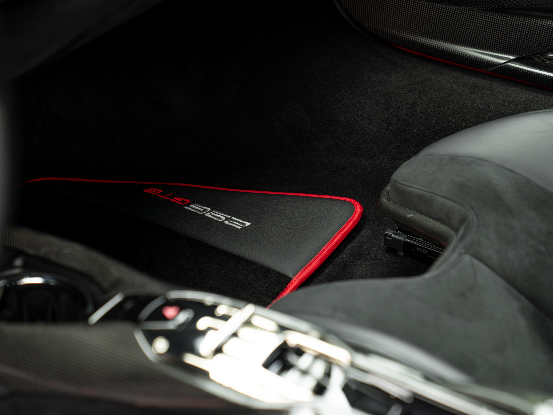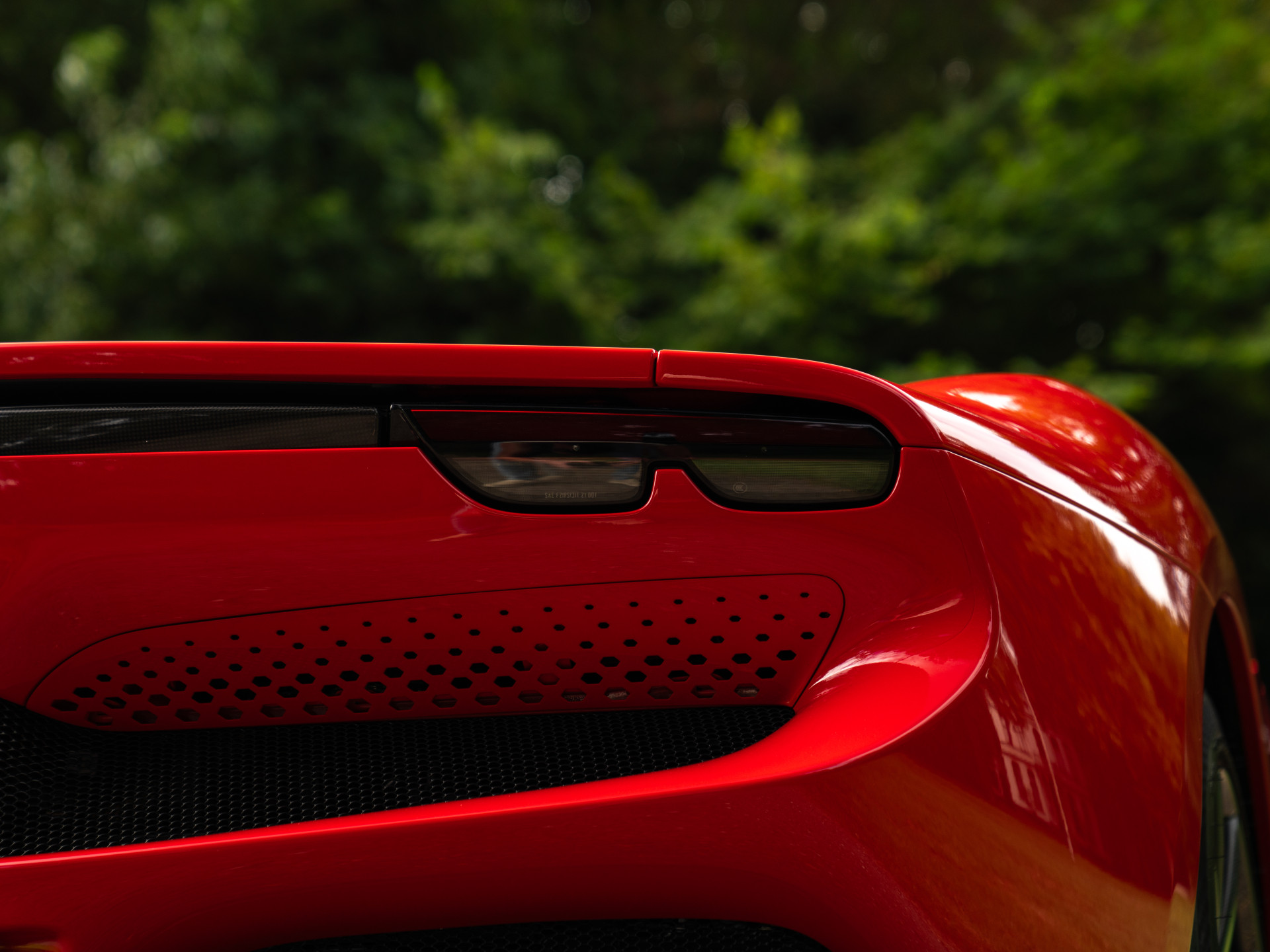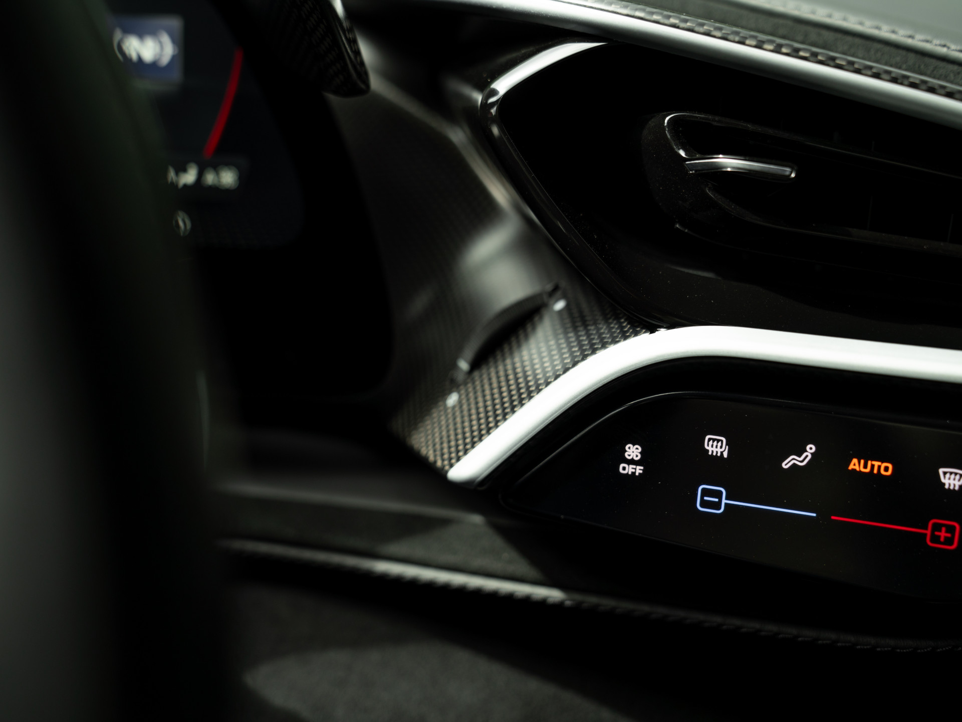 Gelukkig voor ons heeft de oorspronkelijke eigenaar de moeite genomen om de binnenkant van de Ferrari 296 GTB minstens zo spectaculair aan te kleden als de buitenkant. Stap over de carbon instaplijsten met Assetto Fiorano opdruk, en laat u zakken in heuse Carbon Racing Seats voorzien van Nero alcantara bekleding. Dezelfde bekleding komt terug aan de onderzijde van het dashboard + de stijlen. De carbon afwerking wordt op zijn beurt doorgetrokken tot en met het stuurwiel (inclusief LED Shift Indicator), de Shift Paddles en de complete midden-/tunnelconsole. Niet te zien vanuit de cockpit, maar wél aanwezig is de carbon kofferbakruimte voorin. Tot zover de glanzende koolstofvezel delen. De afslankkuur is namelijk (nog) groter dan dat: deurpanelen, achterwand én instrumentarium hebben een Matte Carbon finish. Ondanks de ongelimiteerde inspanningen om kilo’s te besparen, zag Ferrari ruimte om de 296 GTB cockpit in stijl op te fleuren. Het Rosso van de Cavallino’s in de hoofdsteunen komt namelijk één-op-één terug in de vorm van prachtige accenten in de stoelen, stiksels in stuur + dashboard, alsmede de digitale rev-counter. Briljant.