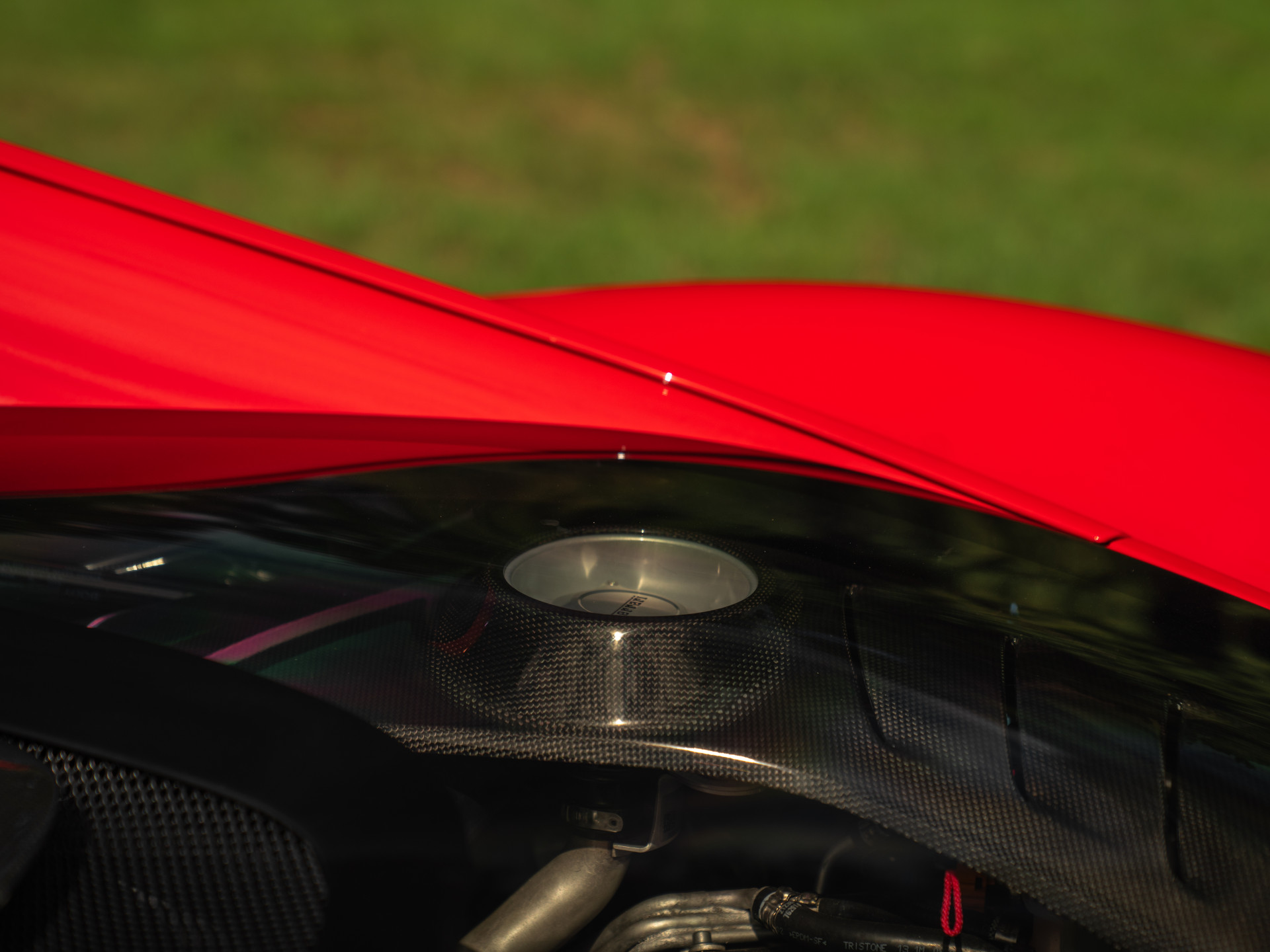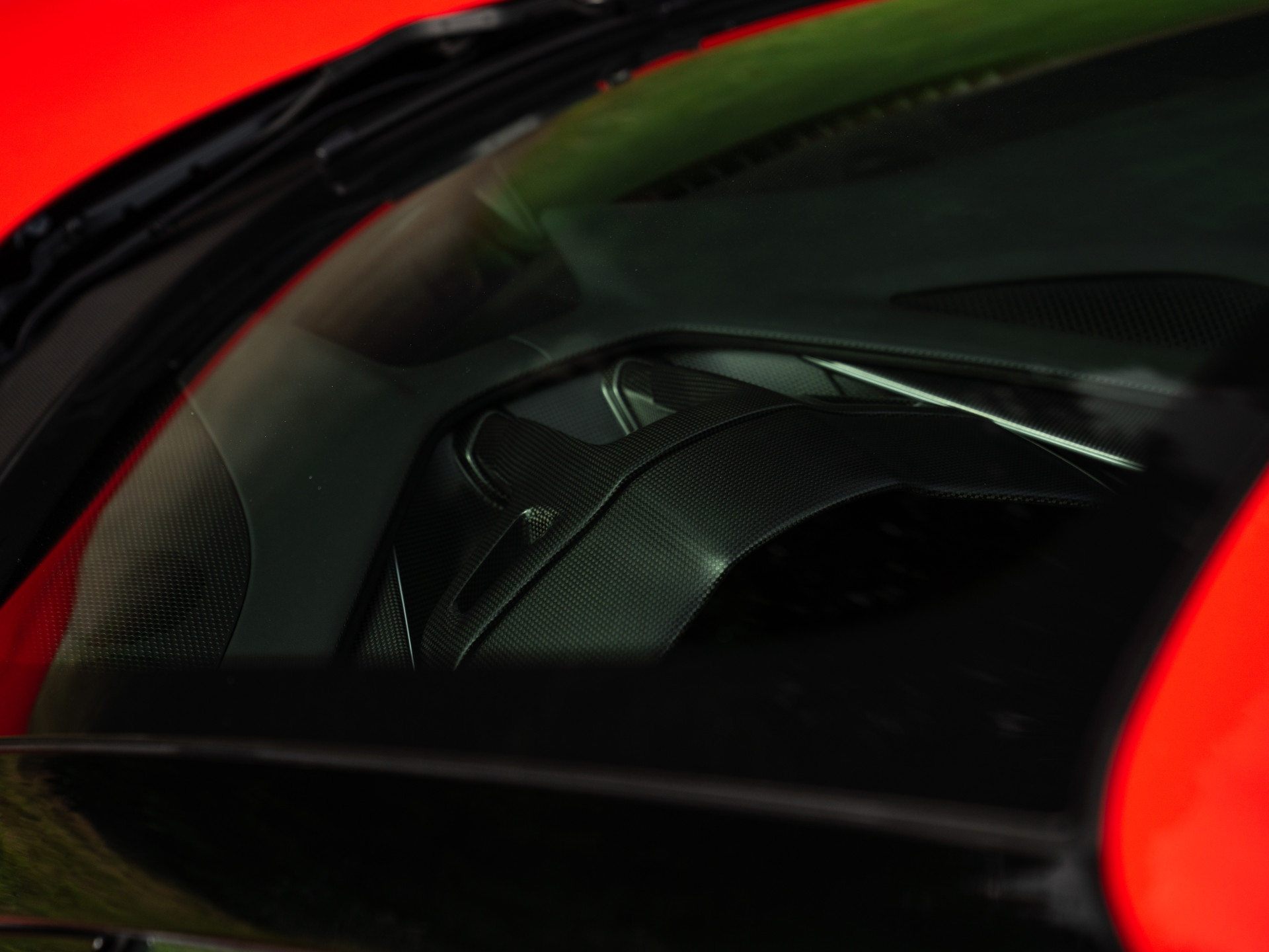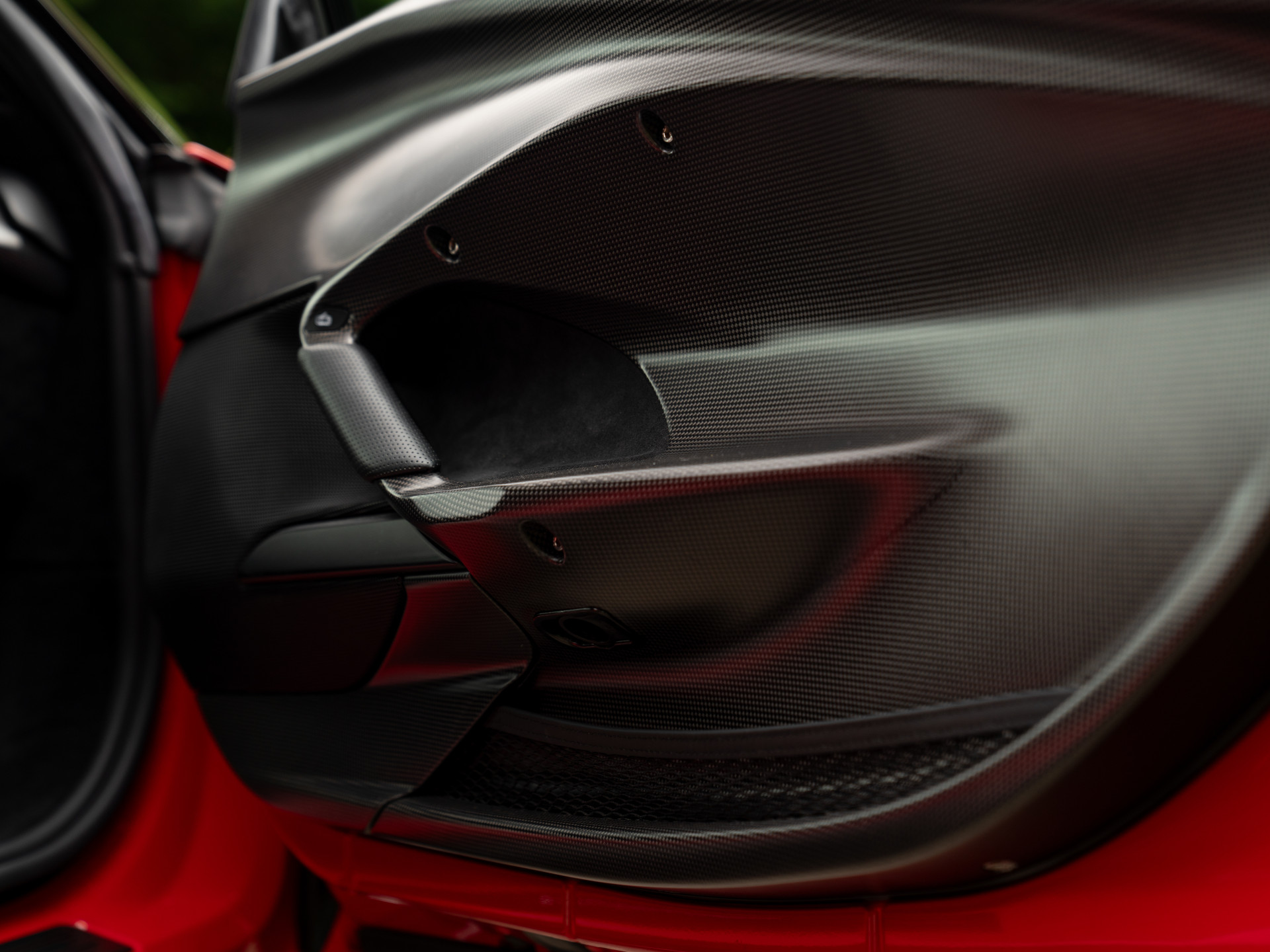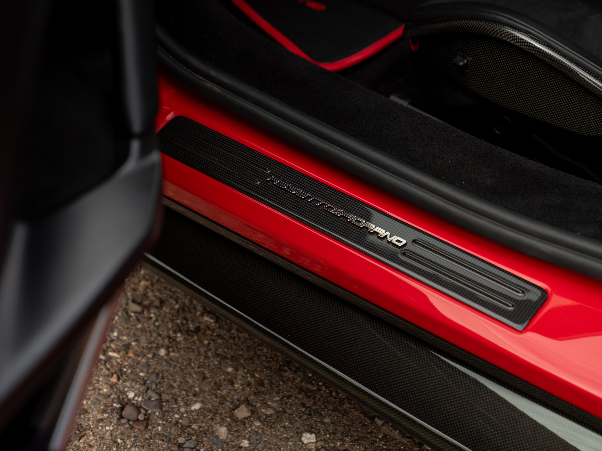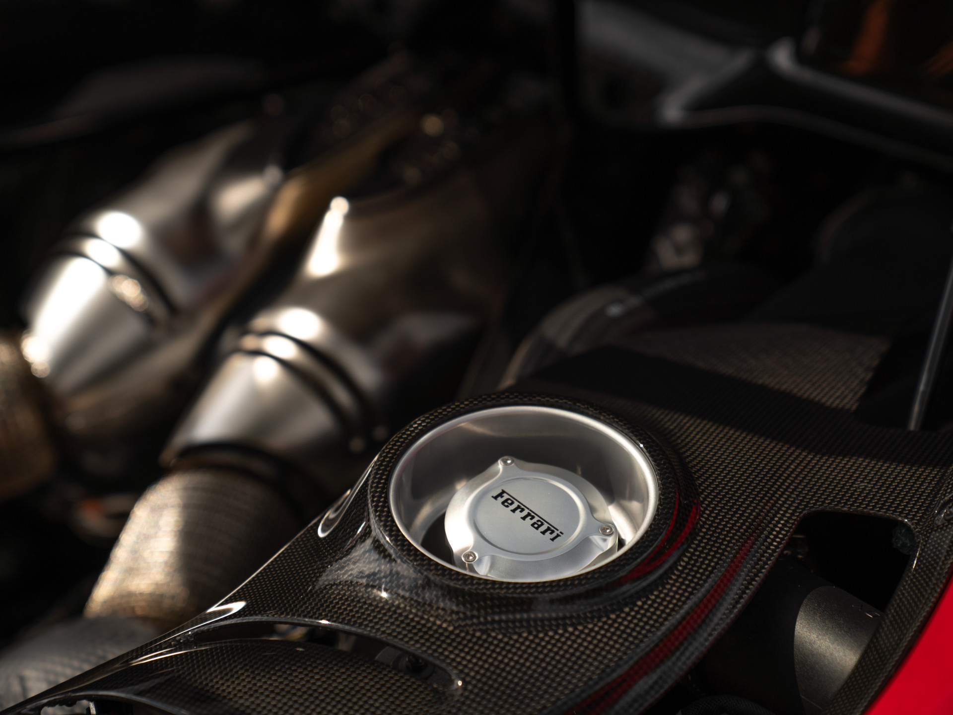Gelukkig voor ons heeft de oorspronkelijke eigenaar de moeite genomen om de binnenkant van de Ferrari 296 GTB minstens zo spectaculair aan te kleden als de buitenkant. Stap over de carbon instaplijsten met Assetto Fiorano opdruk, en laat u zakken in heuse Carbon Racing Seats voorzien van Nero alcantara bekleding. Dezelfde bekleding komt terug aan de onderzijde van het dashboard + de stijlen. De carbon afwerking wordt op zijn beurt doorgetrokken tot en met het stuurwiel (inclusief LED Shift Indicator), de Shift Paddles en de complete midden-/tunnelconsole. Niet te zien vanuit de cockpit, maar wél aanwezig is de carbon kofferbakruimte voorin. Tot zover de glanzende koolstofvezel delen. De afslankkuur is namelijk (nog) groter dan dat: deurpanelen, achterwand én instrumentarium hebben een Matte Carbon finish. Ondanks de ongelimiteerde inspanningen om kilo’s te besparen, zag Ferrari ruimte om de 296 GTB cockpit in stijl op te fleuren. Het Rosso van de Cavallino’s in de hoofdsteunen komt namelijk één-op-één terug in de vorm van prachtige accenten in de stoelen, stiksels in stuur + dashboard, alsmede de digitale rev-counter. Briljant.