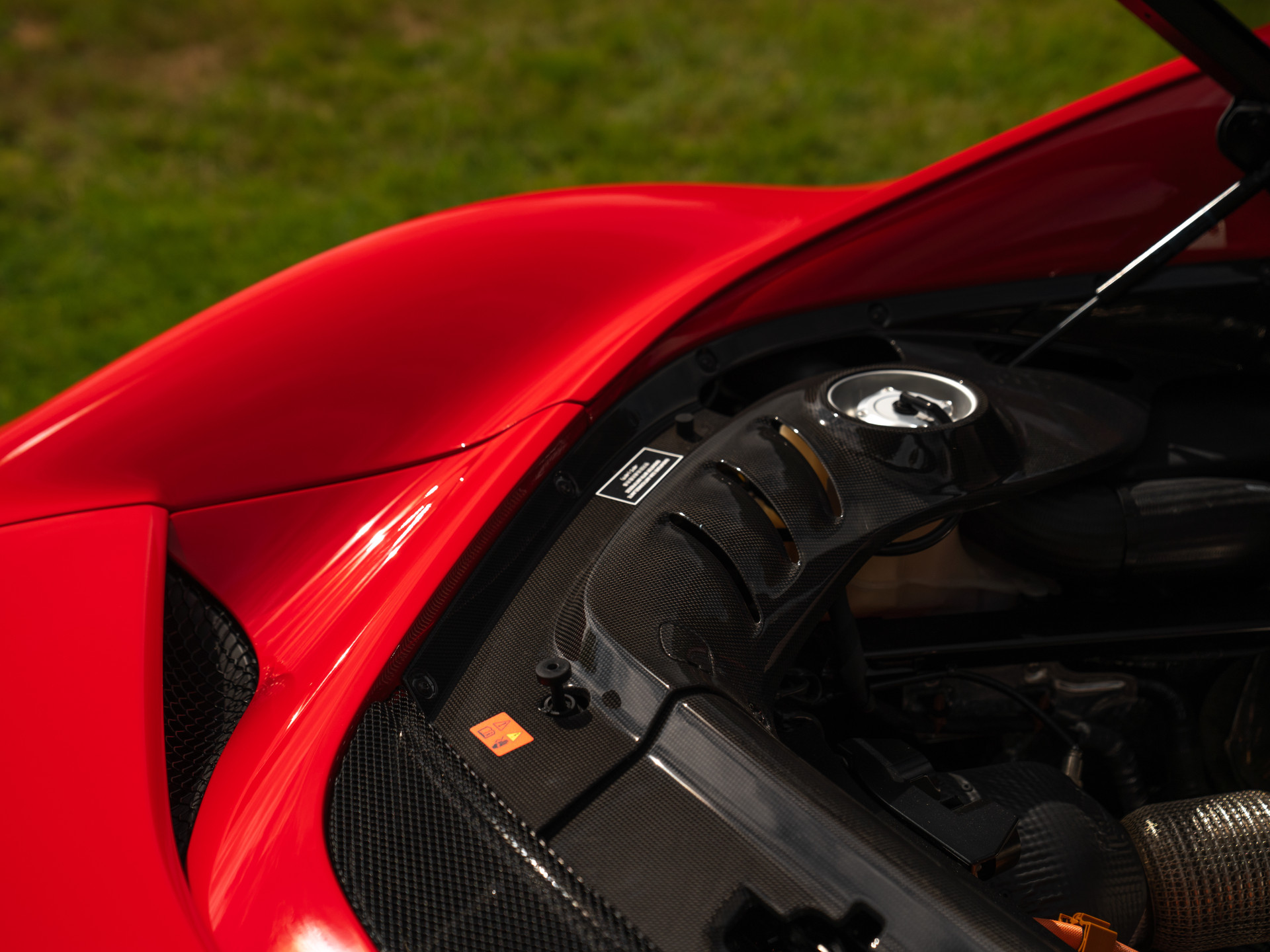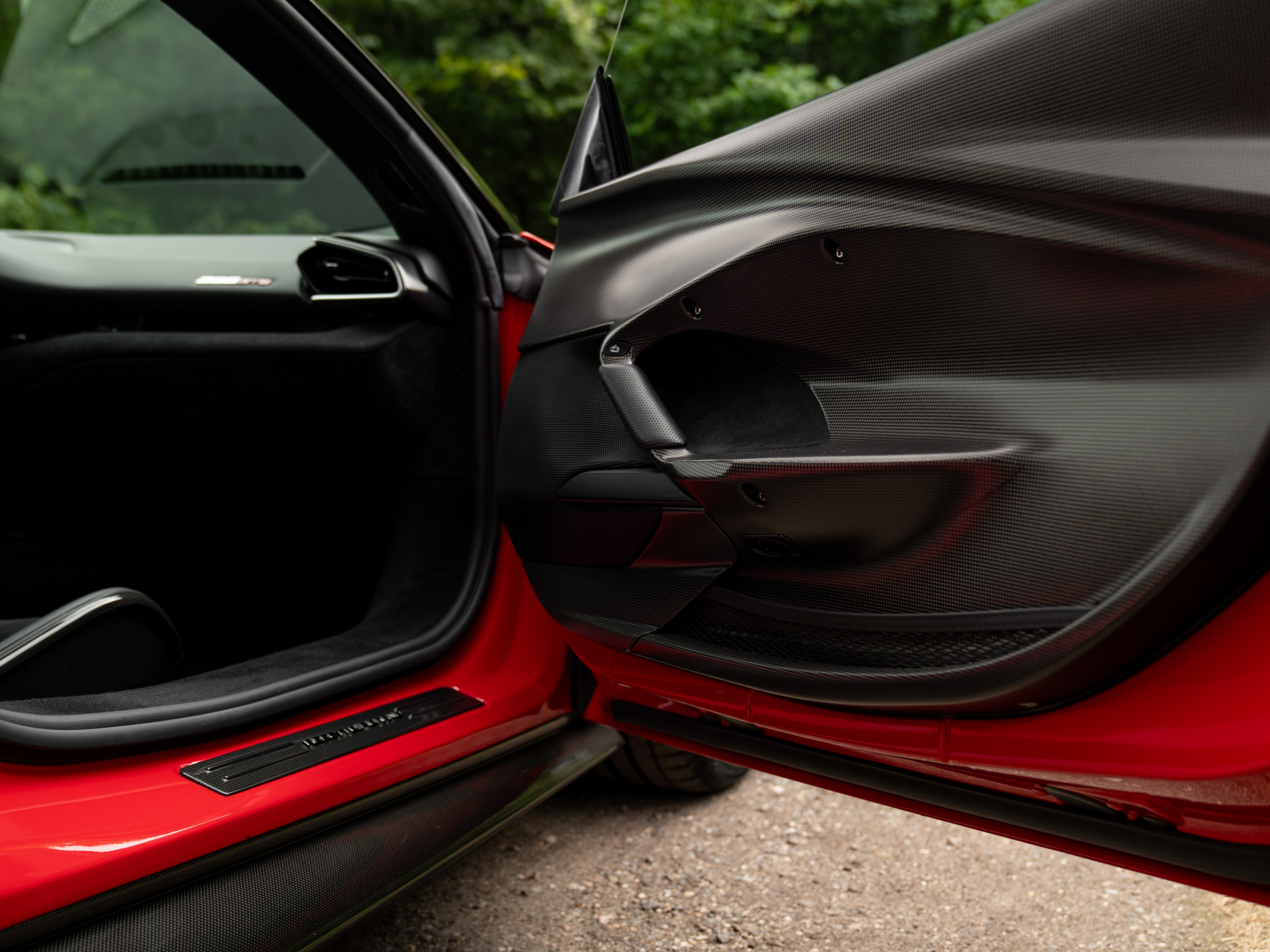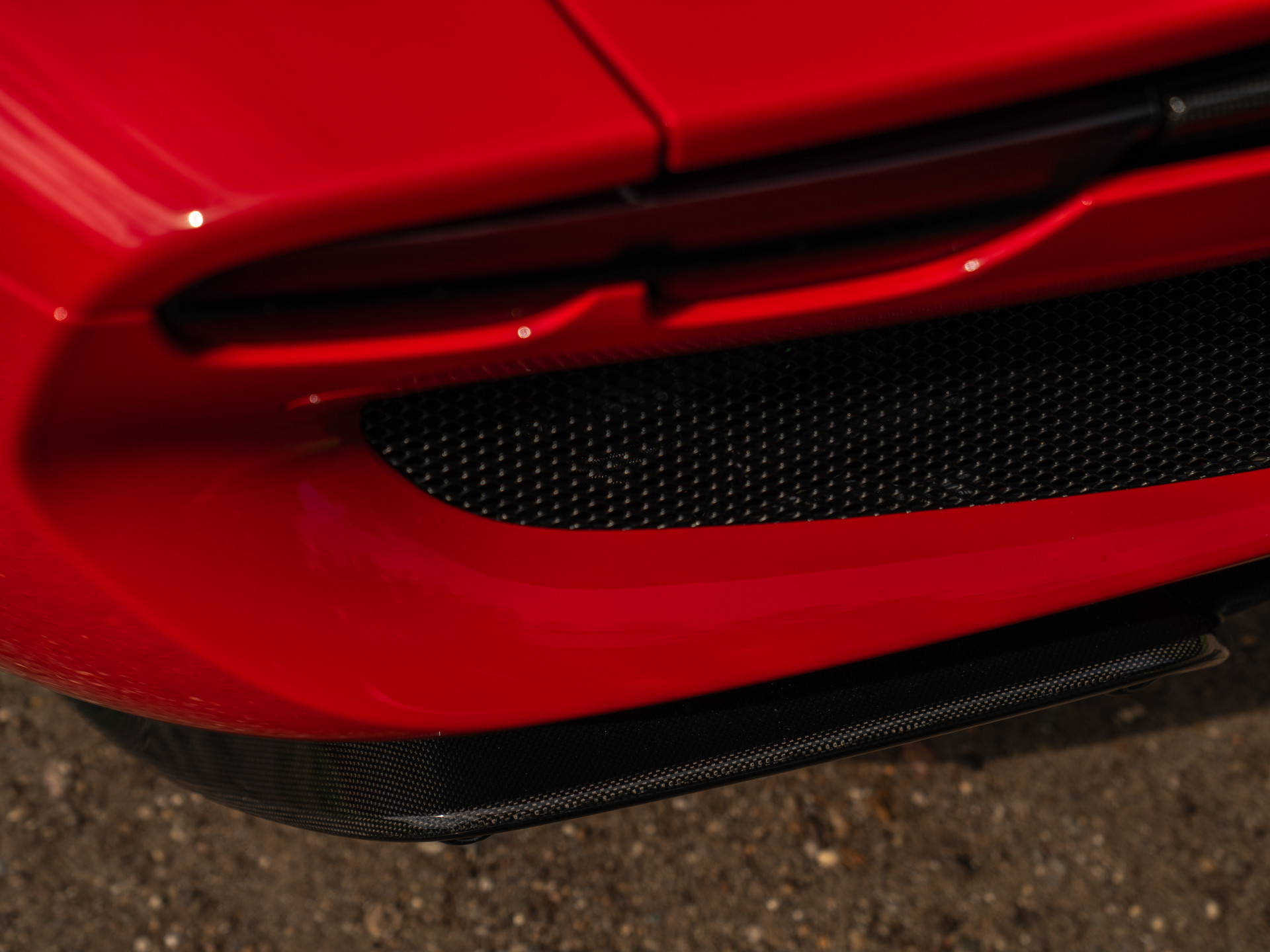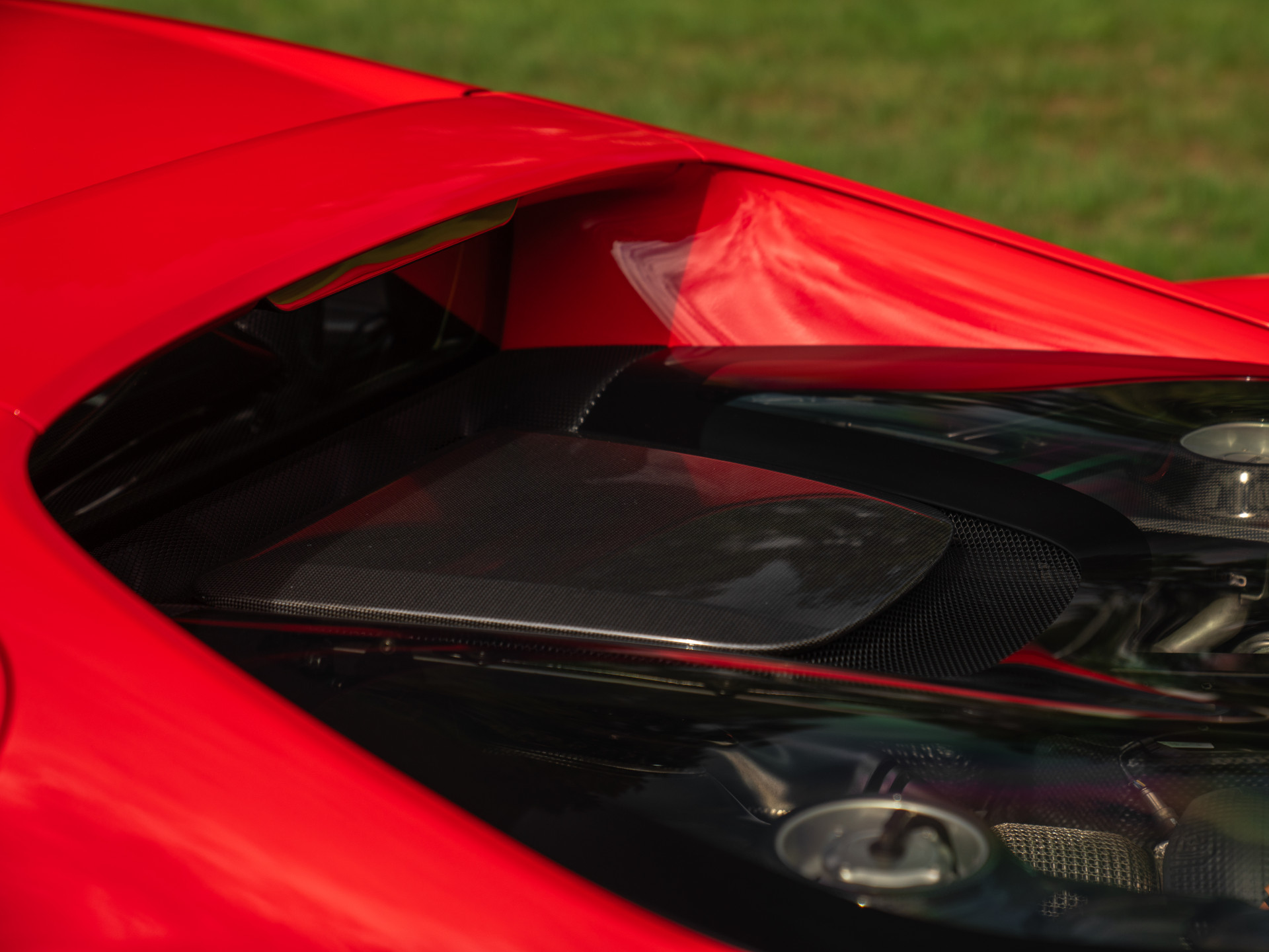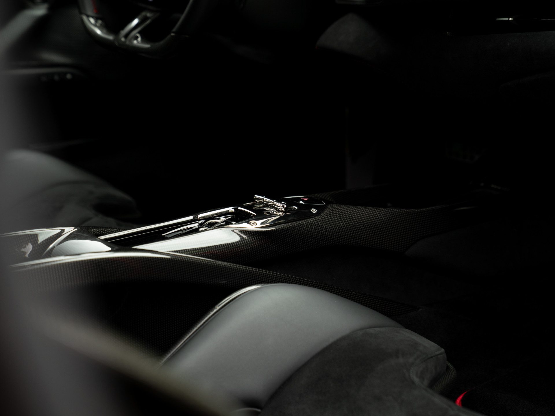 Gelukkig voor ons heeft de oorspronkelijke eigenaar de moeite genomen om de binnenkant van de Ferrari 296 GTB minstens zo spectaculair aan te kleden als de buitenkant. Stap over de carbon instaplijsten met Assetto Fiorano opdruk, en laat u zakken in heuse Carbon Racing Seats voorzien van Nero alcantara bekleding. Dezelfde bekleding komt terug aan de onderzijde van het dashboard + de stijlen. De carbon afwerking wordt op zijn beurt doorgetrokken tot en met het stuurwiel (inclusief LED Shift Indicator), de Shift Paddles en de complete midden-/tunnelconsole. Niet te zien vanuit de cockpit, maar wél aanwezig is de carbon kofferbakruimte voorin. Tot zover de glanzende koolstofvezel delen. De afslankkuur is namelijk (nog) groter dan dat: deurpanelen, achterwand én instrumentarium hebben een Matte Carbon finish. Ondanks de ongelimiteerde inspanningen om kilo’s te besparen, zag Ferrari ruimte om de 296 GTB cockpit in stijl op te fleuren. Het Rosso van de Cavallino’s in de hoofdsteunen komt namelijk één-op-één terug in de vorm van prachtige accenten in de stoelen, stiksels in stuur + dashboard, alsmede de digitale rev-counter. Briljant.