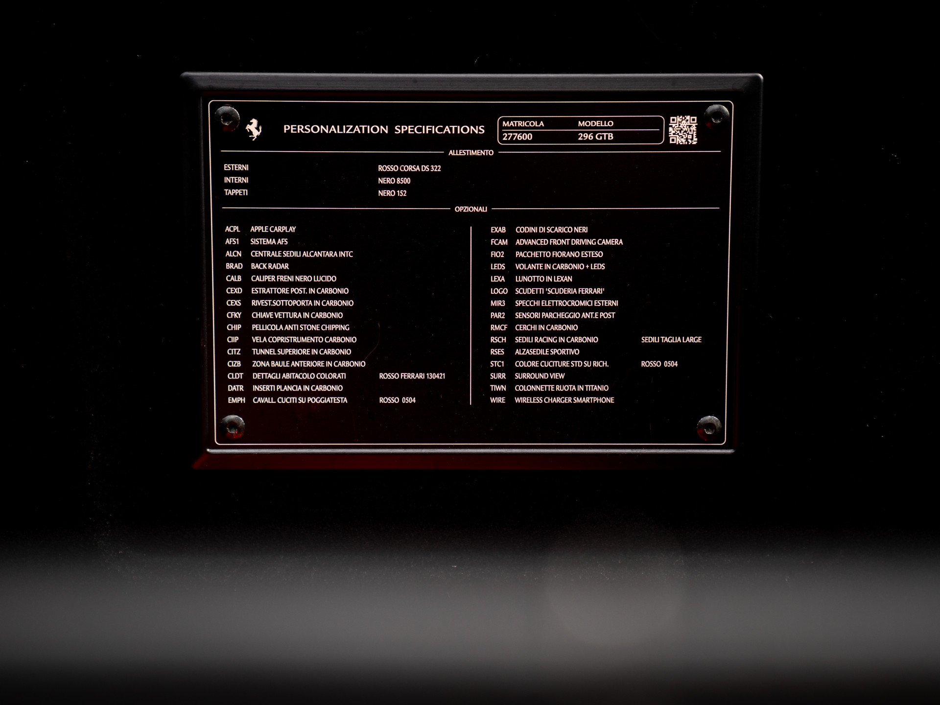 Heerlijke 296 GTB met werkelijk alle opties inclusief het Assetto Fiorano pakket met heel veel carbon, lexan motorkap etc. Auto is volledig voorzien van PPF en keramische coating, verlengde fabrieksgarantie t/m 04-2029 en een carbon motorruimte t.w.v. €8.500.