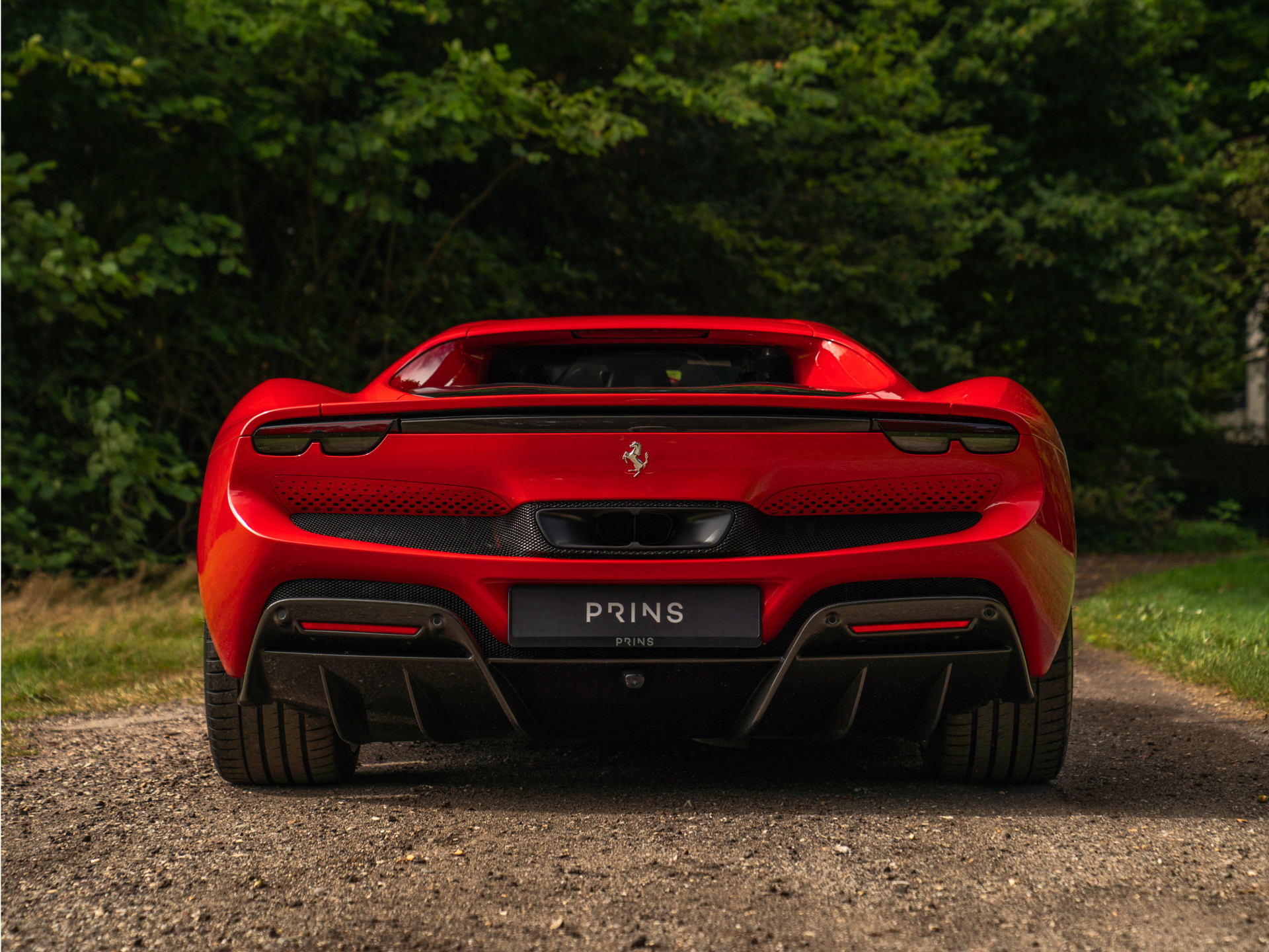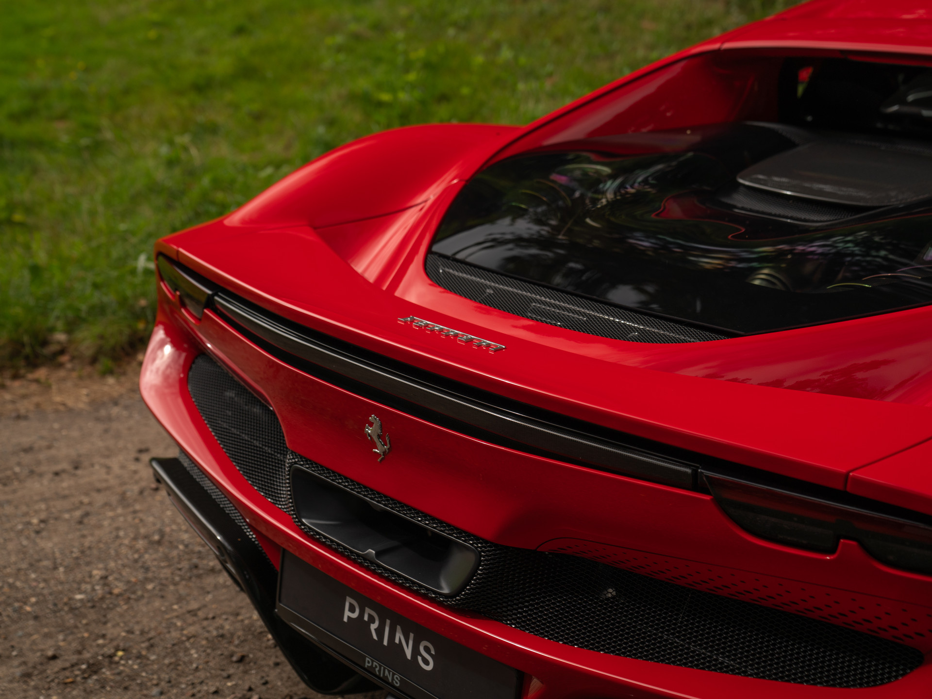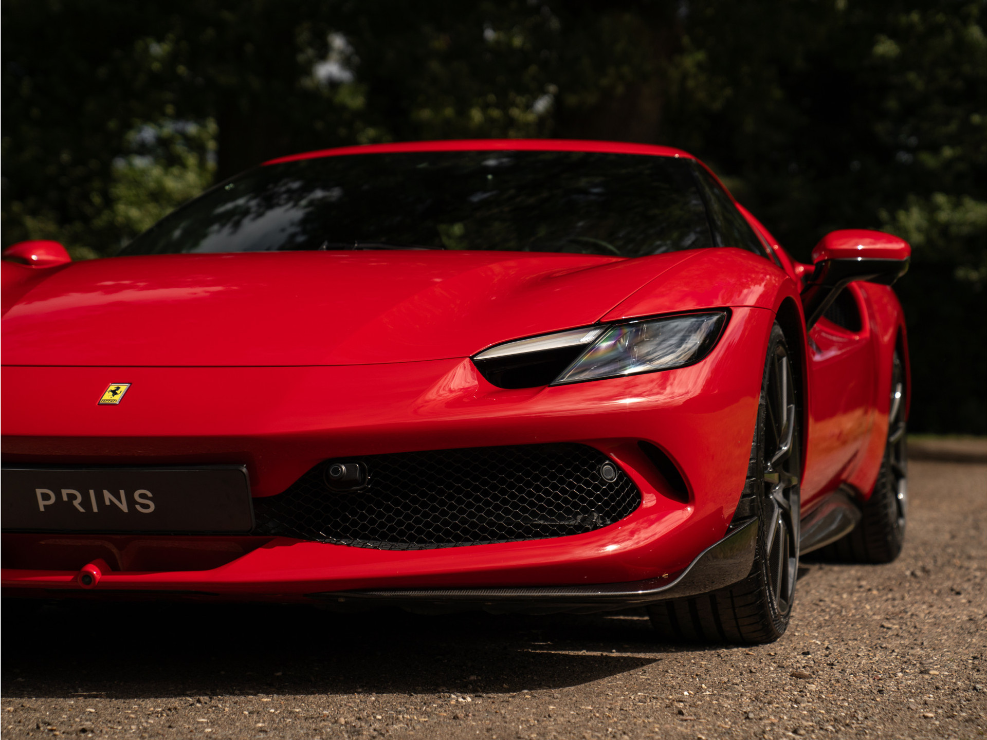 Wie droomt van een Ferrari 296 GTB zet pertinent een streep door alle andere aanbiedingen na het zien van dit Prinselijke exemplaar. Ons Rosso Corsa paradepaardje wordt namelijk geleverd mét Assetto Fiorano pack voor minder gewicht en maximale downforce! Ook levert de professionele afslankkuur van dit aerodynamische zwaargewicht een verpletterende uitstraling op. De 296 GTB beschikt over een vederlichte carbon spoilerkit en dito panelen + wielen voorzien van rubber dat nóg beter aan het asfalt kleeft. De optionele Lexan motorkap is eveneens inbegrepen voor extra kilo’s gewichtsbesparing. In de wereld van Ferrari staat dit gelijk aan méér performance. De (matte) carbon uitgevoerde cockpit met lichtgewicht racestoelen en LED’s in het koolstofvezel stuurwiel heeft duidelijk circuitambities. Verder zijn inbegrepen een Surround View Camera, Carbon Frunk (!) en een originele Paint Protection Film af-fabriek om de Italiaanse supercar zo mooi mogelijk te houden. Al zal veel afhangen van de grip die de 830 pk sterke V6 Hybrid te bieden heeft…