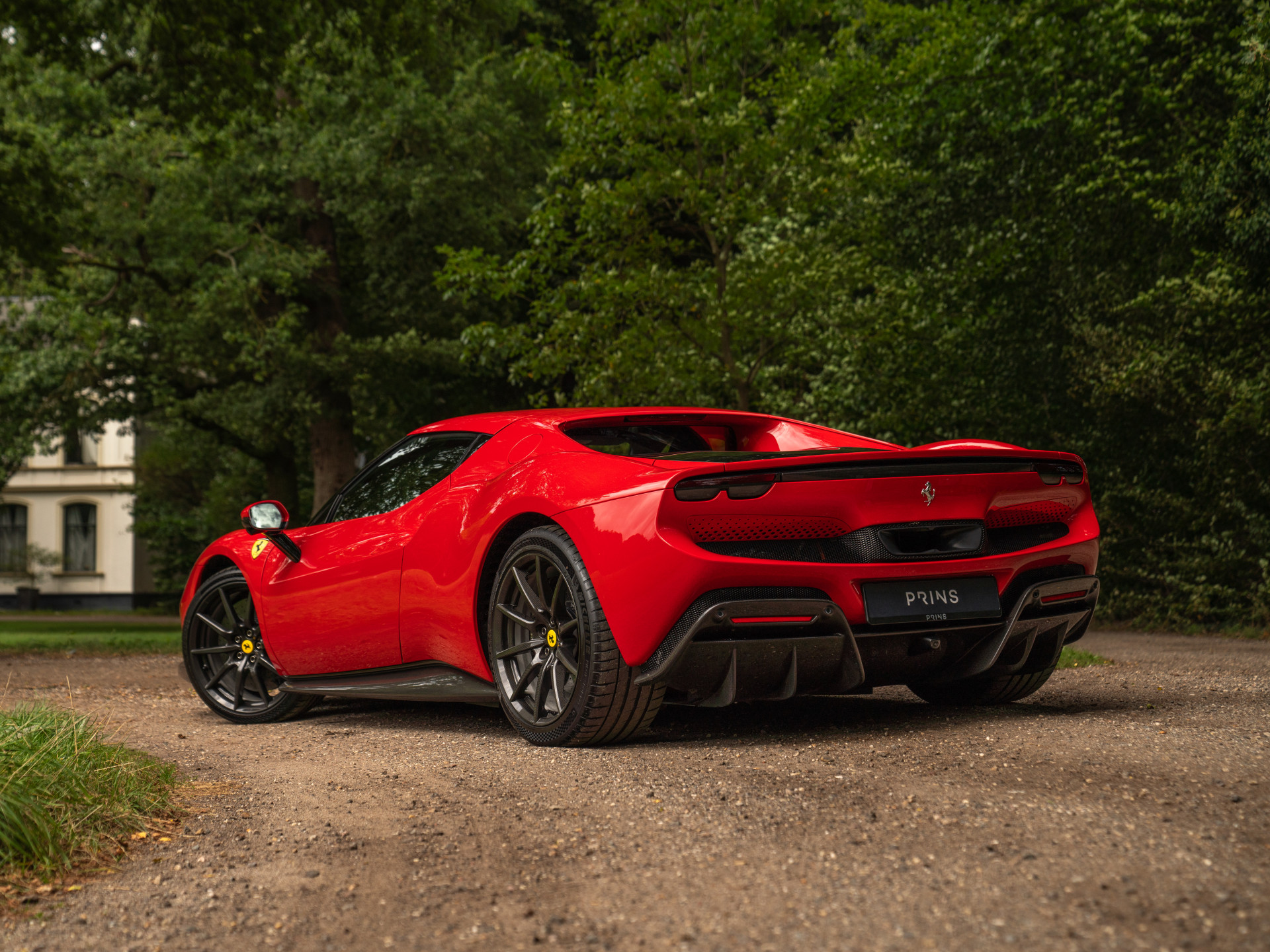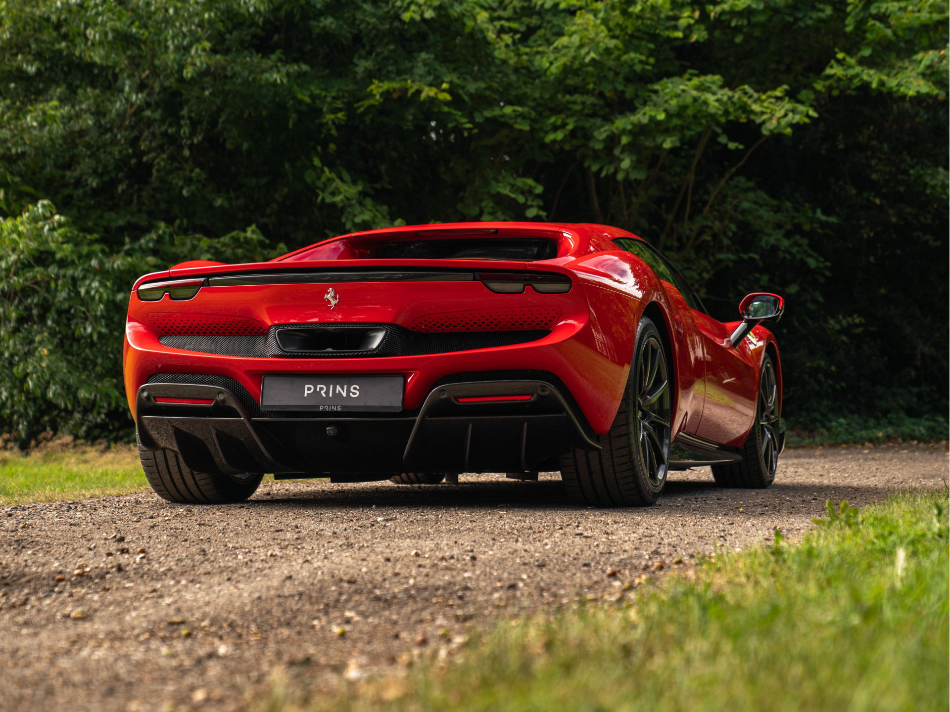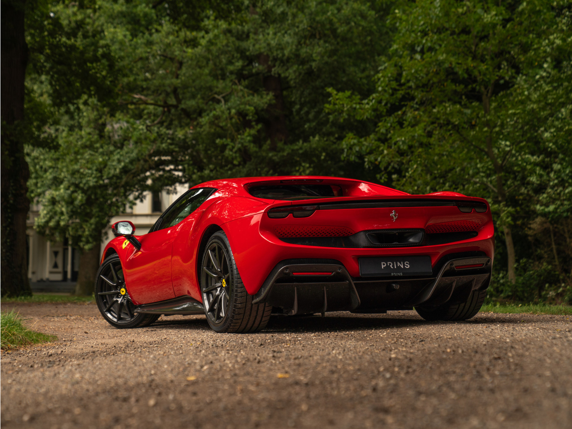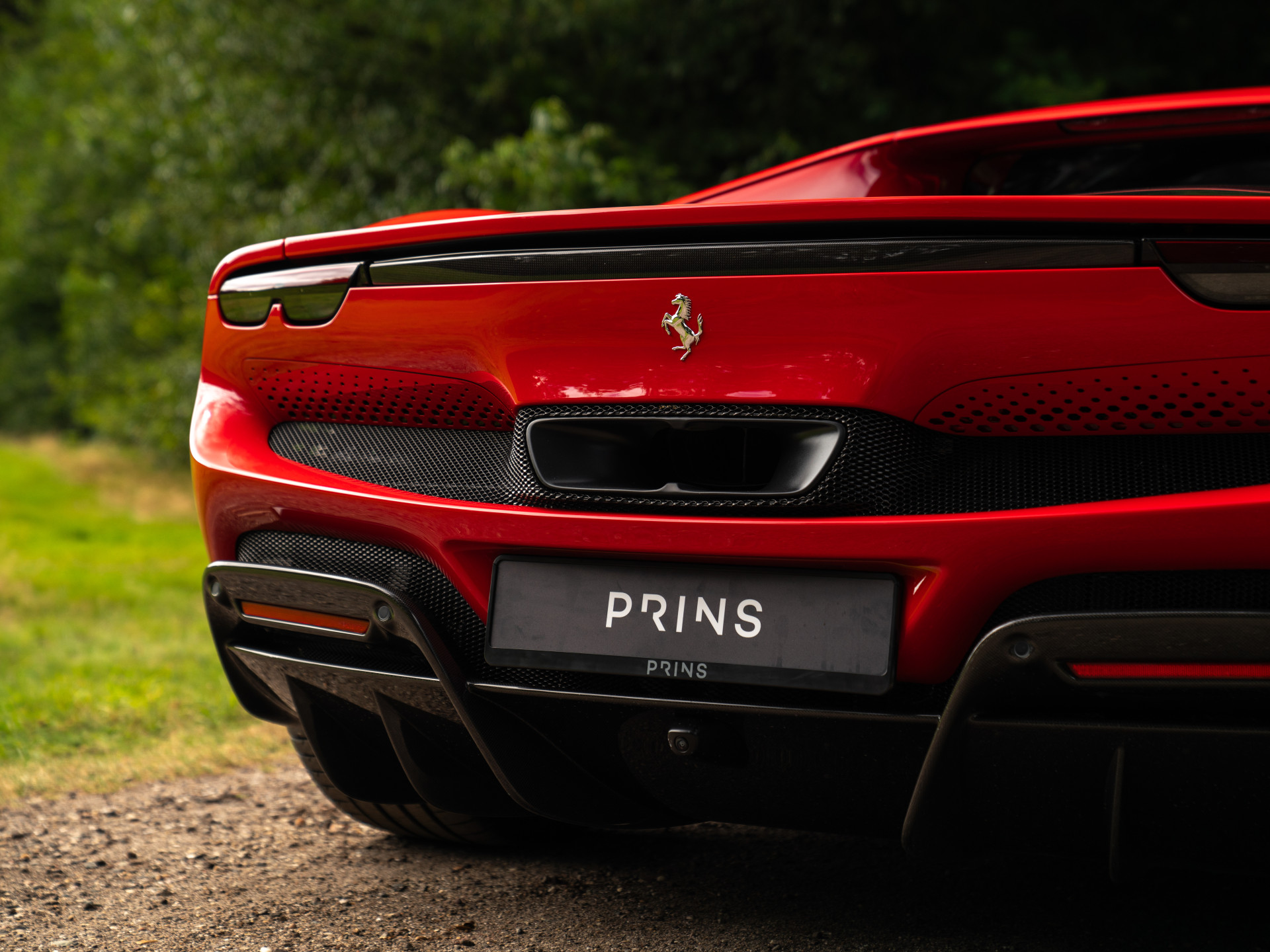 Wie droomt van een Ferrari 296 GTB zet pertinent een streep door alle andere aanbiedingen na het zien van dit Prinselijke exemplaar. Ons Rosso Corsa paradepaardje wordt namelijk geleverd mét Assetto Fiorano pack voor minder gewicht en maximale downforce! Ook levert de professionele afslankkuur van dit aerodynamische zwaargewicht een verpletterende uitstraling op. De 296 GTB beschikt over een vederlichte carbon spoilerkit en dito panelen + wielen voorzien van rubber dat nóg beter aan het asfalt kleeft. De optionele Lexan motorkap is eveneens inbegrepen voor extra kilo’s gewichtsbesparing. In de wereld van Ferrari staat dit gelijk aan méér performance. De (matte) carbon uitgevoerde cockpit met lichtgewicht racestoelen en LED’s in het koolstofvezel stuurwiel heeft duidelijk circuitambities. Verder zijn inbegrepen een Surround View Camera, Carbon Frunk (!) en een originele Paint Protection Film af-fabriek om de Italiaanse supercar zo mooi mogelijk te houden. Al zal veel afhangen van de grip die de 830 pk sterke V6 Hybrid te bieden heeft…