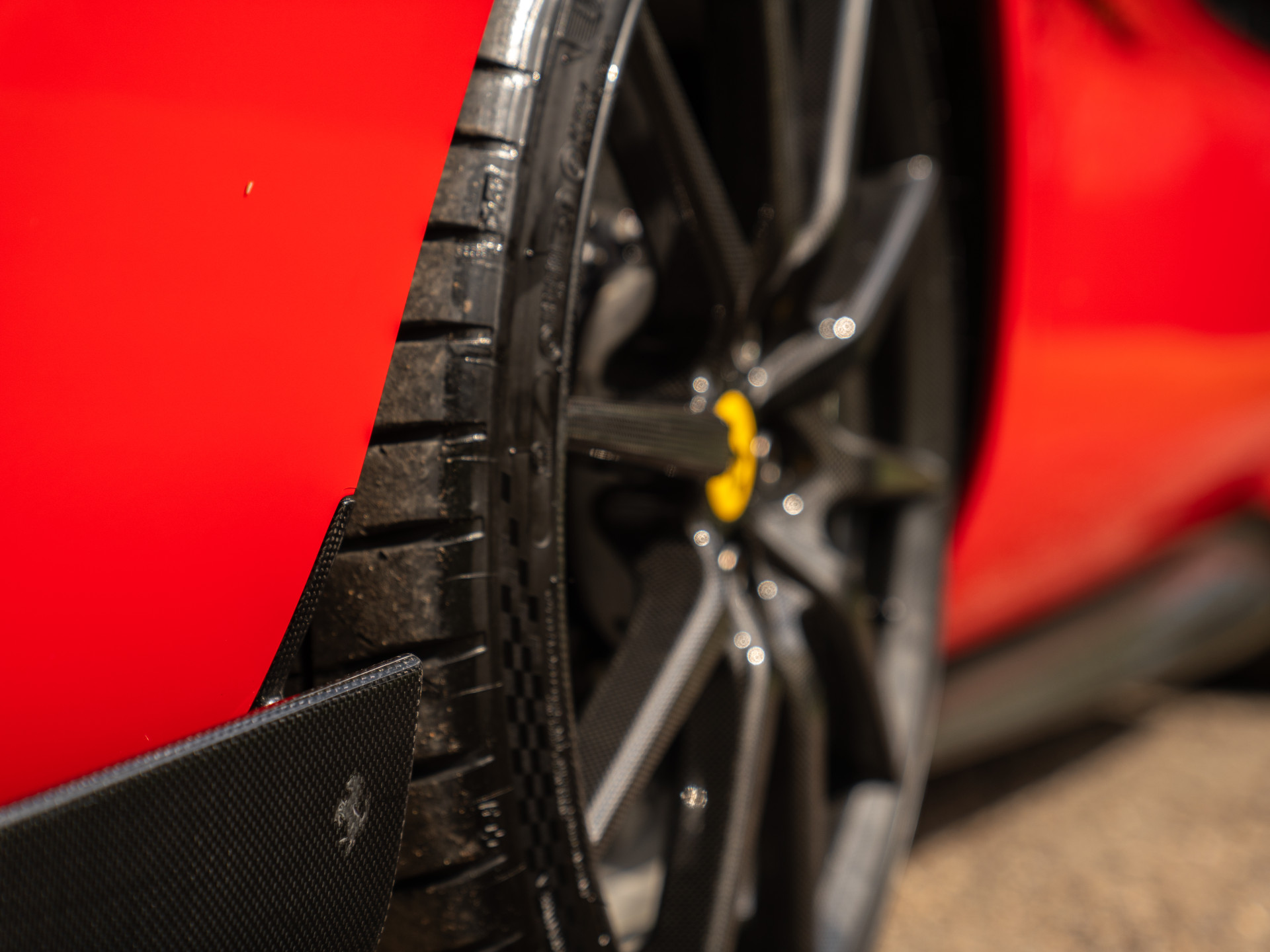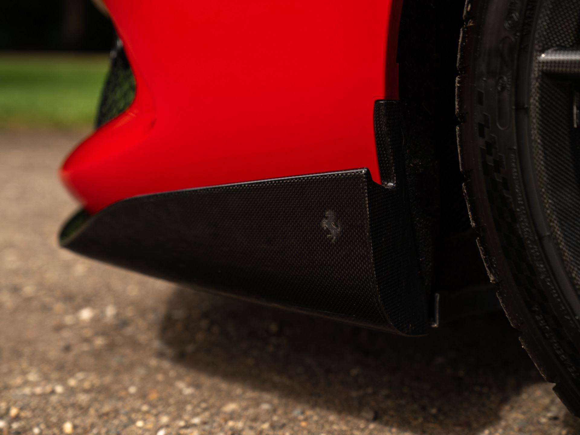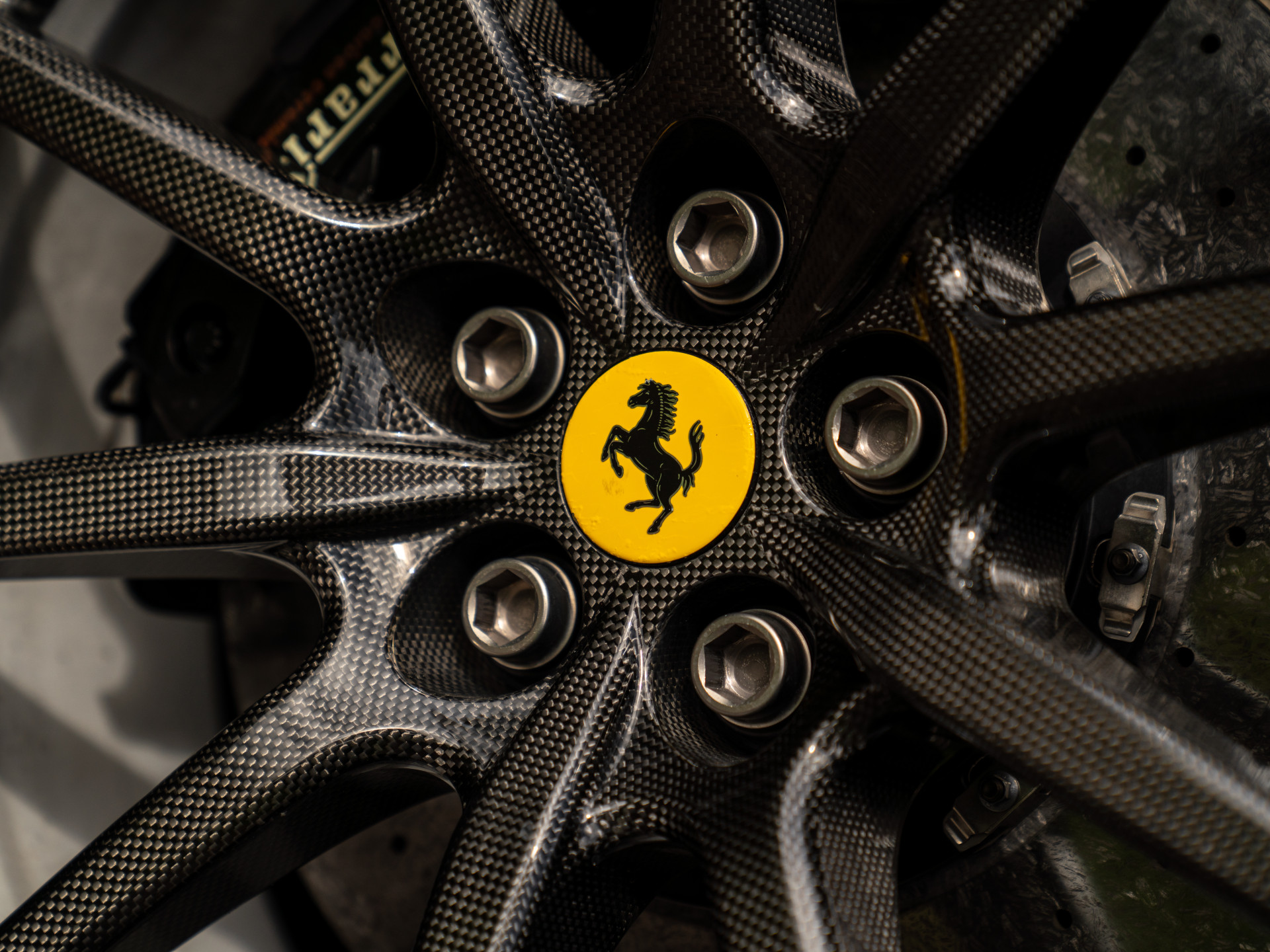 Stiekem is de Ferrari 296 GTB een stuk uitbundiger dan hij doet voorkomen. Het koetswerk is namelijk opvallend gladgestreken en toont zich in vergelijking met bijvoorbeeld de F8 tamelijk eenvoudig. Eenvoud siert de 296, want onderhuids is de Gran Turismo Berlinetta geavanceerder dan ooit. In combinatie met het Assetto Fiorano pakket laat dit exemplaar wel wat meer van zijn scherpe randjes zien. Carbon randjes, waaronder in de vorm van een frontsplitter, sideskirts, diffusor, achterdek en verbinding tussen de achterlichtunits. Let ook op details zoals het Ferrari-embleem aan de zijkant van de carbon frontspoiler; een teken dat de beschermende front-PPF in de Italiaanse fabriek is gemonteerd. De eigenaar voegde hier nog een volledige PPF behandeling en keramische coating aan toe. Uiteraard keert het steigerende paard terug in de Scuderia Ferrari Shields op de voorste schermen, maar onze aandacht gaat vooral uit naar de velgen: volledig gemaakt van carbon! De Nero remklauwen erachter doen hun best om niet al te veel voor afleiding te zorgen te midden van het koolstofvezel feestje. Verder is de optionele Lexan motorkap eveneens gewichtsbesparend, deze geeft zicht op een carbon motorruimte t.w.v. €8.500.
