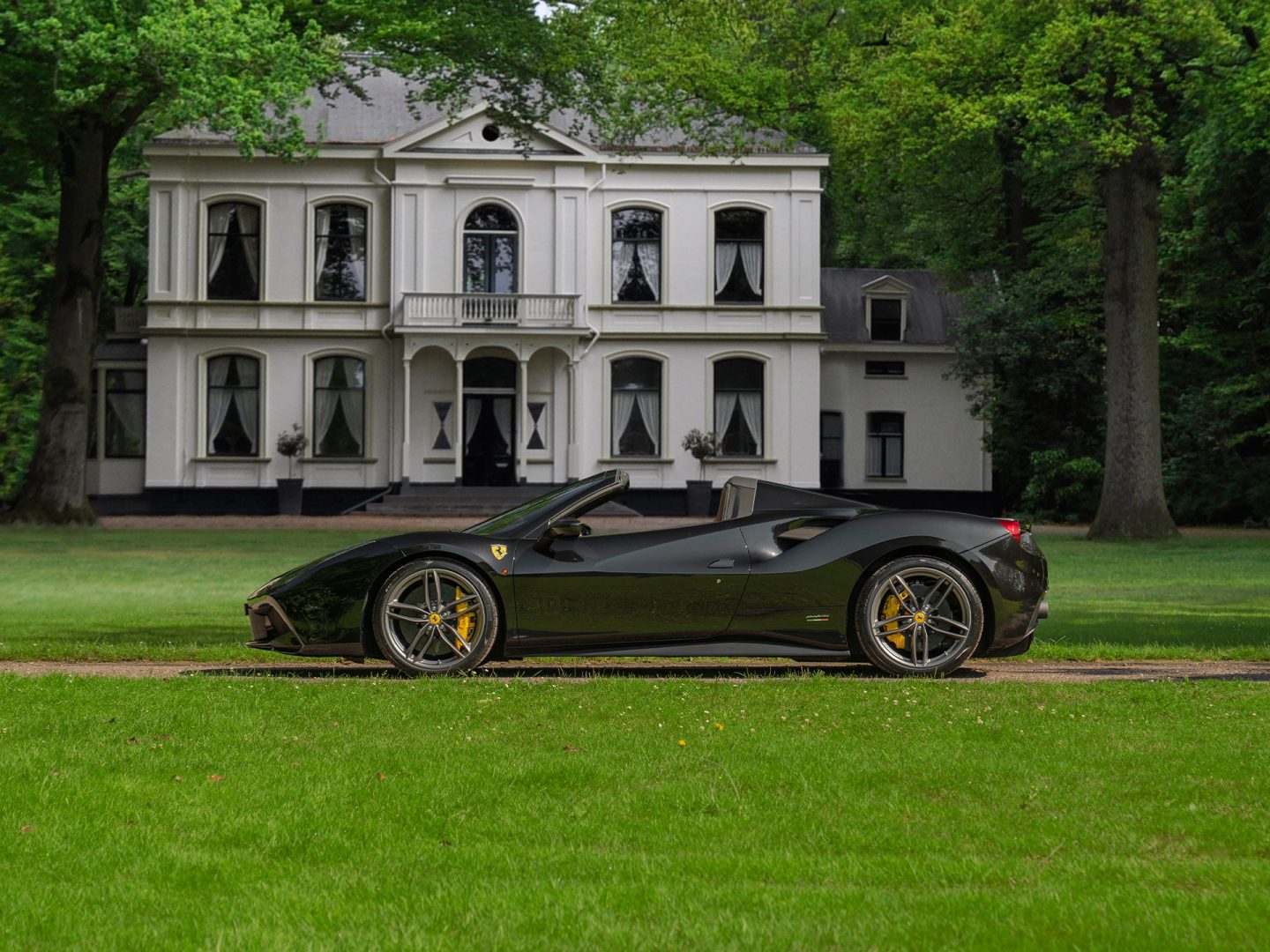 Ook de cockpit barst van het Italiaanse charisma en is bijzonder origineel c.q. smaakvol geconfigureerd. Zitten doet u op Cuoio lederen Daytona Racing Seats. Daarmee heeft de dakloze 488 de stijl van een legendarische klassieker en de opbouw van een compromisloze exoot. Op het dashboard + de deurpanelen wisselen Nero (bovenkant) en Cuoio leder elkaar af. Let daarnaast op finesses zoals de Cuoio Sella Cavallino’s in de hoofdsteunen: het is een beetje hetzelfde als koolstofvezel combineren met zwart; op detailniveau is er verschil. En precies dat maakt onze Spider begerenswaardiger dan andere exemplaren. Over koolstofvezel gesproken: naast de kuipstoelen zijn ook instaplijsten, deurpanelen (!), dashboard inserts en Central Bridge uit carbon opgebouwd. Aanvullend op het Carbon Racing Package heeft dit exemplaar een Carbon Driver Zone. Met andere woorden: stuurwiel (inclusief LED Shift Indicator), Shift Paddles, ring rondom rev-counter, alsmede diverse bedieningselementen eromheen hebben een peperduur, lichtgewicht finish. Dankzij een heuse Racing Seat Lifter is de positie achter de Giallo toerenteller werkelijk perfect. Hadden we al gezegd dat de conditie al net zo fenomenaal is?