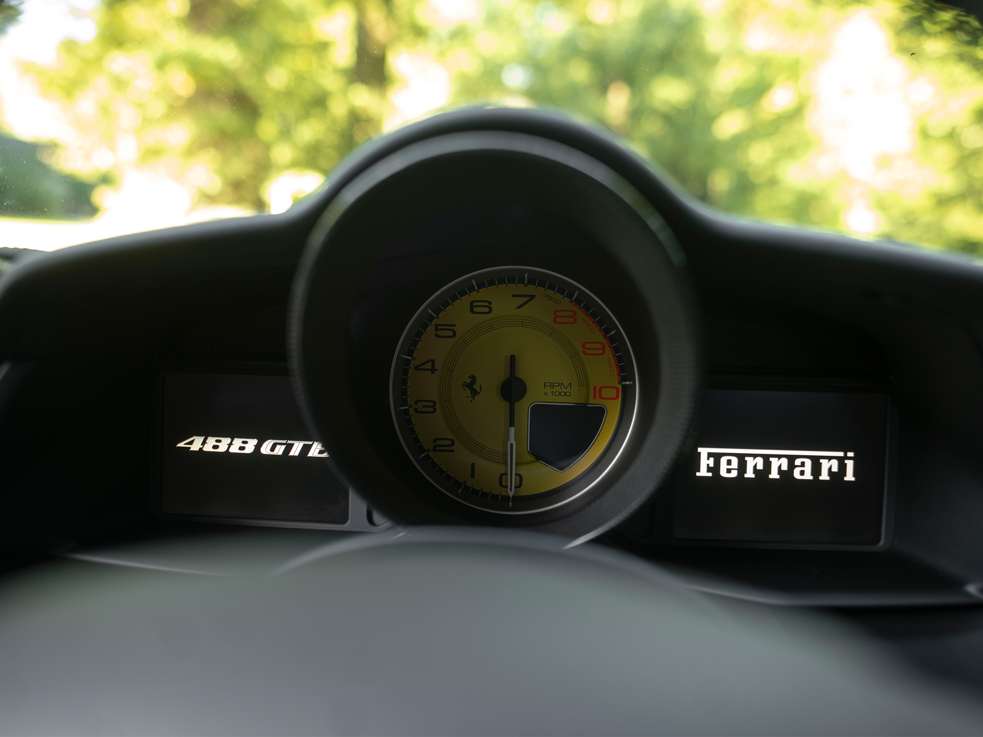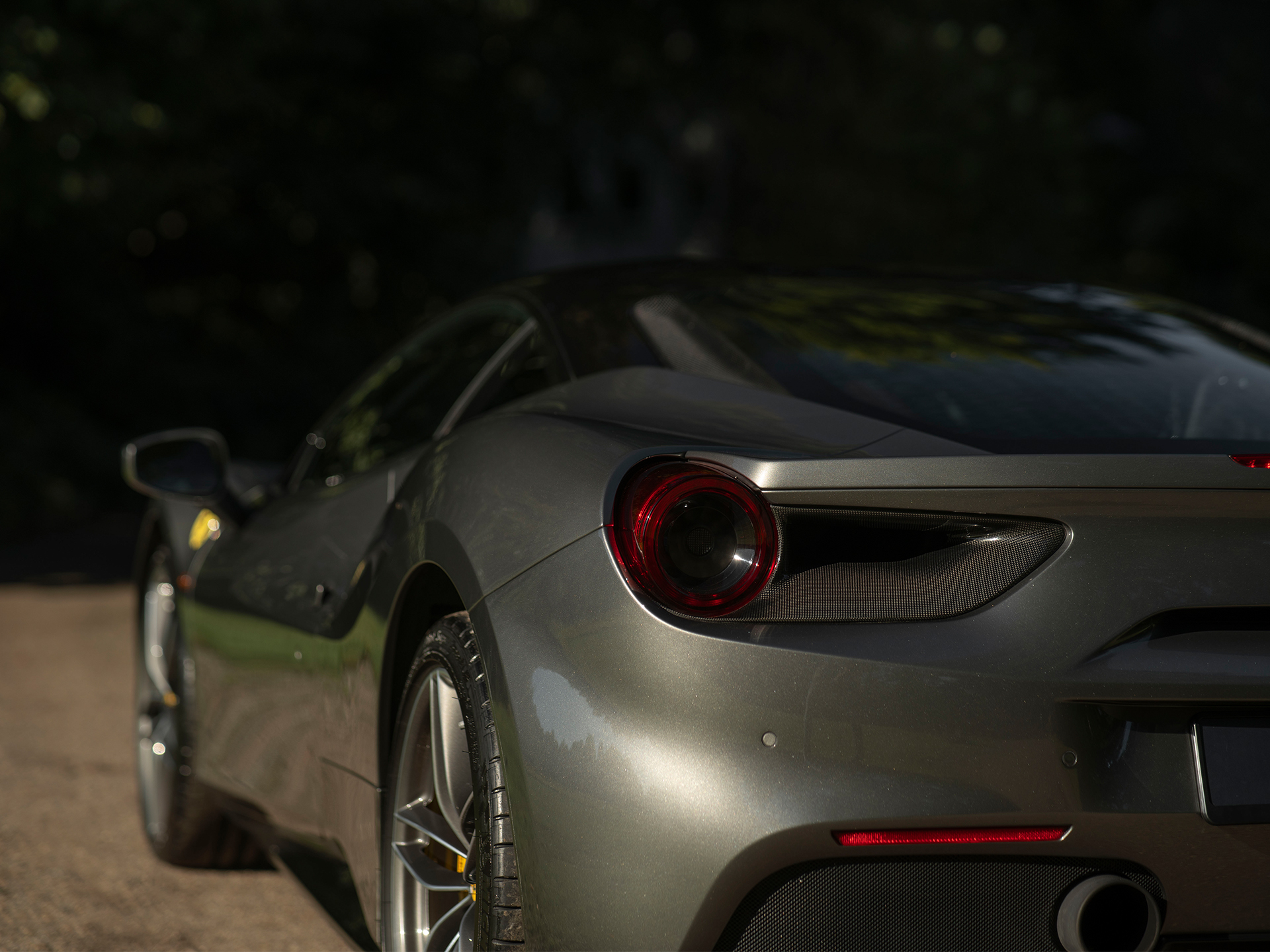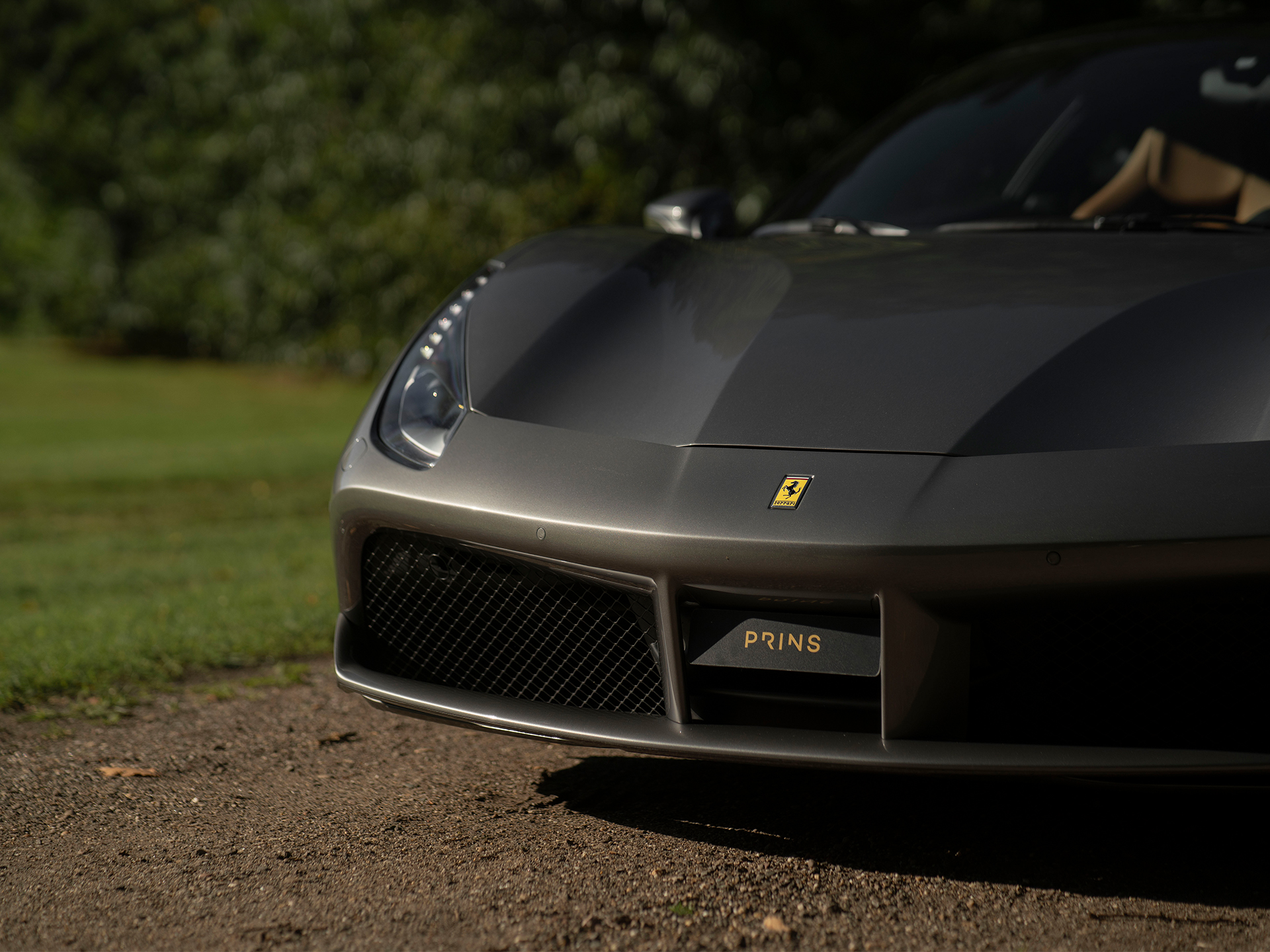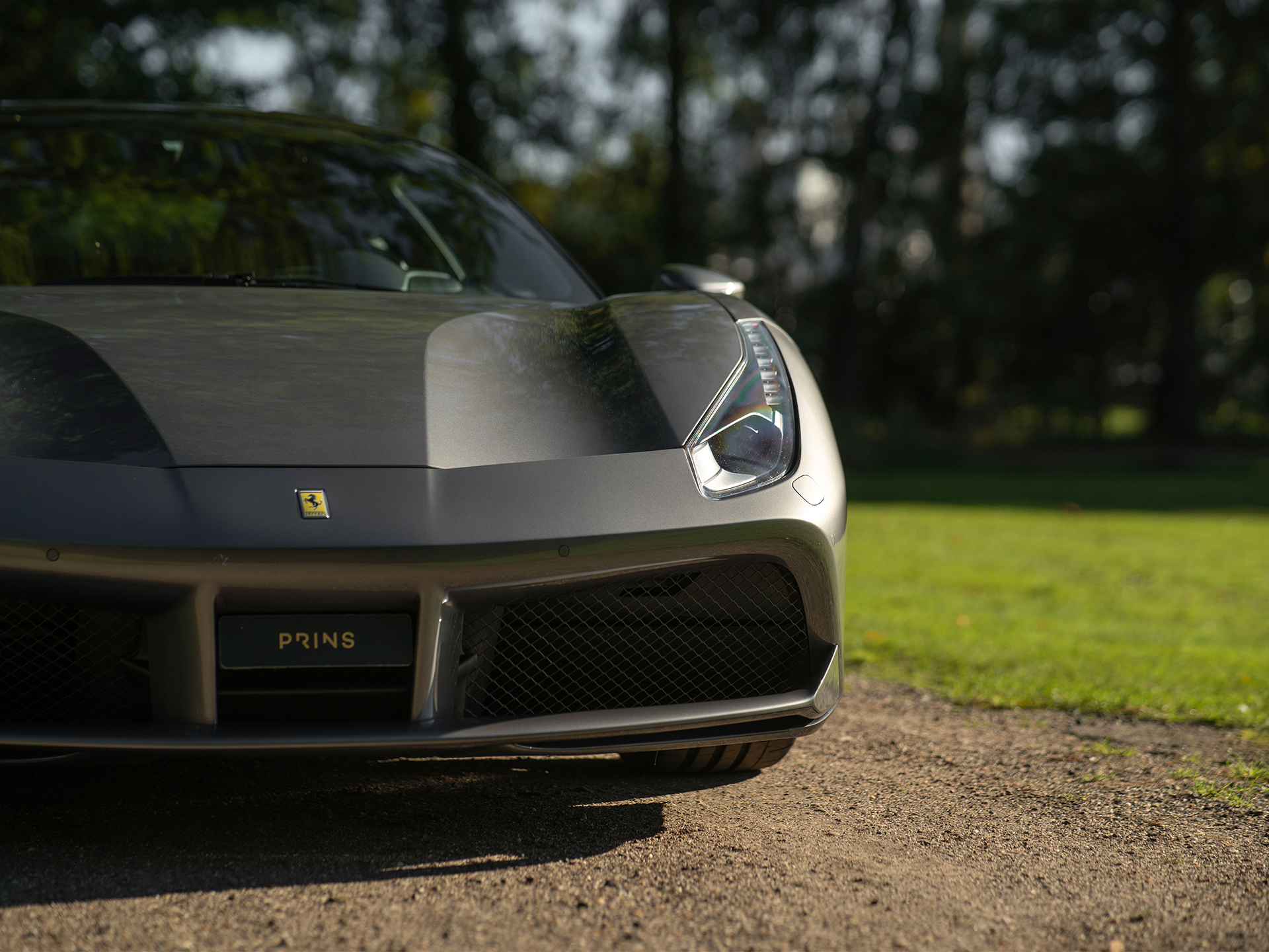 Ferrari staat symbool voor snelheid en emotie. En precies dat laatste is waar deze 488 GTB in uitblinkt. De beeldschone creatie laat zien dat een supercar niet altijd de beste of de snelste hoeft te zijn. Zolang het zijn ziel maar blootlegt. De grijze koets is niet zomaar grijs, het heet Grigio Ferro en is een Historical Color. Met andere woorden: er zit nogal een historisch verhaal achter de elegante tint. De meest exclusieve exoten uit Maranello kregen dezelfde kleur, waaronder de legendarische Ferrari 250 GT/L Berlinetta Lusso by Scaglietti, Ferrari 275 GTB 6C RHD, Ferrari 365 GTB/4 Daytona en Ferrari 330 GTC. Om maar even een illuster rijtje op te noemen… Onze Ferrari 488 GTB sluit zich daar moeiteloos bij aan. Niet in de laatste plaats vanwege de rest van de aankleding: voorzien van Atelier Special Equipment zijn de sideskirts, het dak én de engine compartment lid gespoten in Nero Daytona Lucido. Kennelijk vond de oorspronkelijke eigenaar extra ruimte voor exclusiviteit, want hij liet de engine cover en rear air-ducts uitvoeren in peperduur carbon. Verder staat de 458 Italia opvolger op 20 inch Forged Diamond wielen met daarachter Giallo remklauwen, en komt datzelfde geel terug in de Scuderia Ferrari Shields op de voorste schermen. Afgezien van de afwerking, zien de matzwarte uitlaateindstukken er hetzelfde uit als op elke andere 488. Echter, zo klinken ze niet…