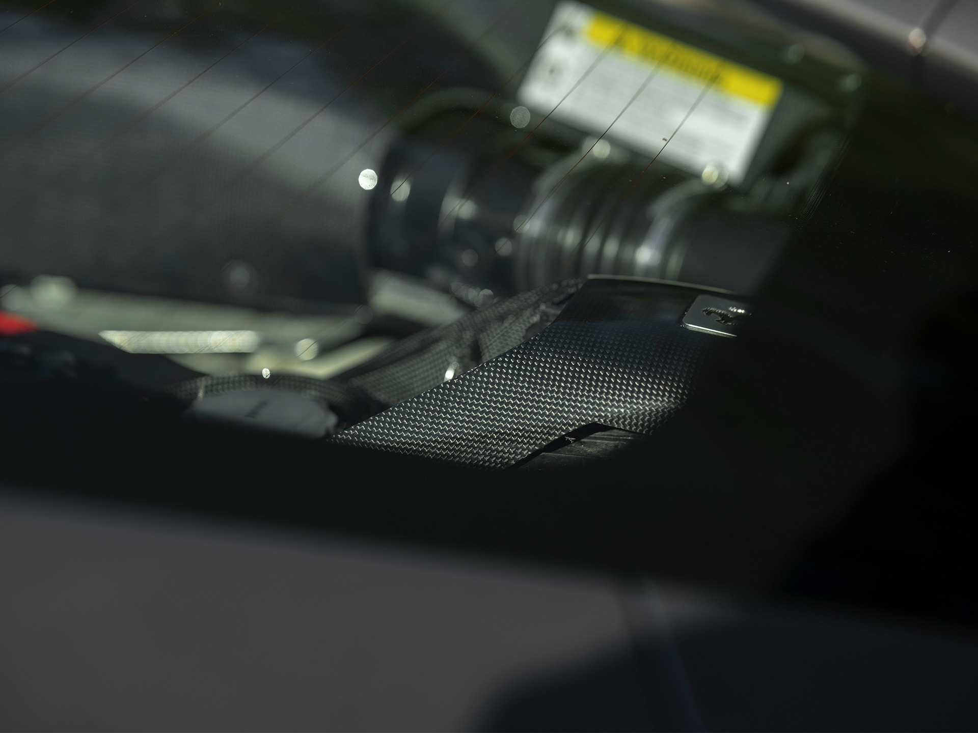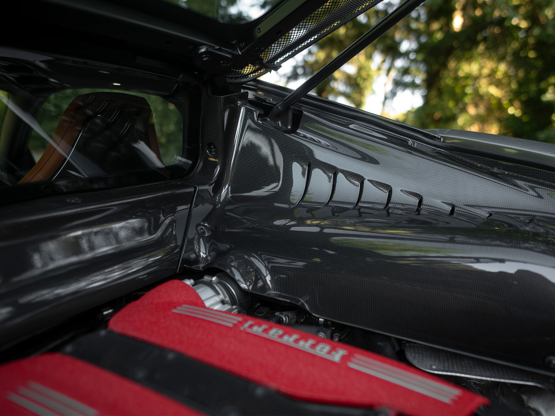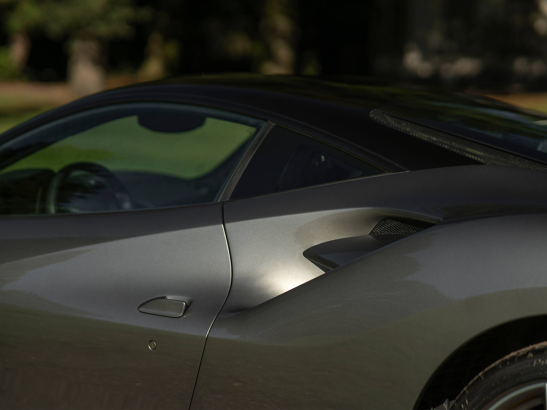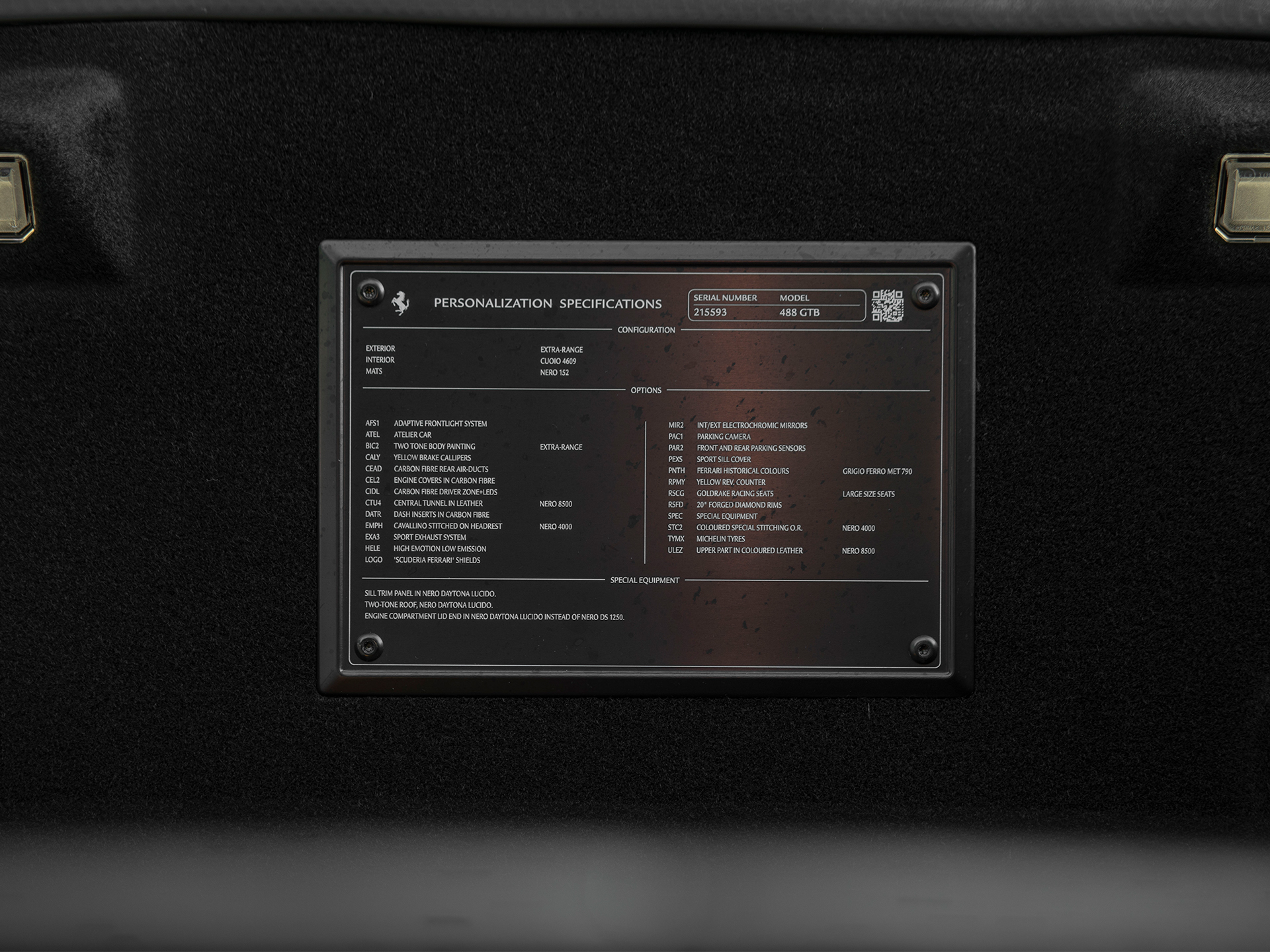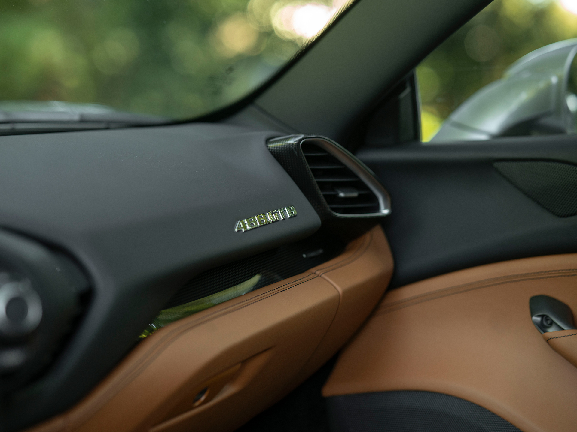 Ferrari staat symbool voor snelheid en emotie. En precies dat laatste is waar deze 488 GTB in uitblinkt. De beeldschone creatie laat zien dat een supercar niet altijd de beste of de snelste hoeft te zijn. Zolang het zijn ziel maar blootlegt. De grijze koets is niet zomaar grijs, het heet Grigio Ferro en is een Historical Color. Met andere woorden: er zit nogal een historisch verhaal achter de elegante tint. De meest exclusieve exoten uit Maranello kregen dezelfde kleur, waaronder de legendarische Ferrari 250 GT/L Berlinetta Lusso by Scaglietti, Ferrari 275 GTB 6C RHD, Ferrari 365 GTB/4 Daytona en Ferrari 330 GTC. Om maar even een illuster rijtje op te noemen… Onze Ferrari 488 GTB sluit zich daar moeiteloos bij aan. Niet in de laatste plaats vanwege de rest van de aankleding: voorzien van Atelier Special Equipment zijn de sideskirts, het dak én de engine compartment lid gespoten in Nero Daytona Lucido. Kennelijk vond de oorspronkelijke eigenaar extra ruimte voor exclusiviteit, want hij liet de engine cover en rear air-ducts uitvoeren in peperduur carbon. Verder staat de 458 Italia opvolger op 20 inch Forged Diamond wielen met daarachter Giallo remklauwen, en komt datzelfde geel terug in de Scuderia Ferrari Shields op de voorste schermen. Afgezien van de afwerking, zien de matzwarte uitlaateindstukken er hetzelfde uit als op elke andere 488. Echter, zo klinken ze niet…